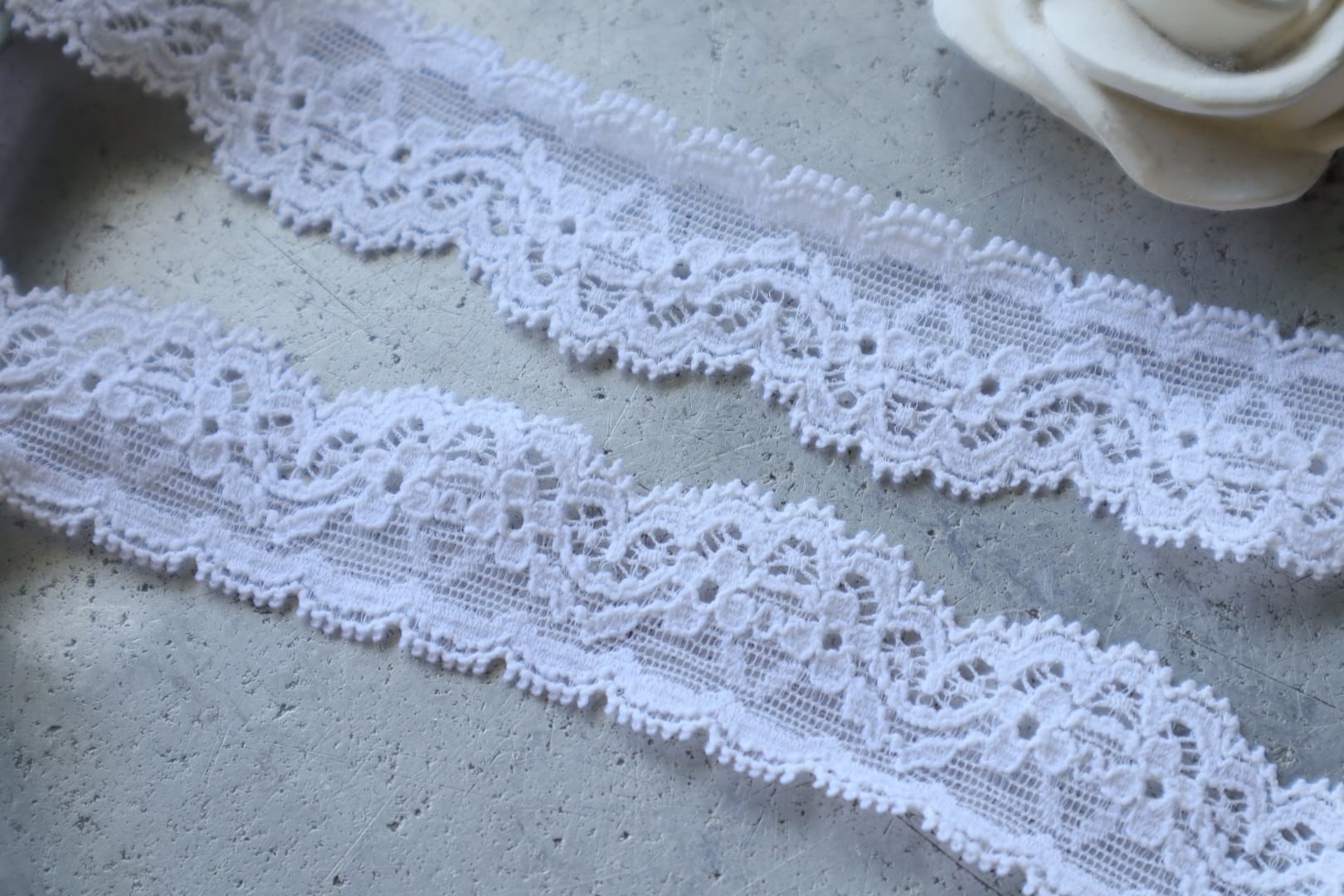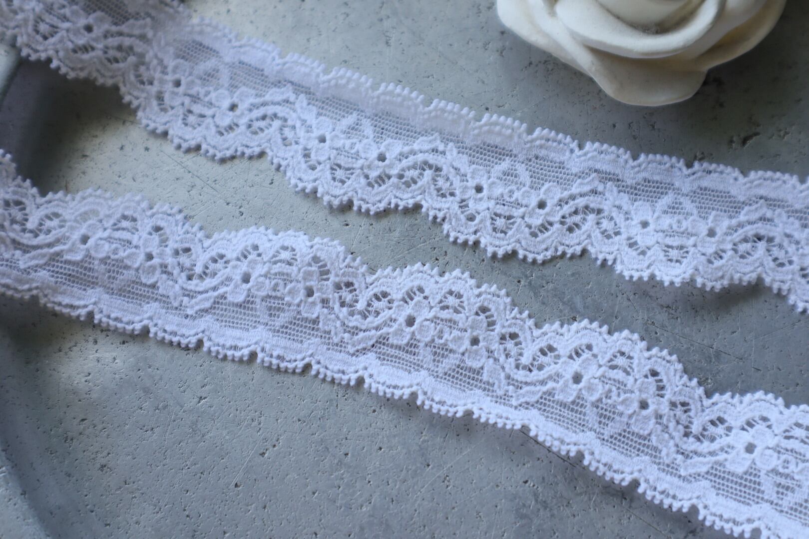 クラシカルな花模様デザインとスカラップの縁取りが可愛らしい素敵なナイロンレース