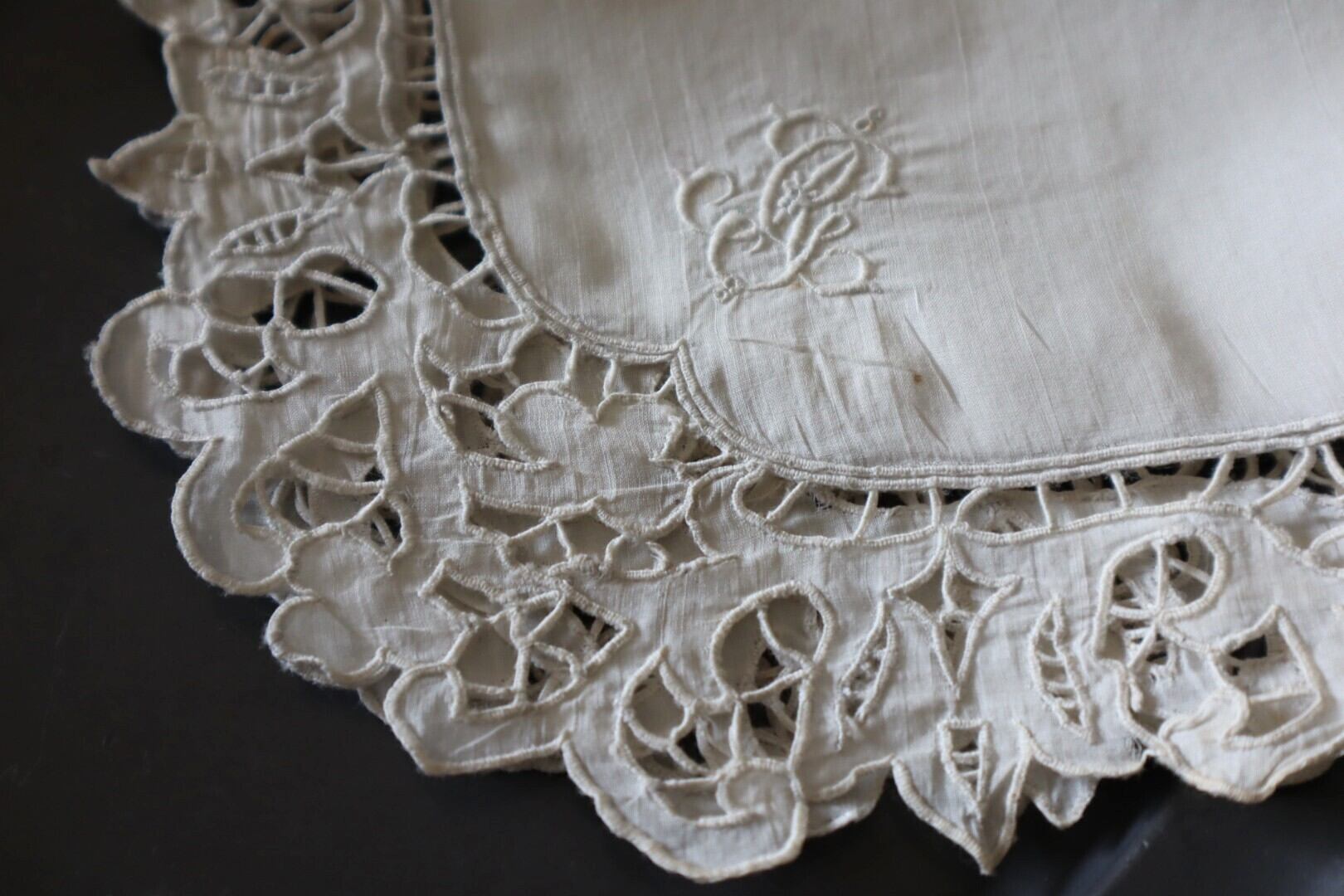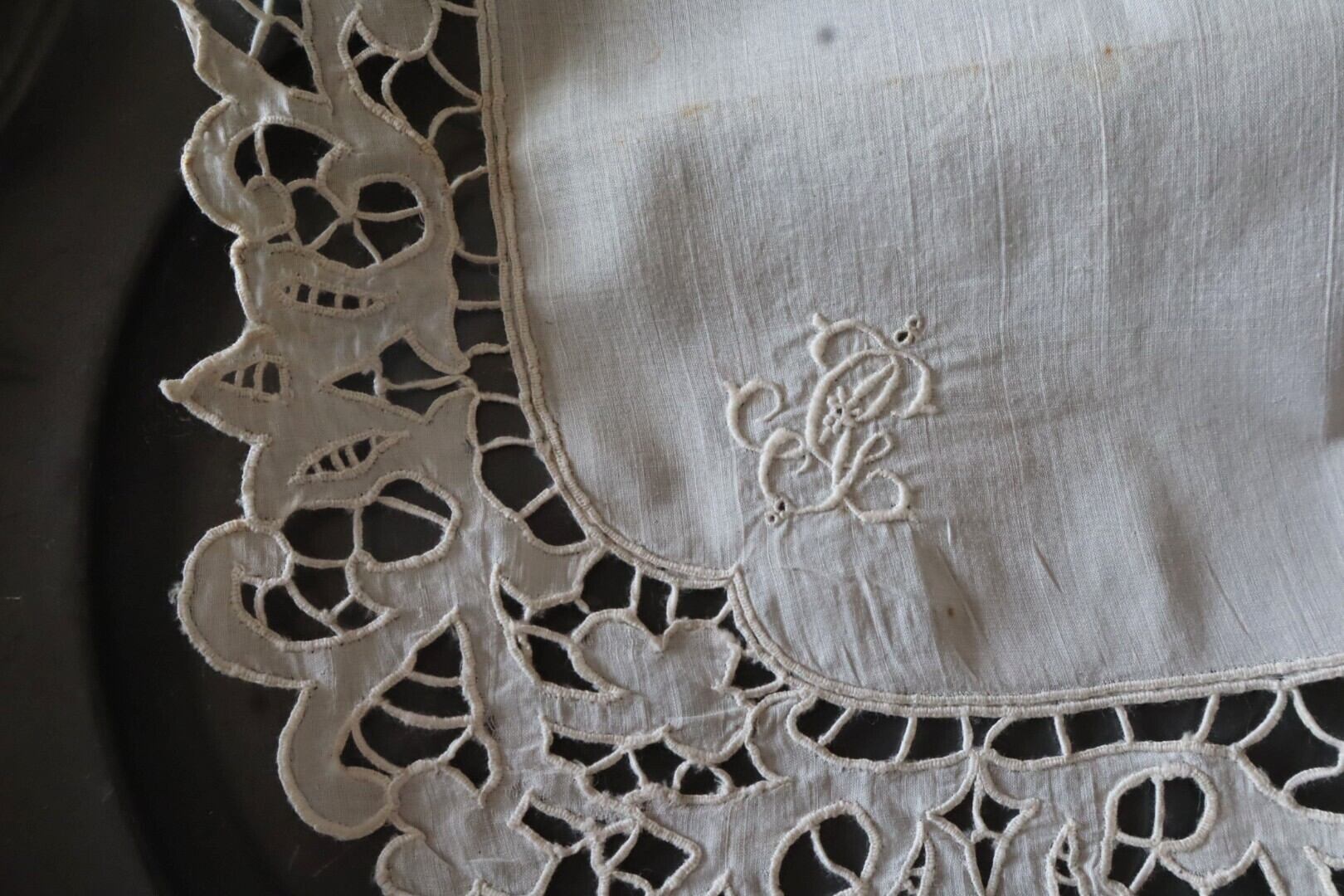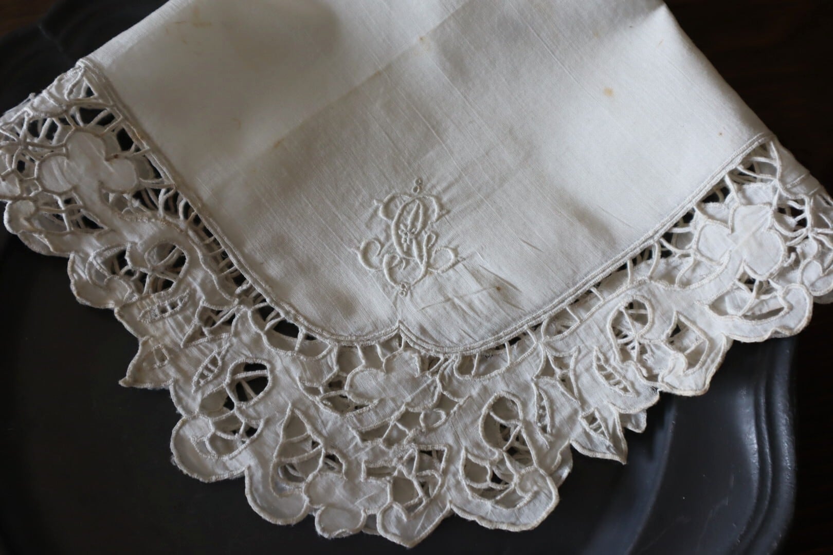 France製 30㎝ アンティークレースハンカチ B936 オフホワイト