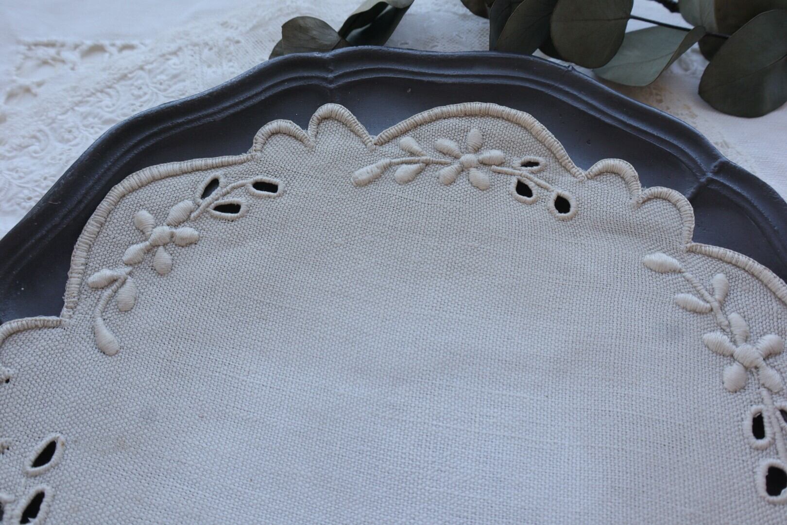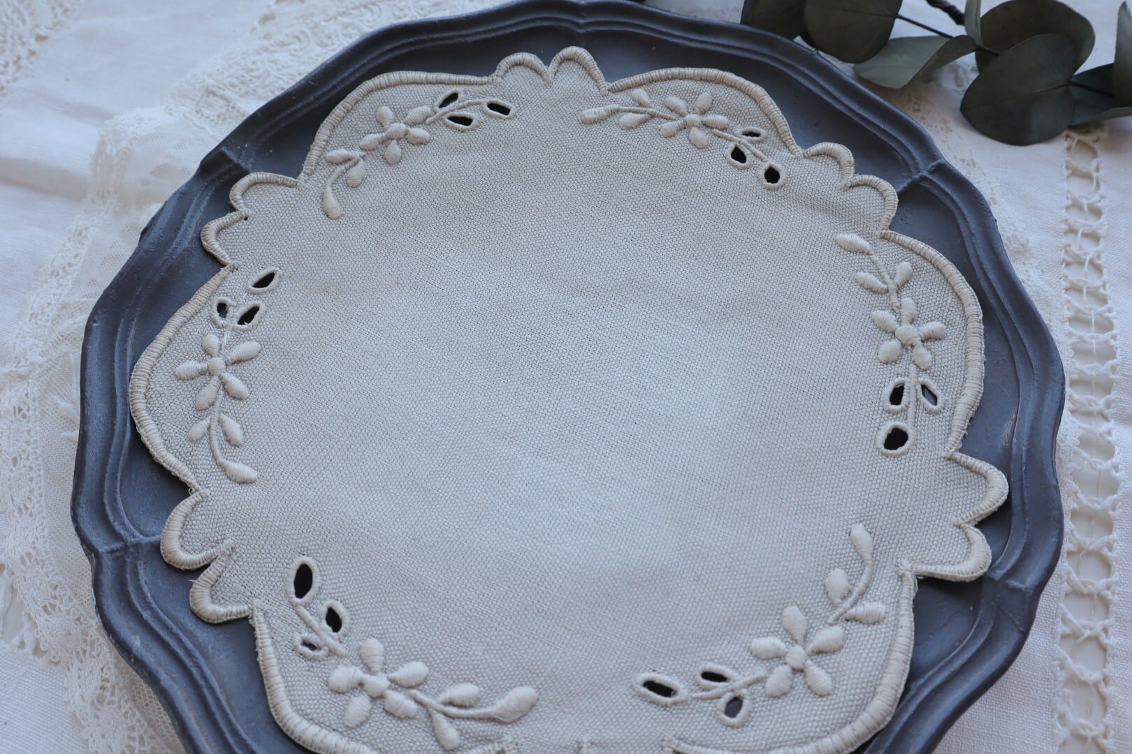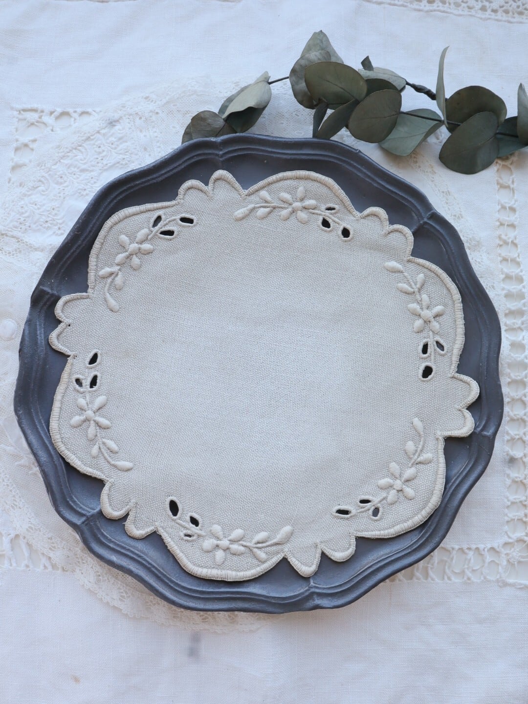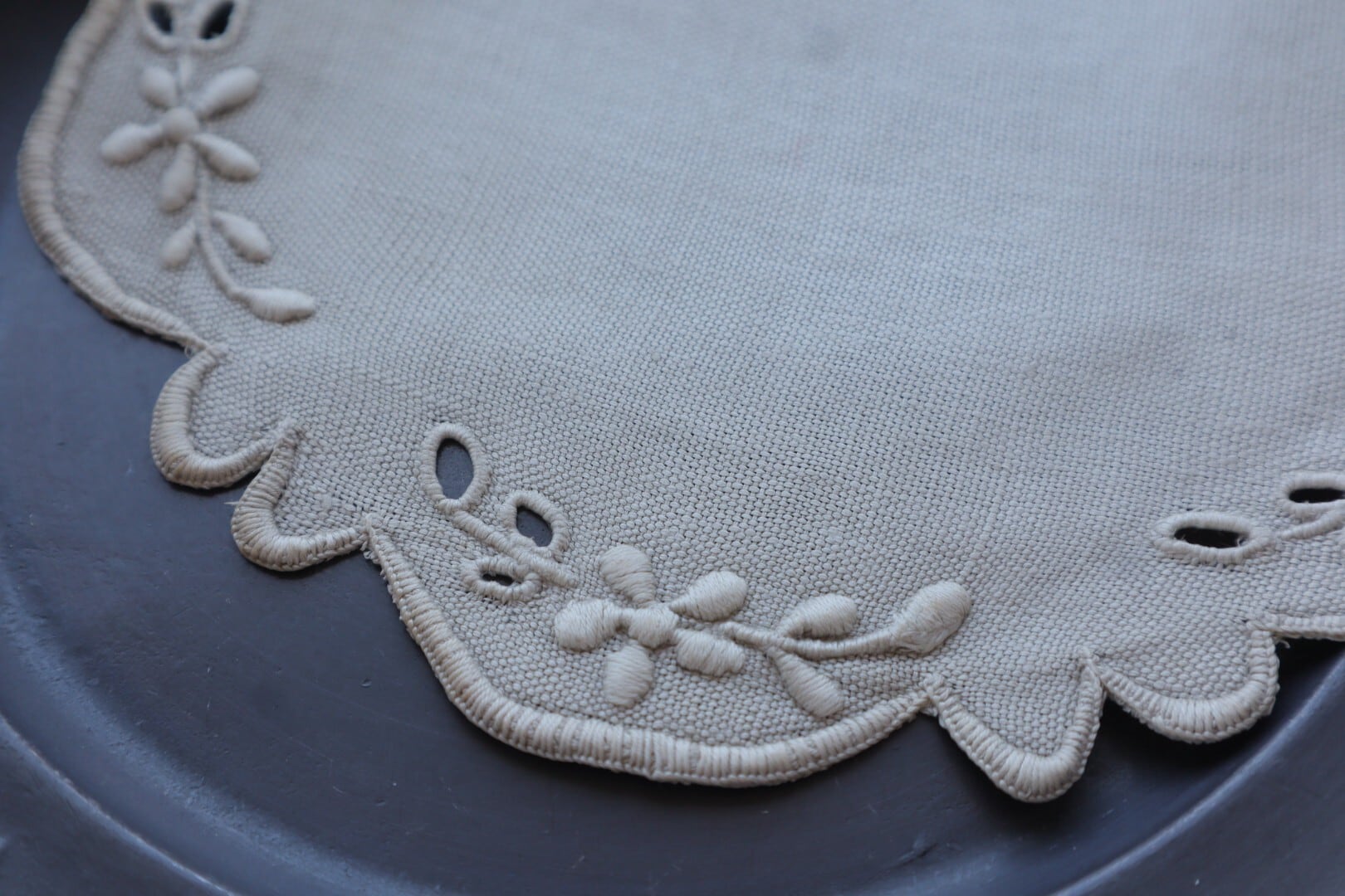 France製 19㎝ アンティーク刺繍ドイリー B927 生成り