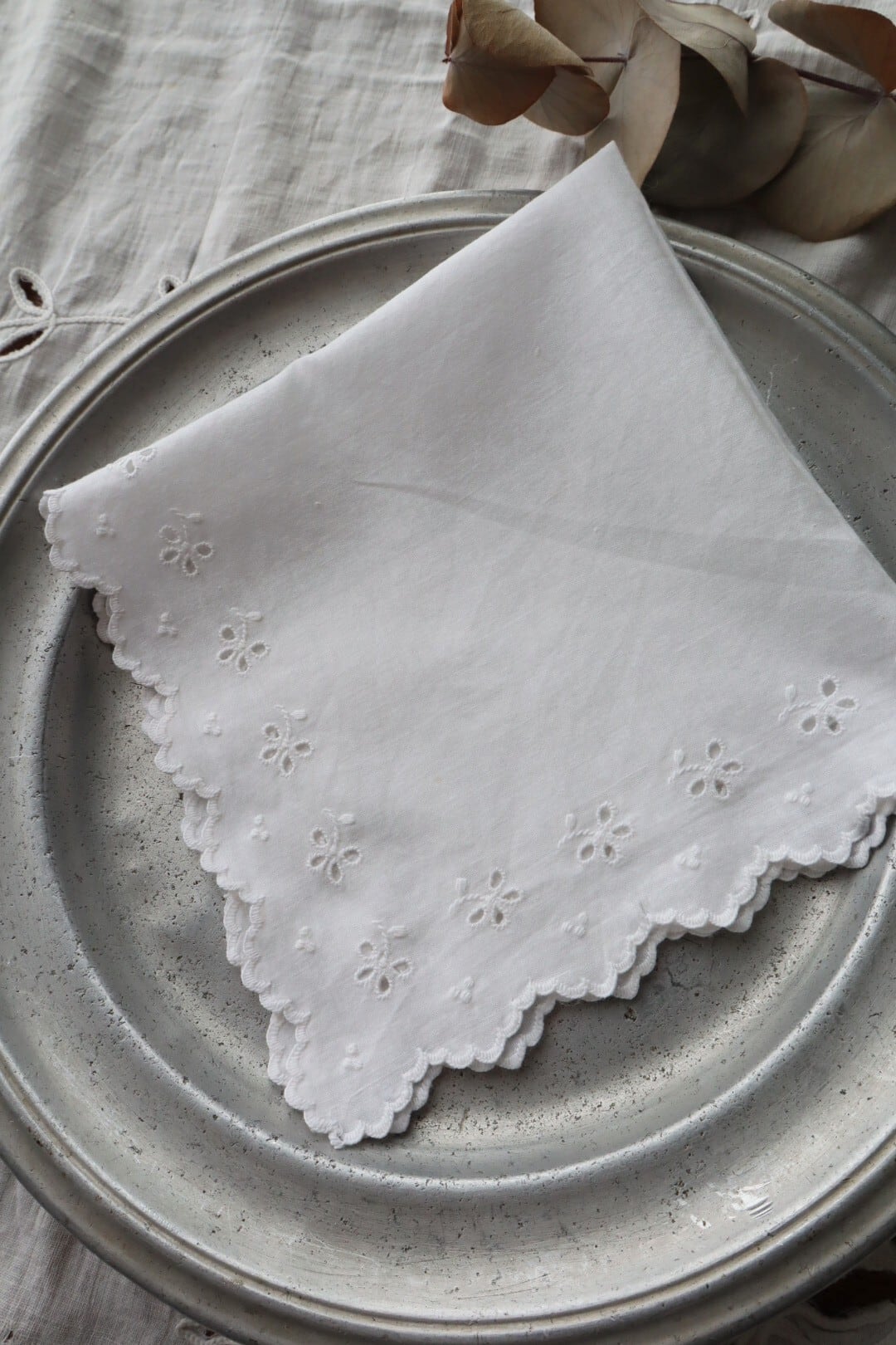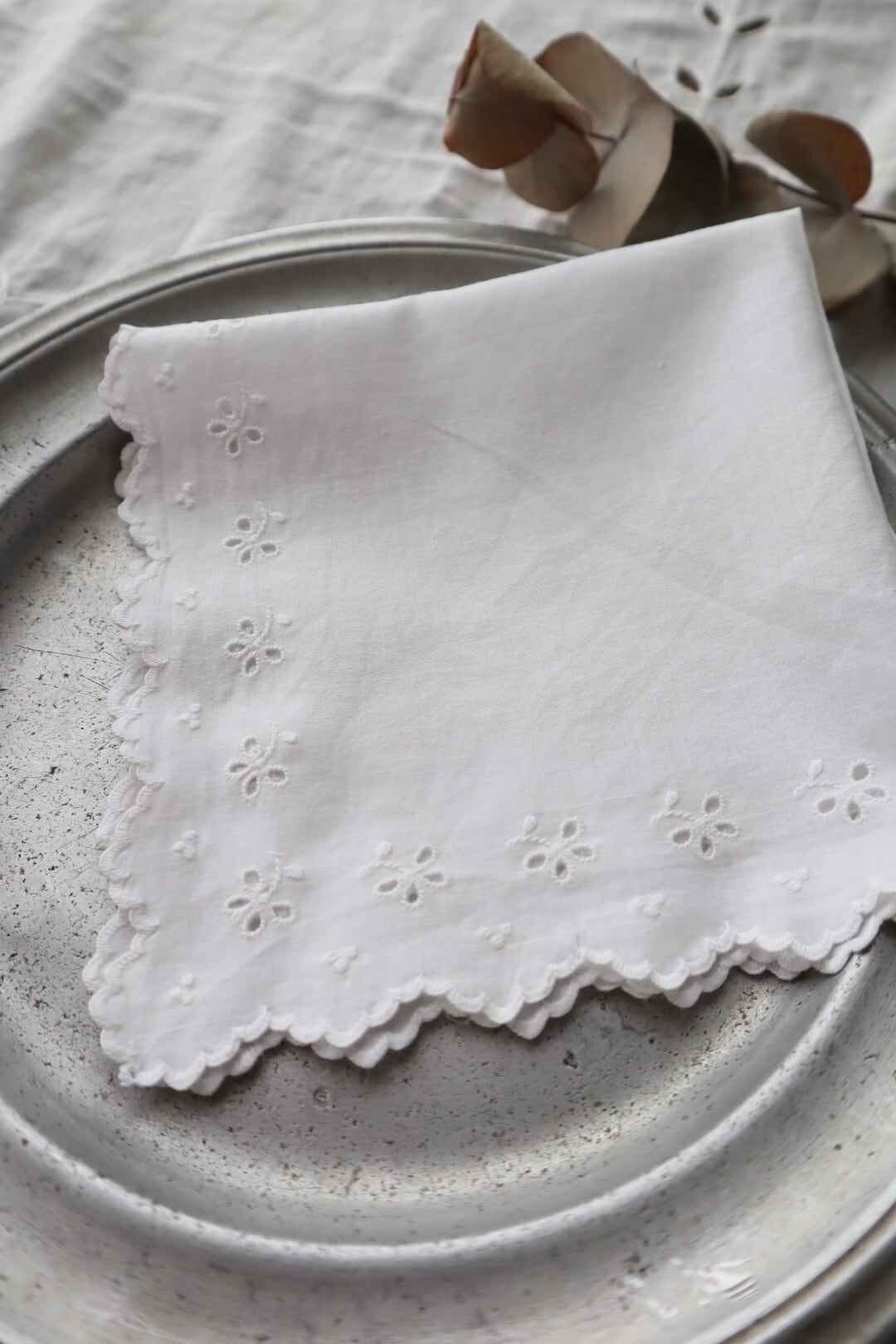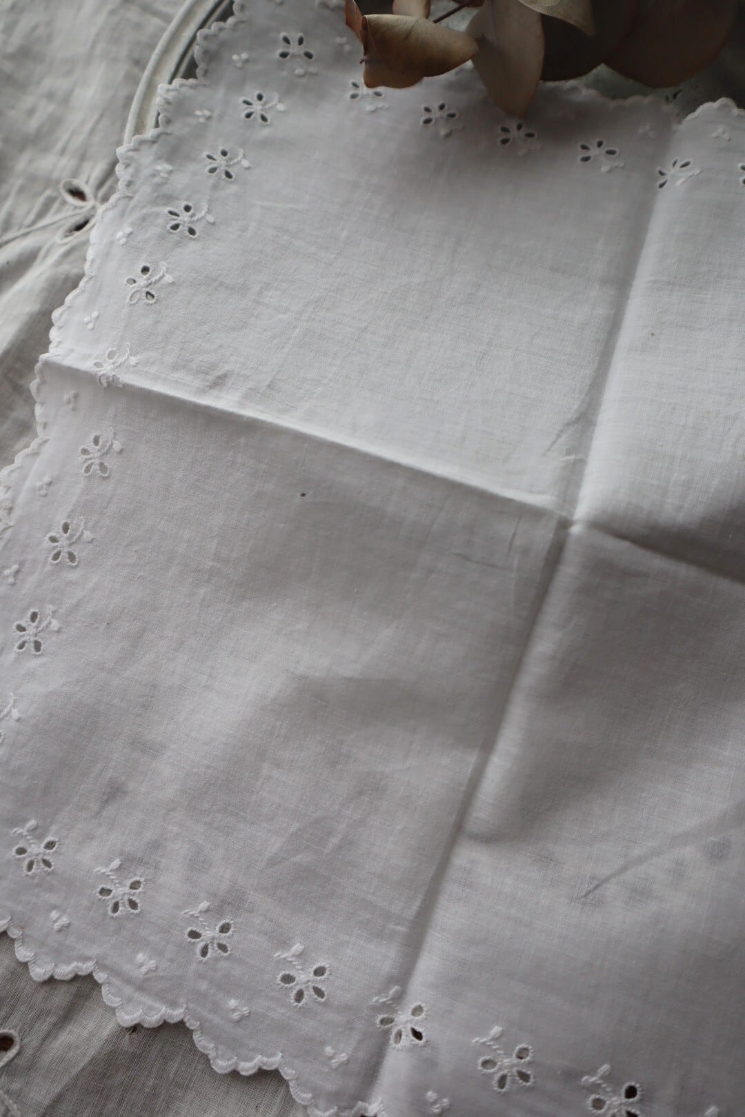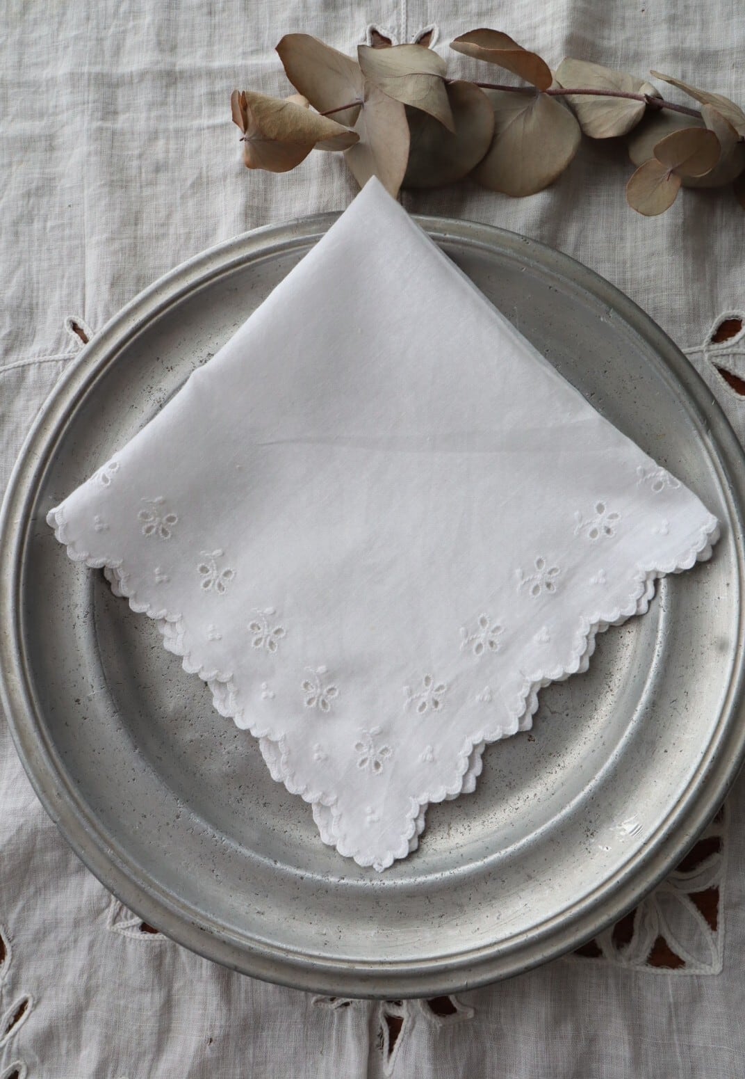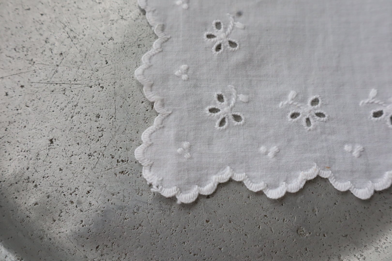 France製 30㎝ アンティーク手刺繍ハンカチ B952 ホワイト