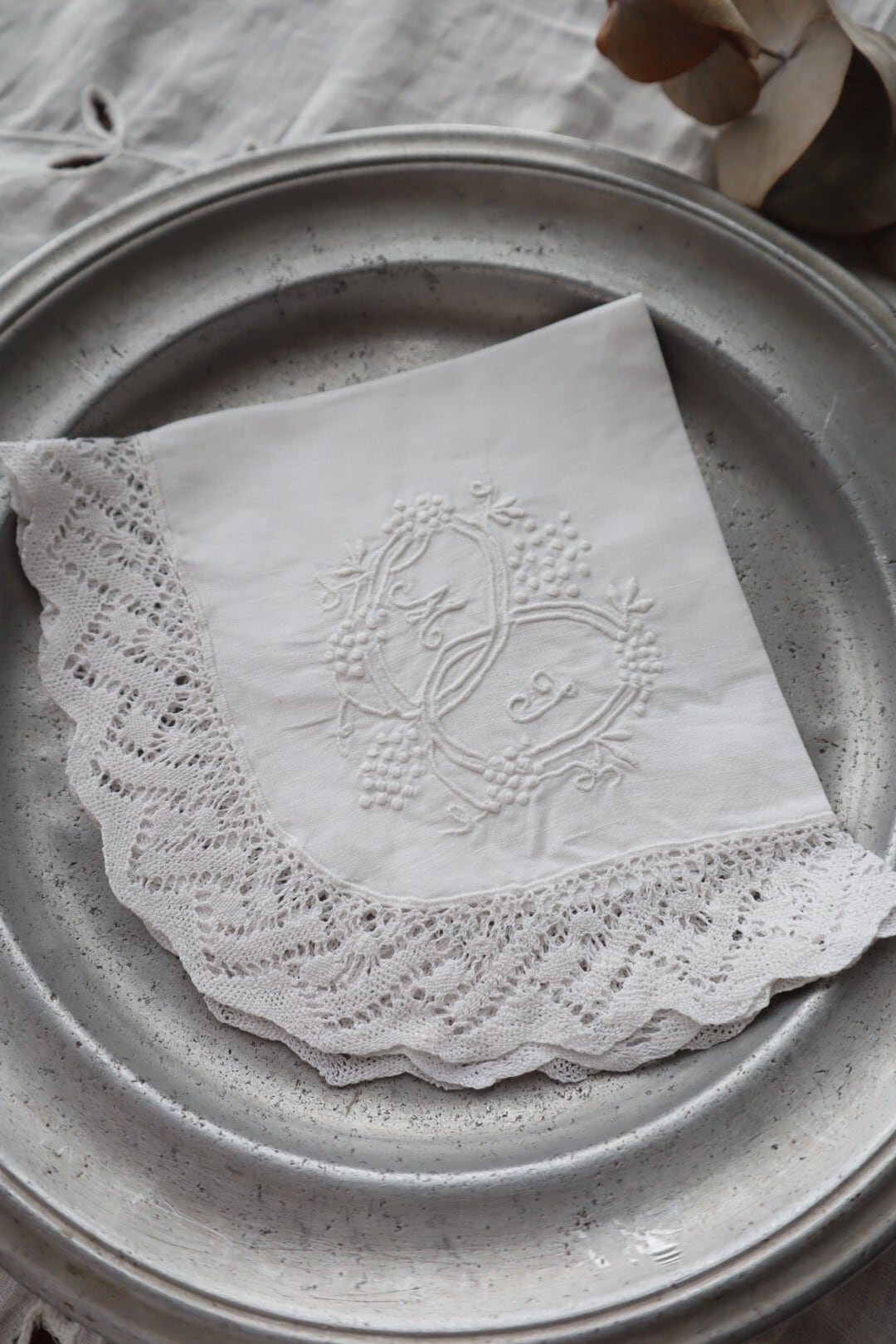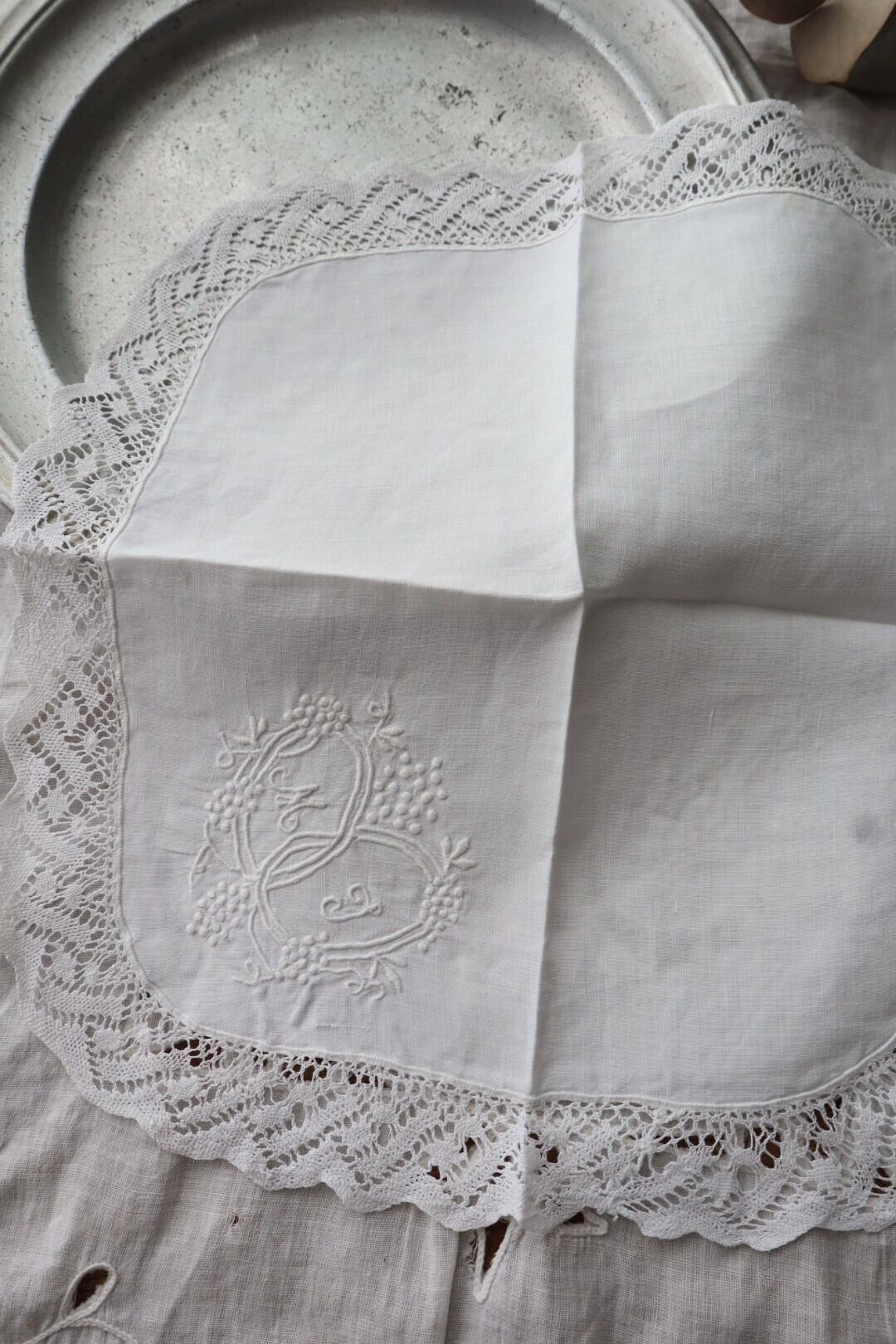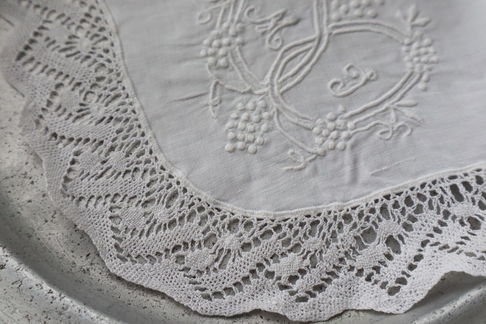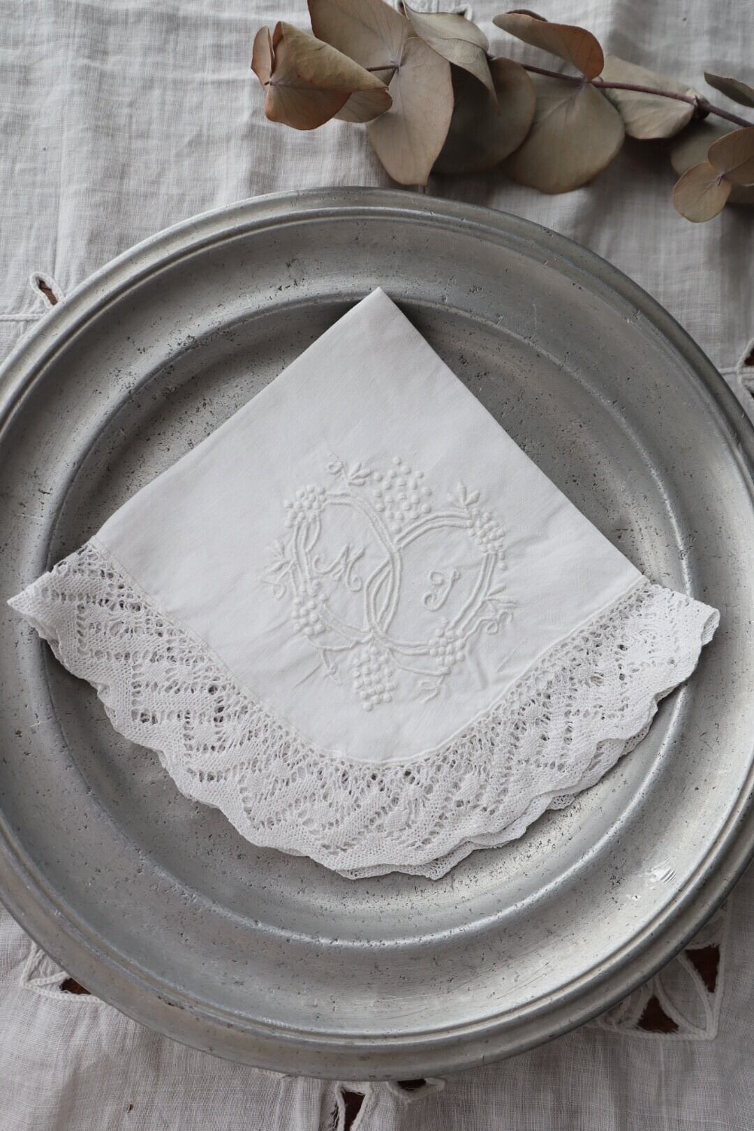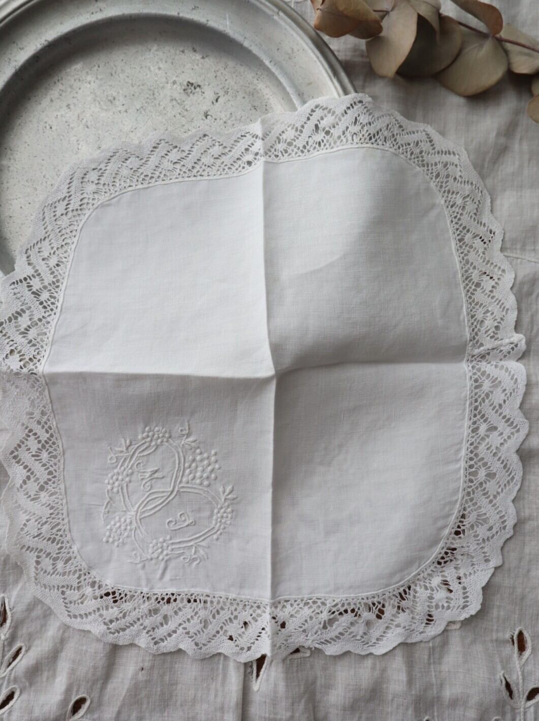 France製 28㎝ アンティークレース刺繍ハンカチ B951 ホワイト