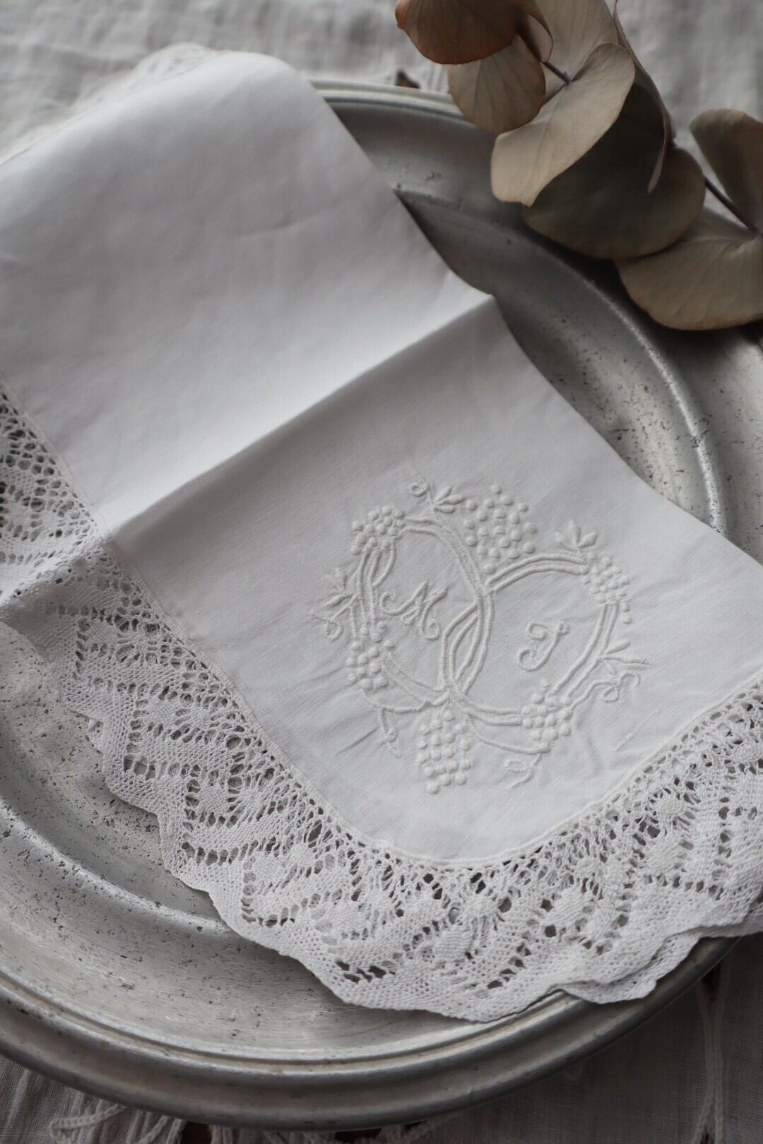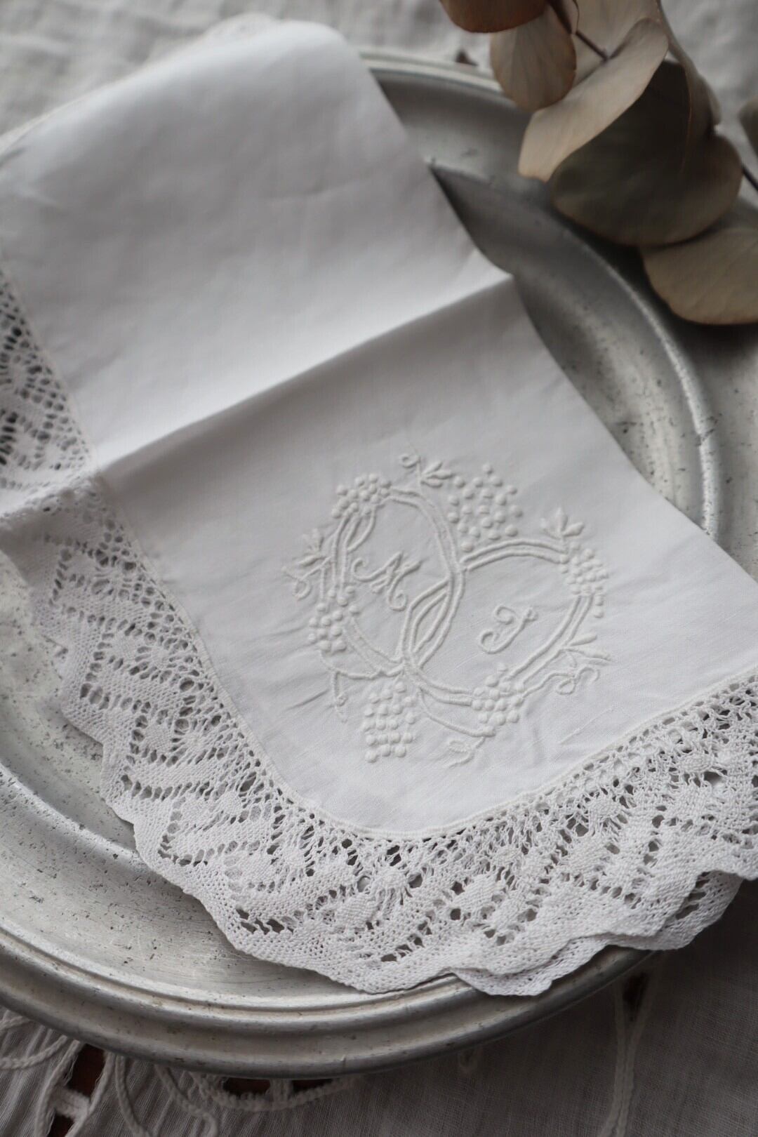 ハート型のような素敵なイニシャル刺繍が施されております。手刺繍。