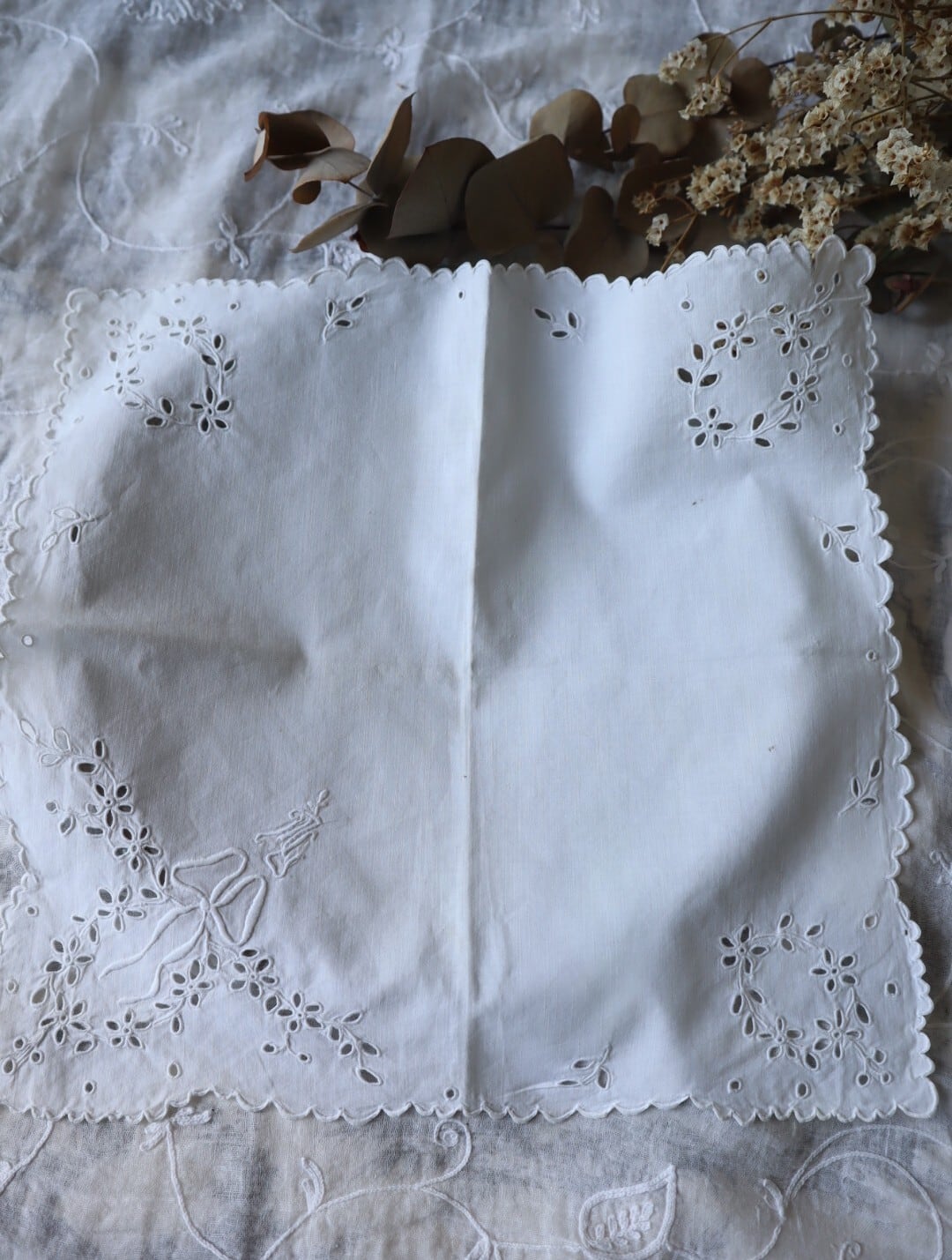 France製 29㎝ アンティークカットワーク刺繍ハンカチ B953 ホワイト