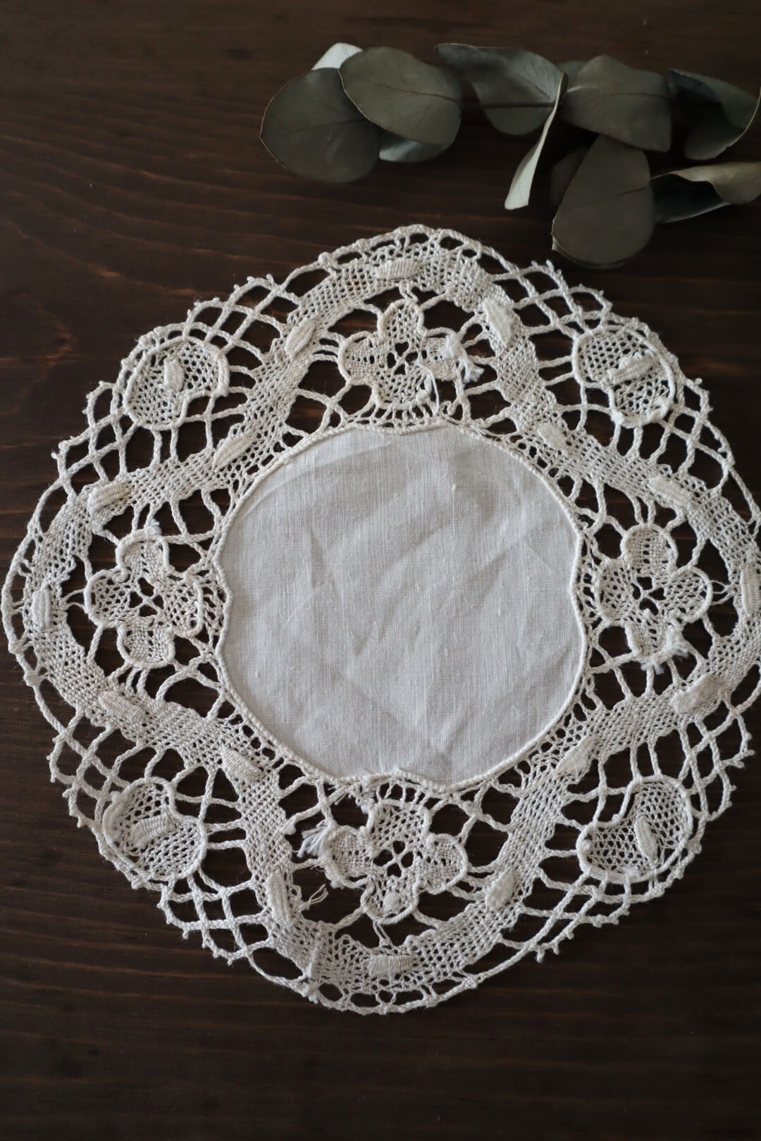 リネン地にクロッシェレースをあしらった丸形ドイリーです。
