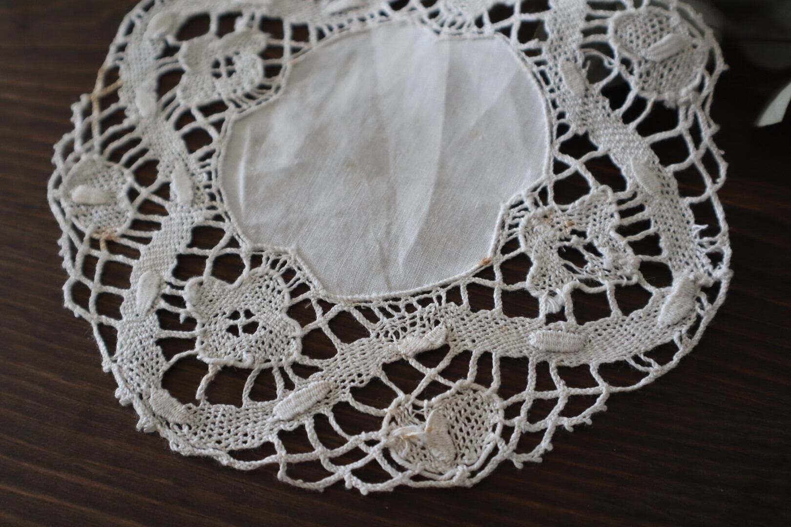 リネン地にクロッシェレースをあしらった丸形ドイリーです。