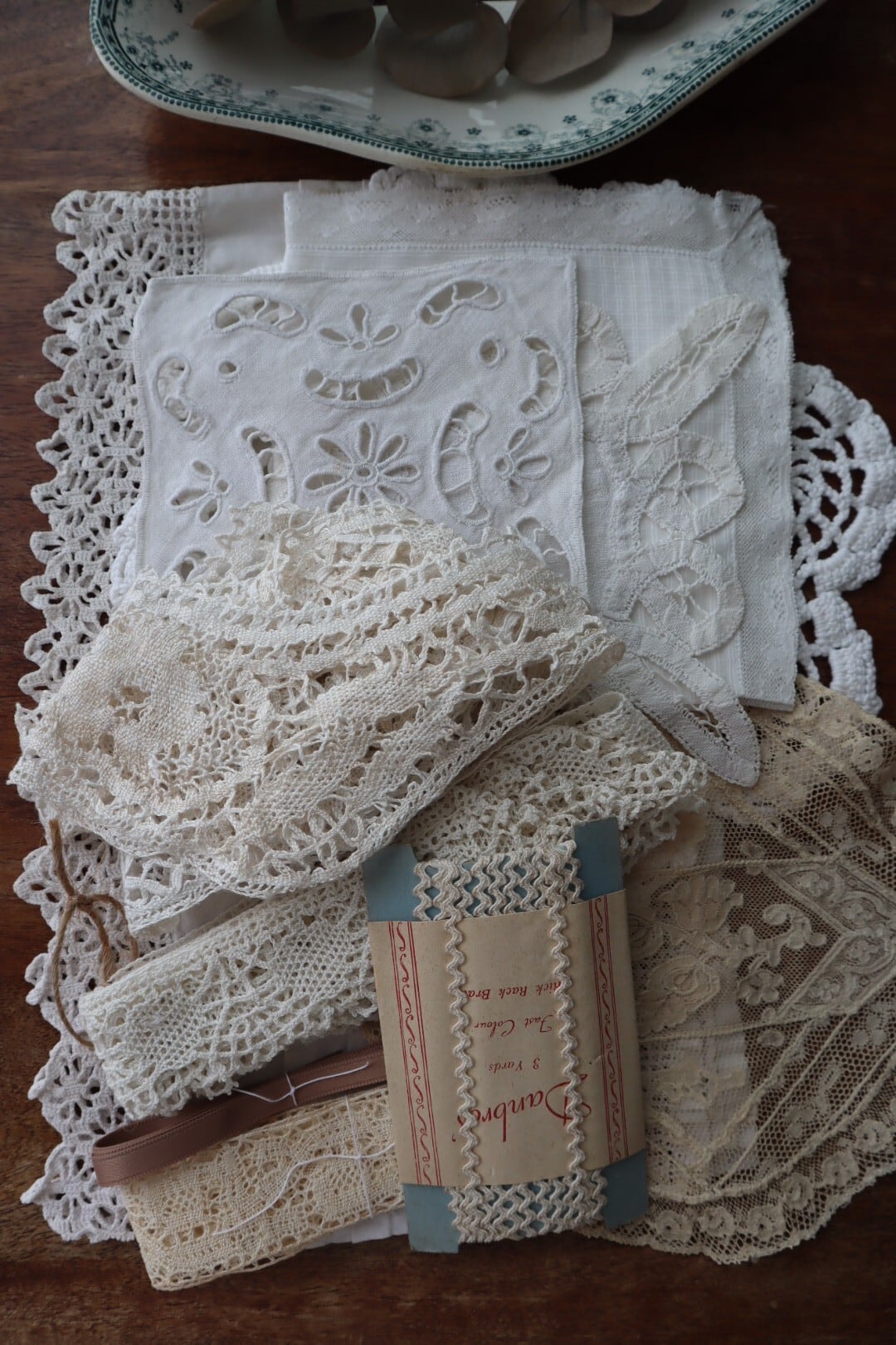 レース付きリネン地、ドイリー、ハンカチなどのセット