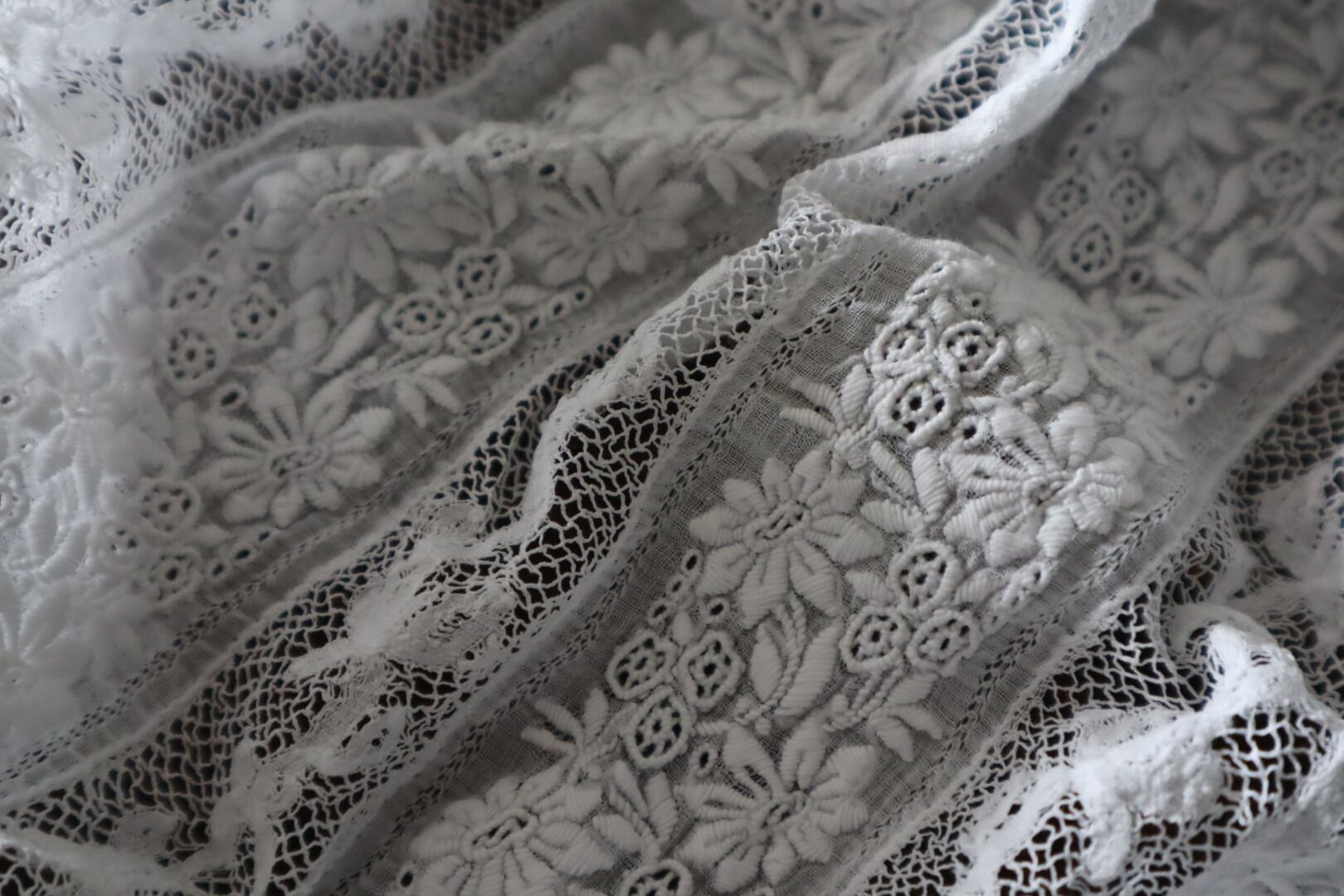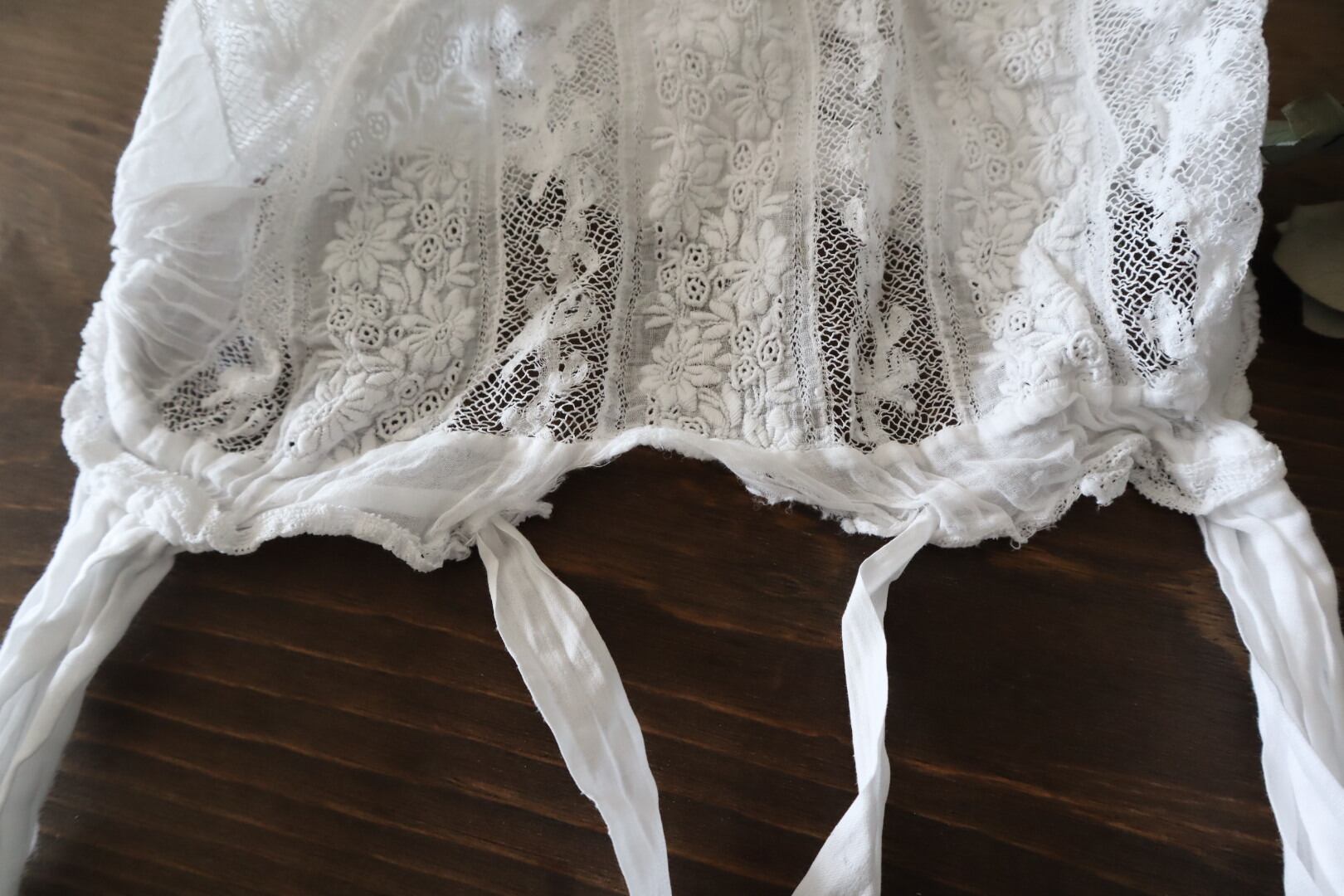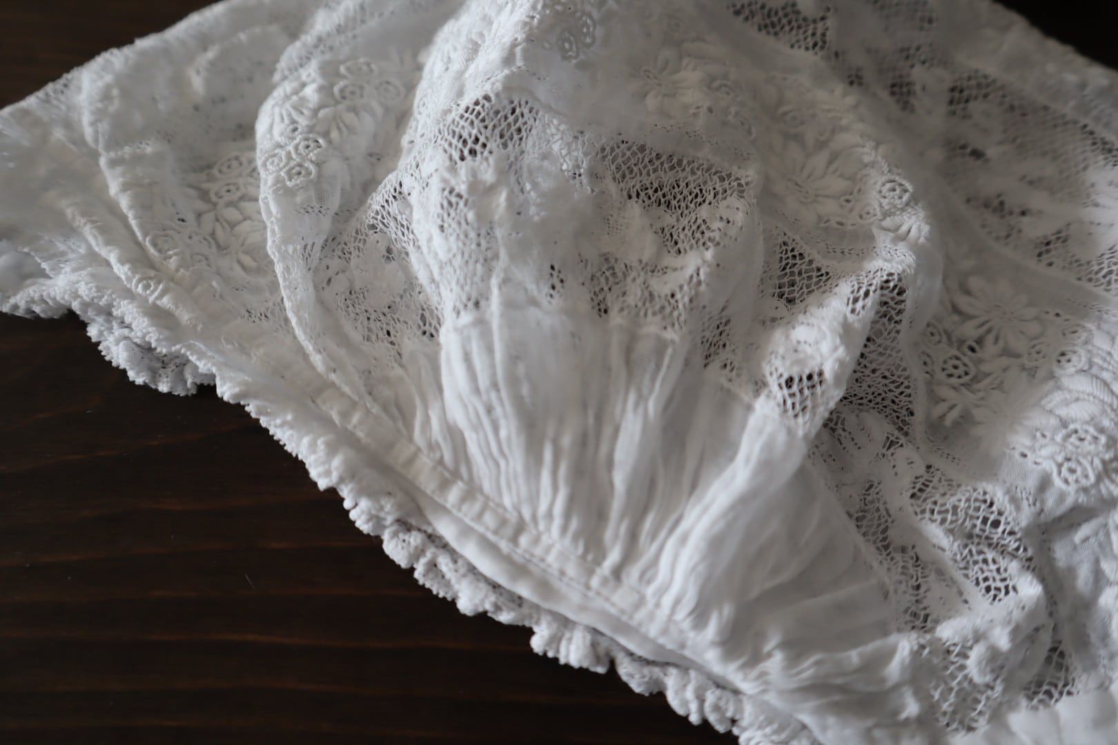 手刺繍や手縫いのレースが贅沢に施されている素敵なアンティークボネ