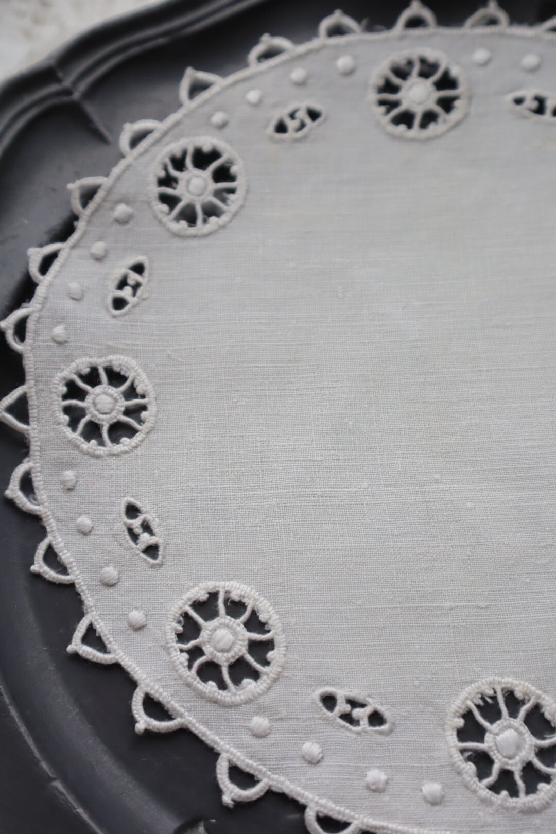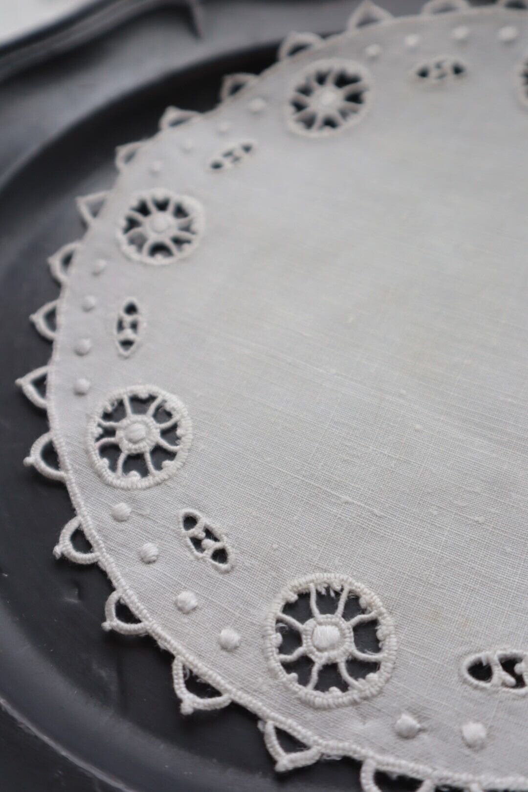 カットワーク刺繍と可愛い縁取りを楽しめる丸形ドイリーです。