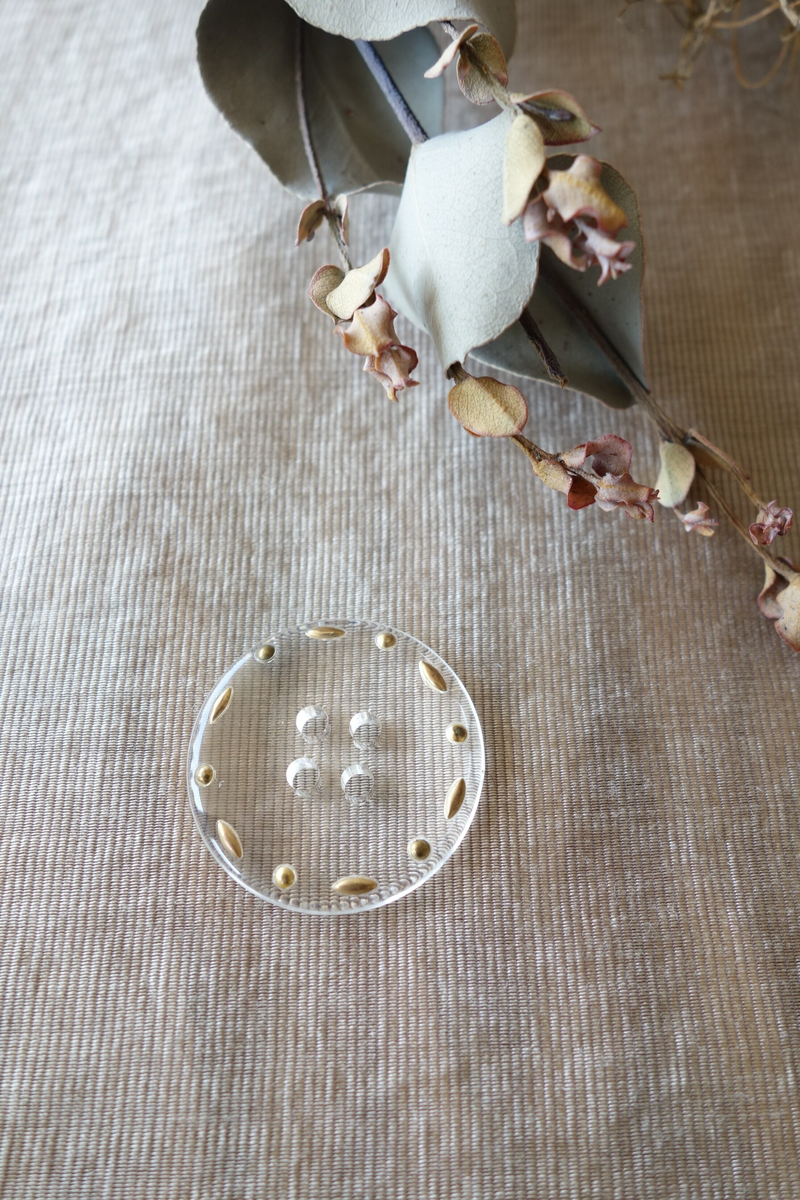 丸型クリアの縁にはゴールドのステッチ