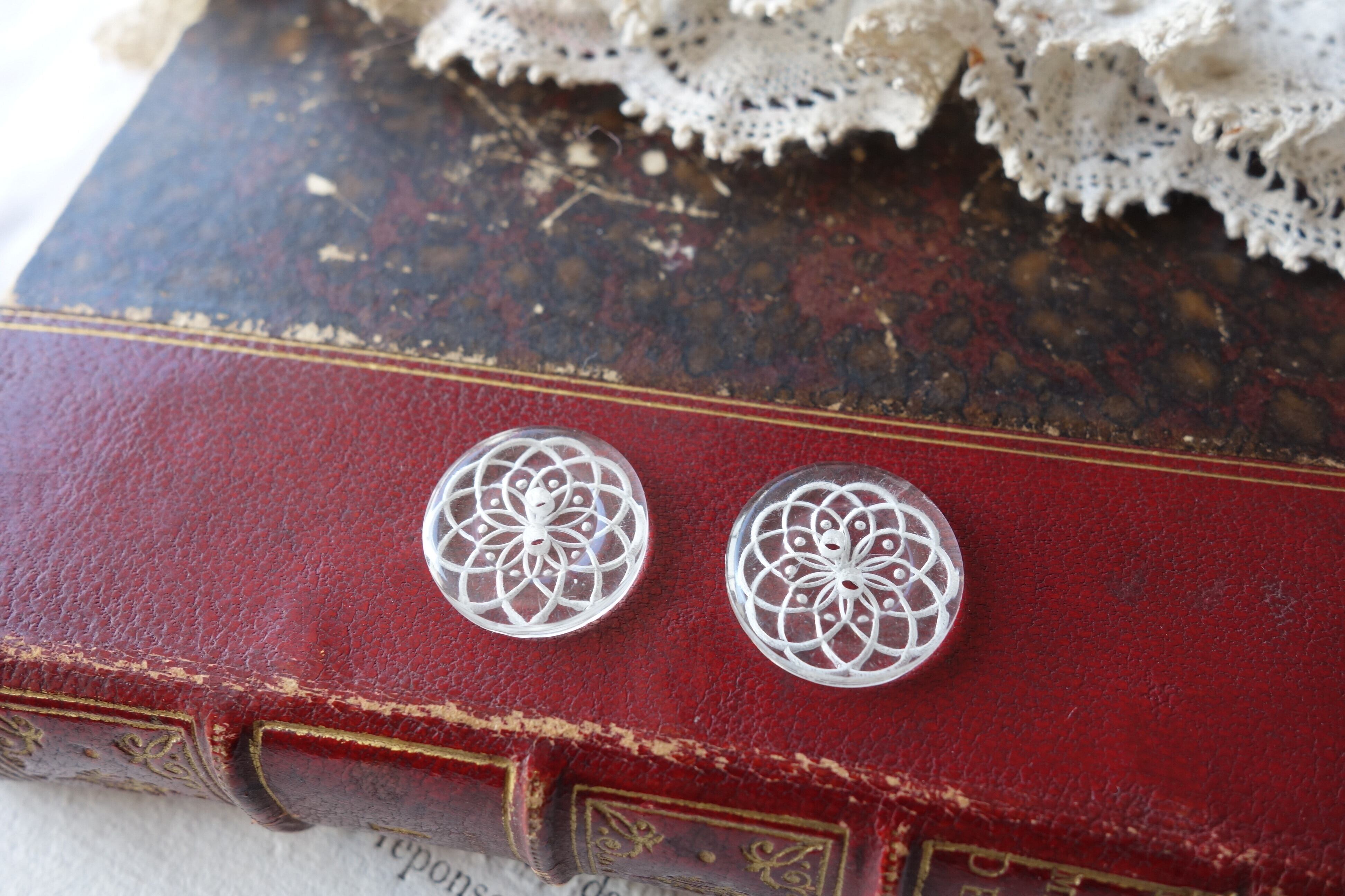 クリアボタンの裏側いっぱいに刻まれたフラワーモチーフ