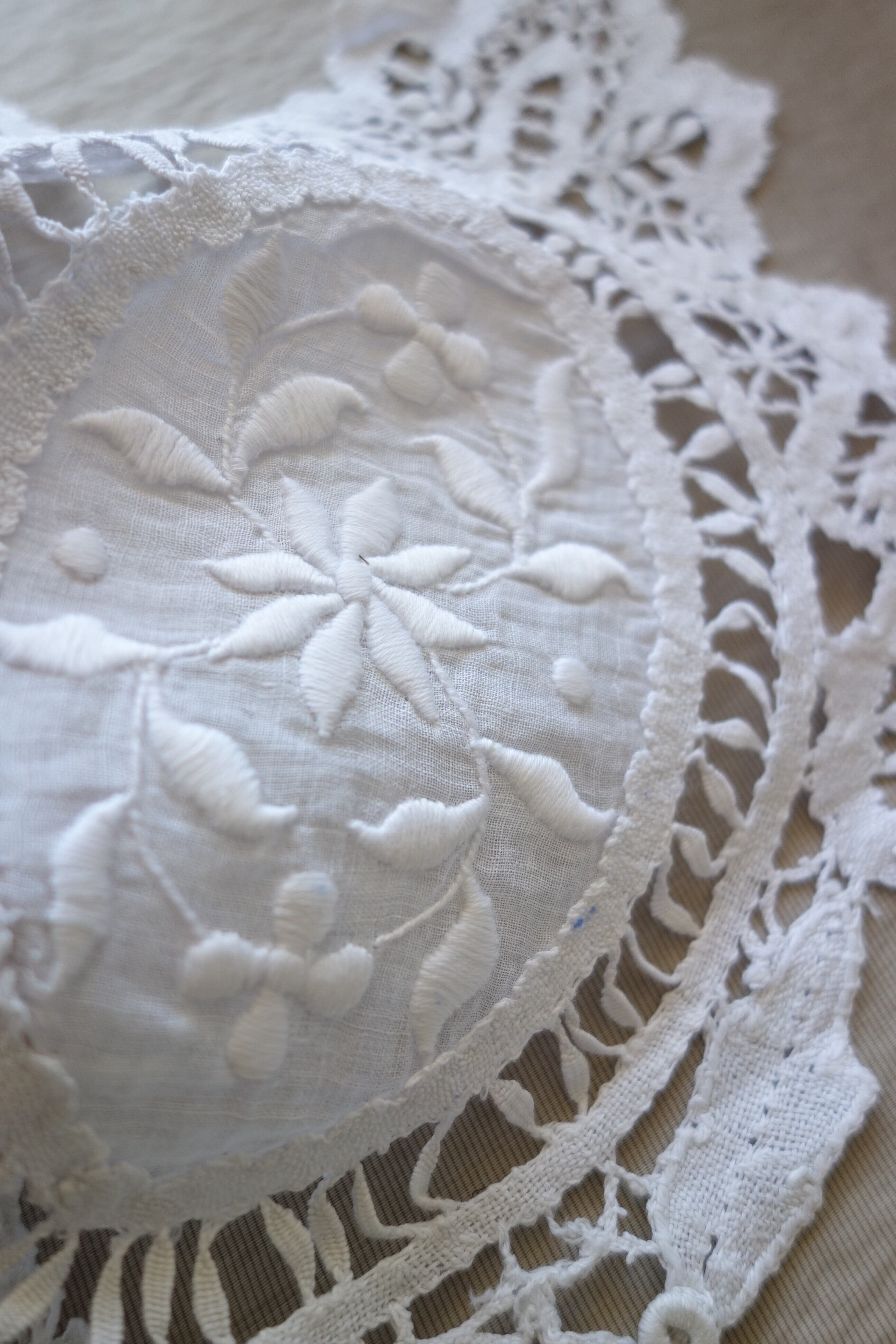 中央の手刺繍のモチーフとボビンレースを組み合わせたものです。