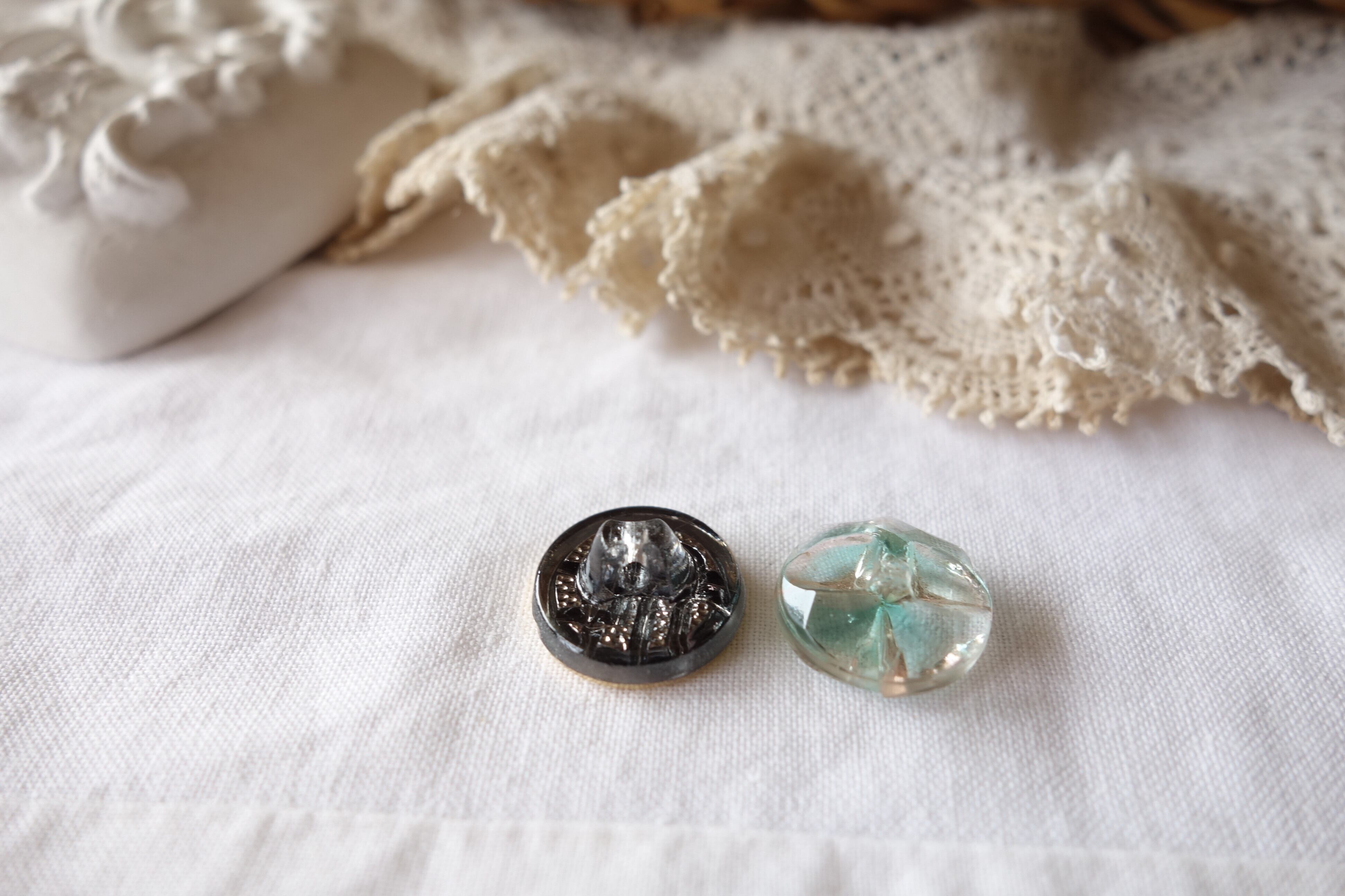 フランス 2個 アンティークボタン ガラス製 A610 ゴールド&クリアカット