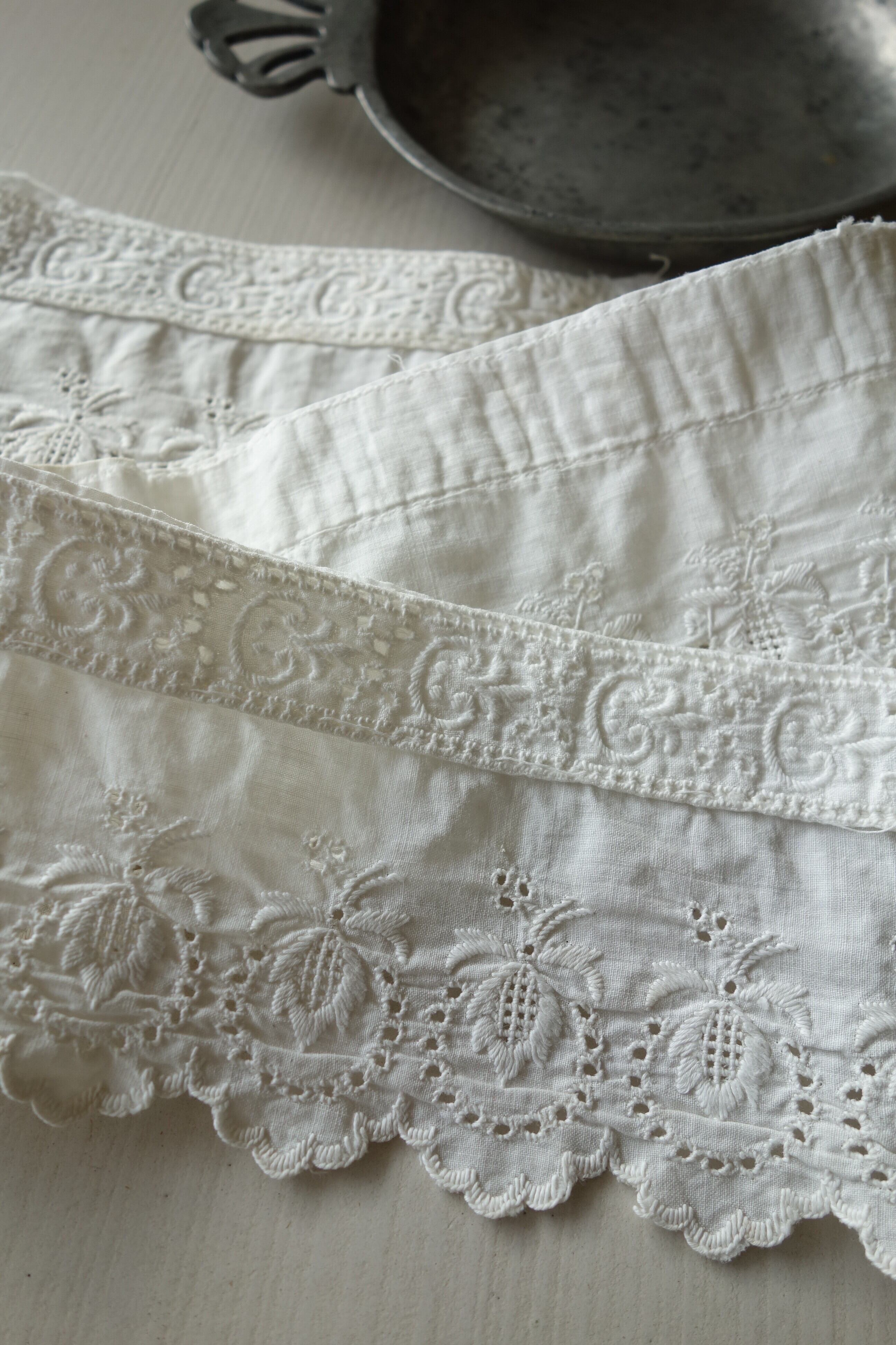 上部は2㎝幅のアイレットレースが上から縫ってあります。取ることも可能。飾りレース素材としてもお使い頂けます。