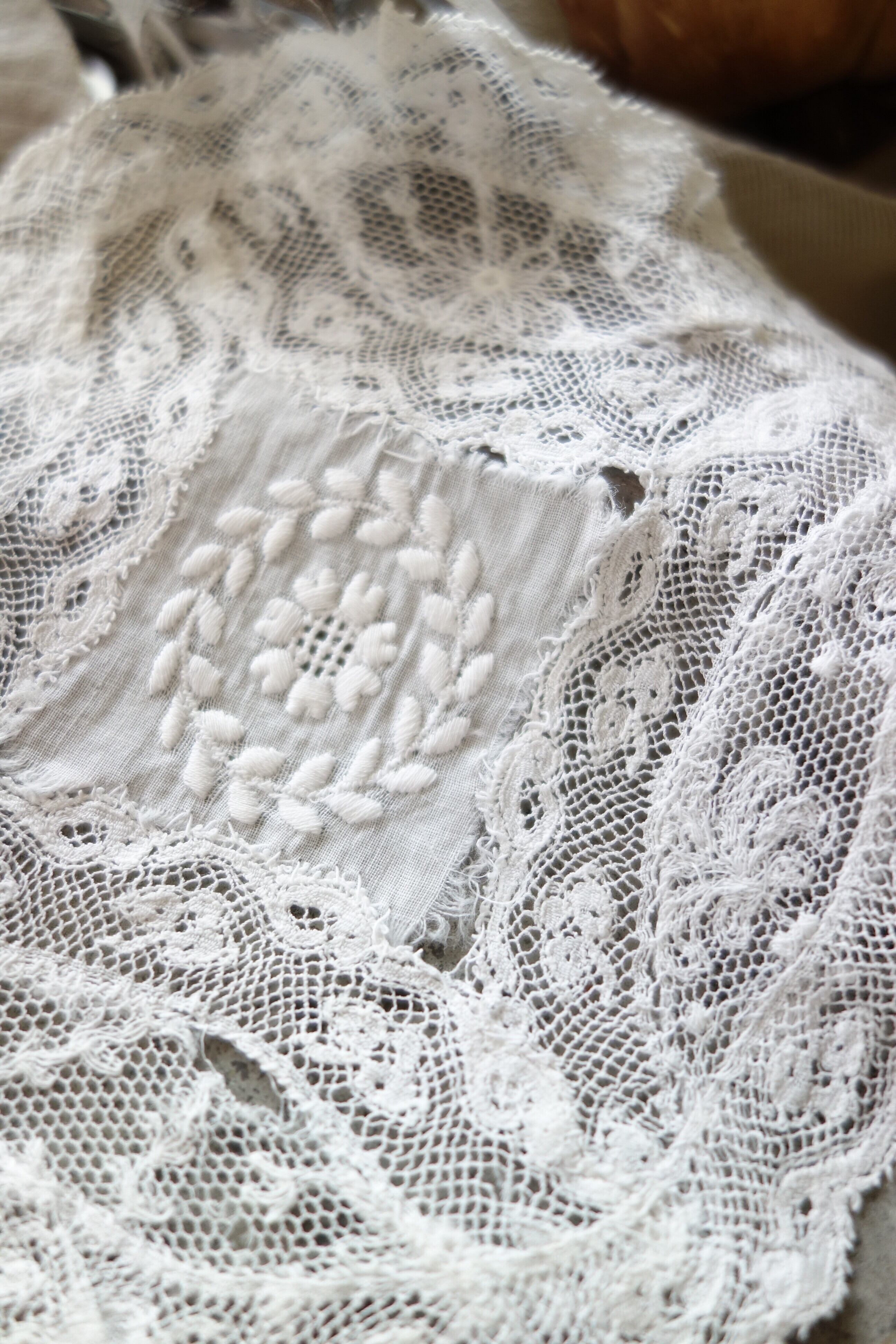 手刺繍のモチーフとレースをつなぎ合わせたアサンブラージュ