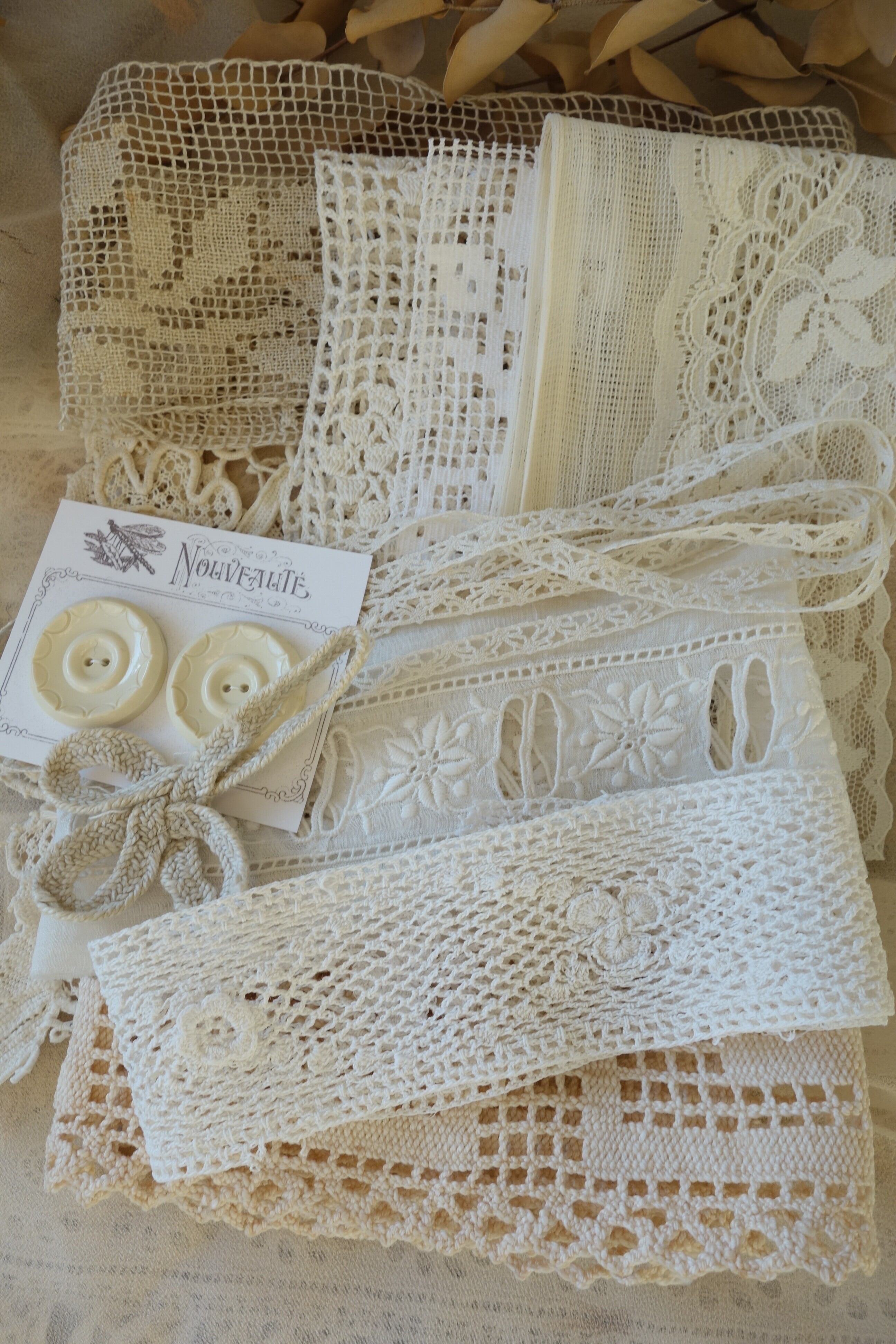 クロッシェレース、アイレットレース、ボビンレース、ブロドリー、チュール、細レースなど10種類の素材をセットしました。