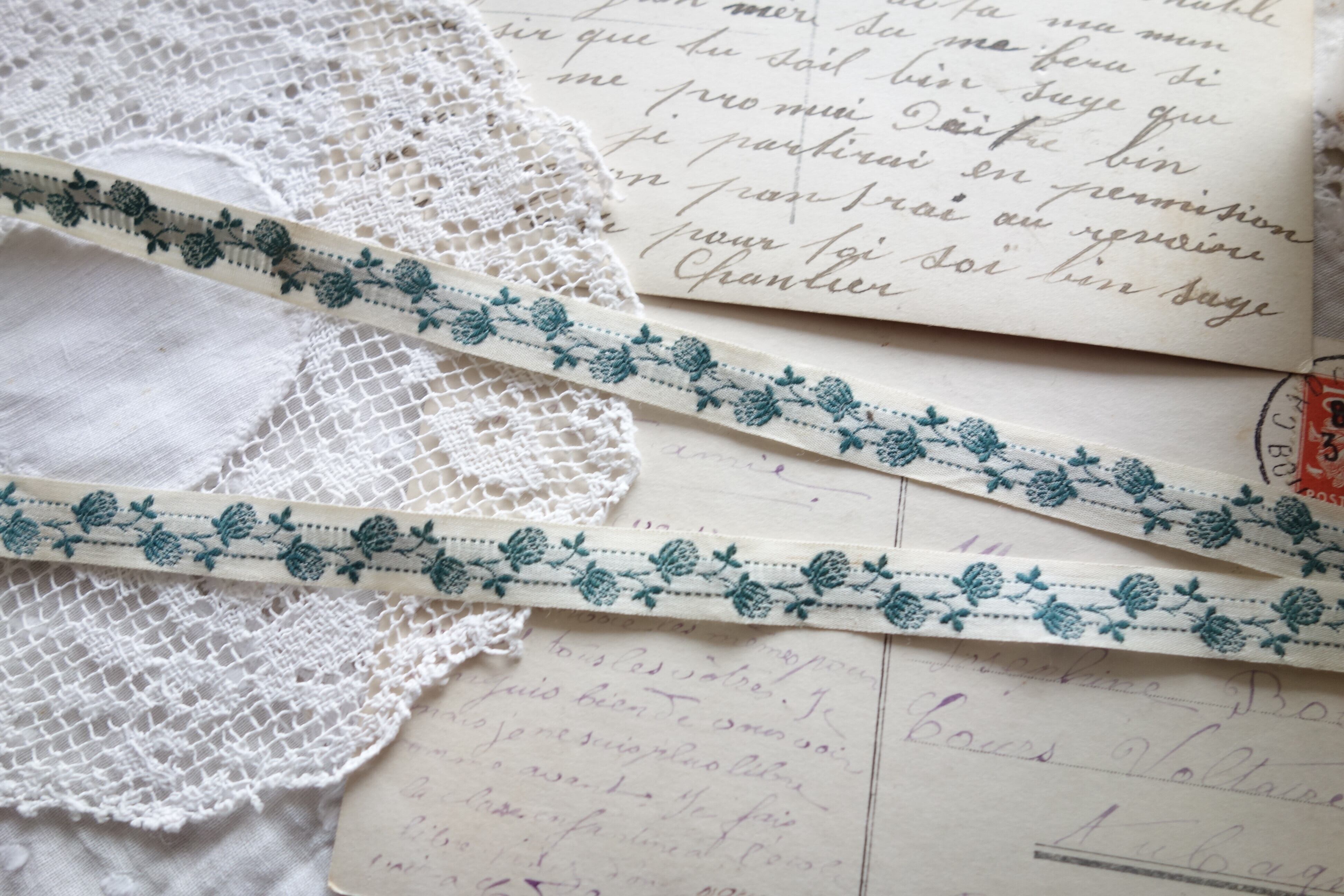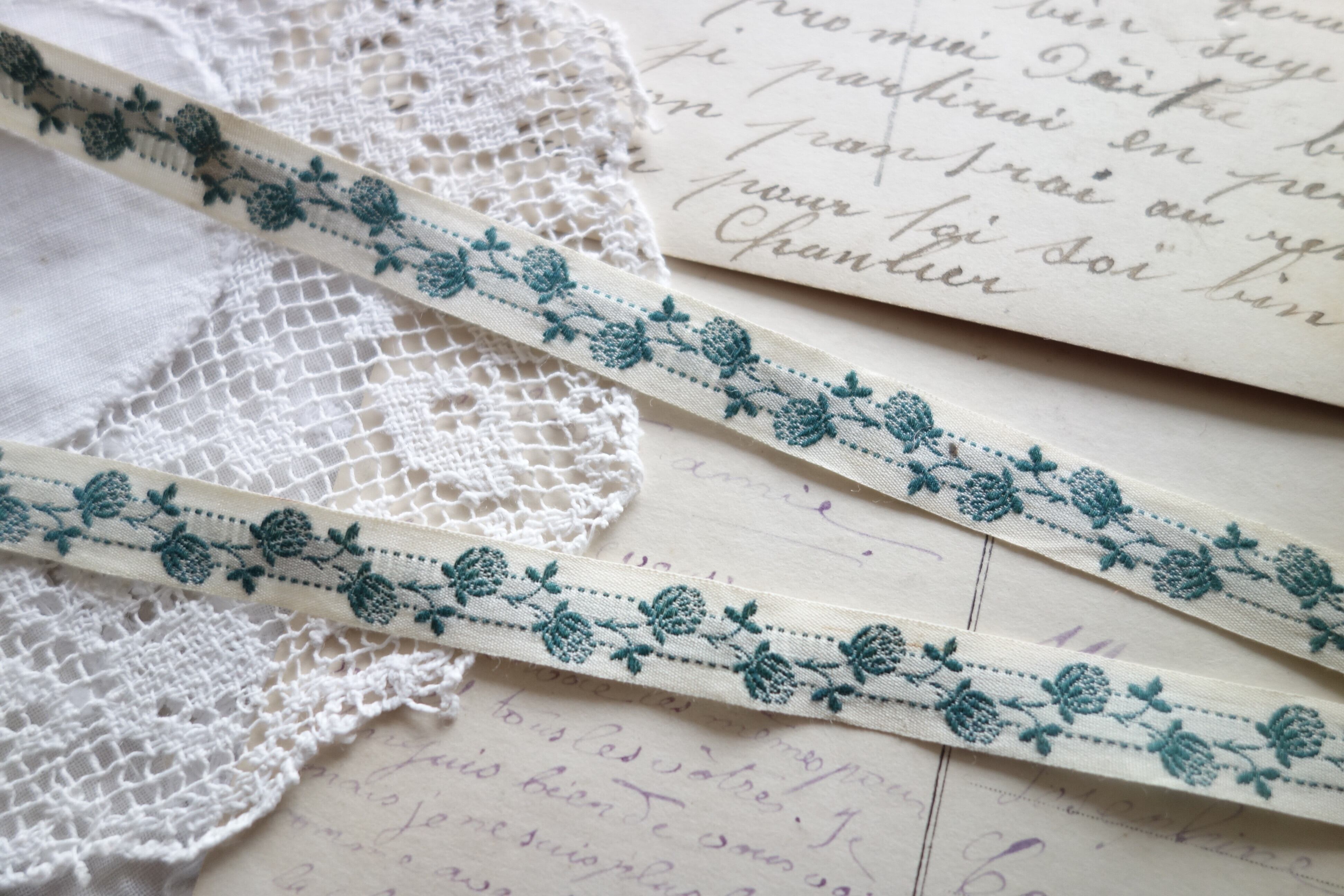 再入荷✤フランス 1m アンティークレースリボン C367 グリーン花
