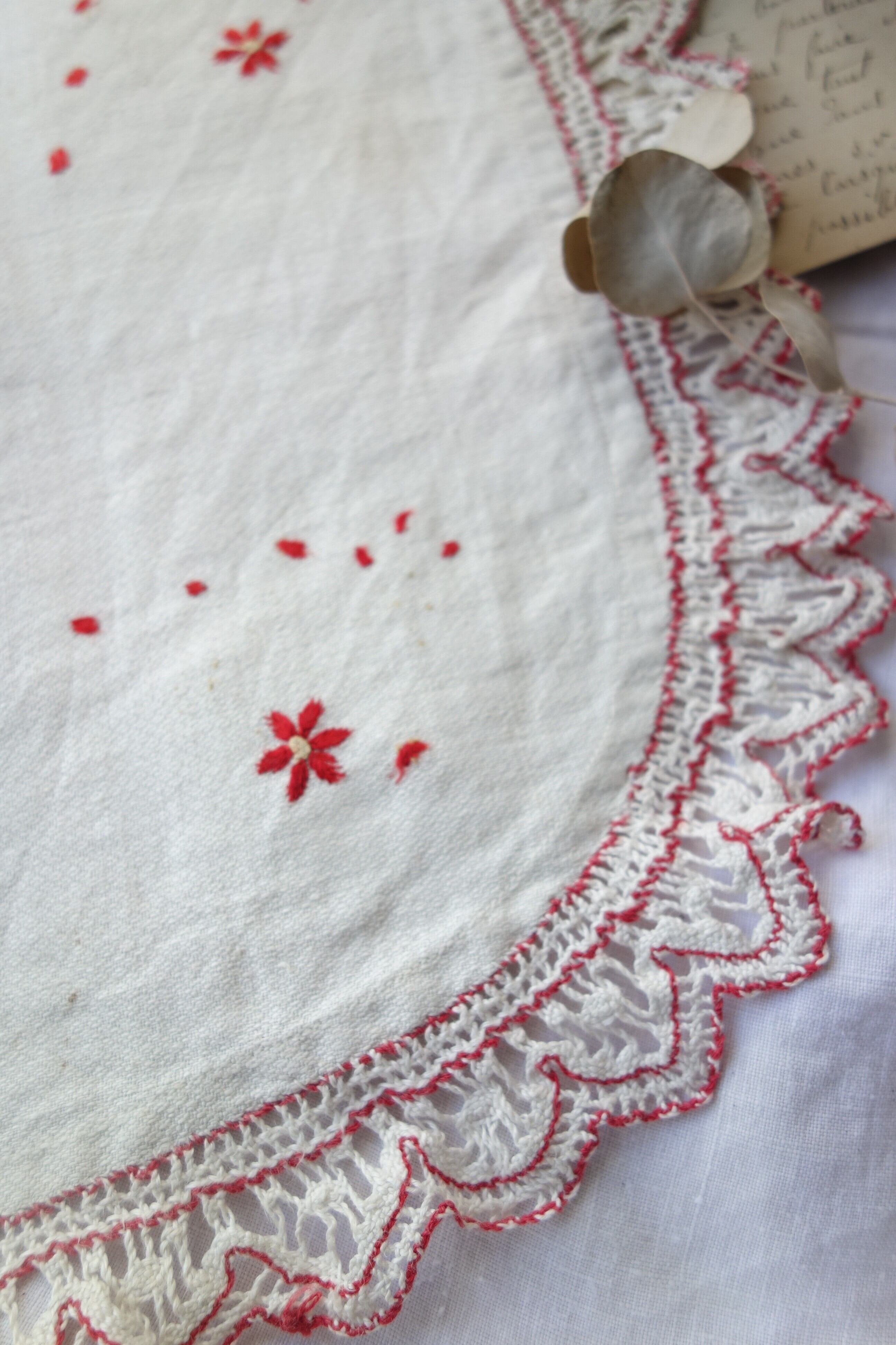 赤と白のMIXのクロッシェレースがひらひらしていてとても可愛いドイリーです。