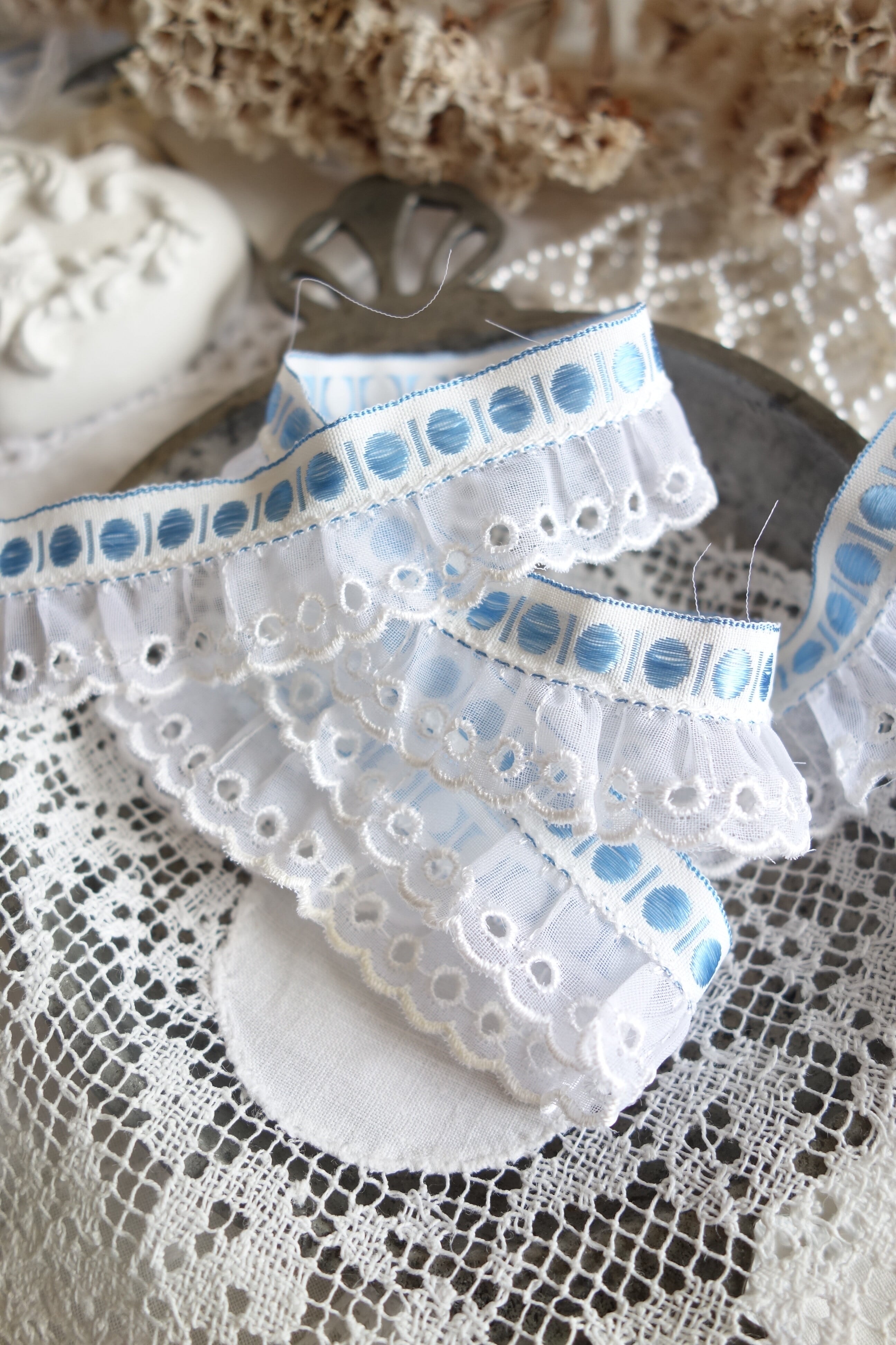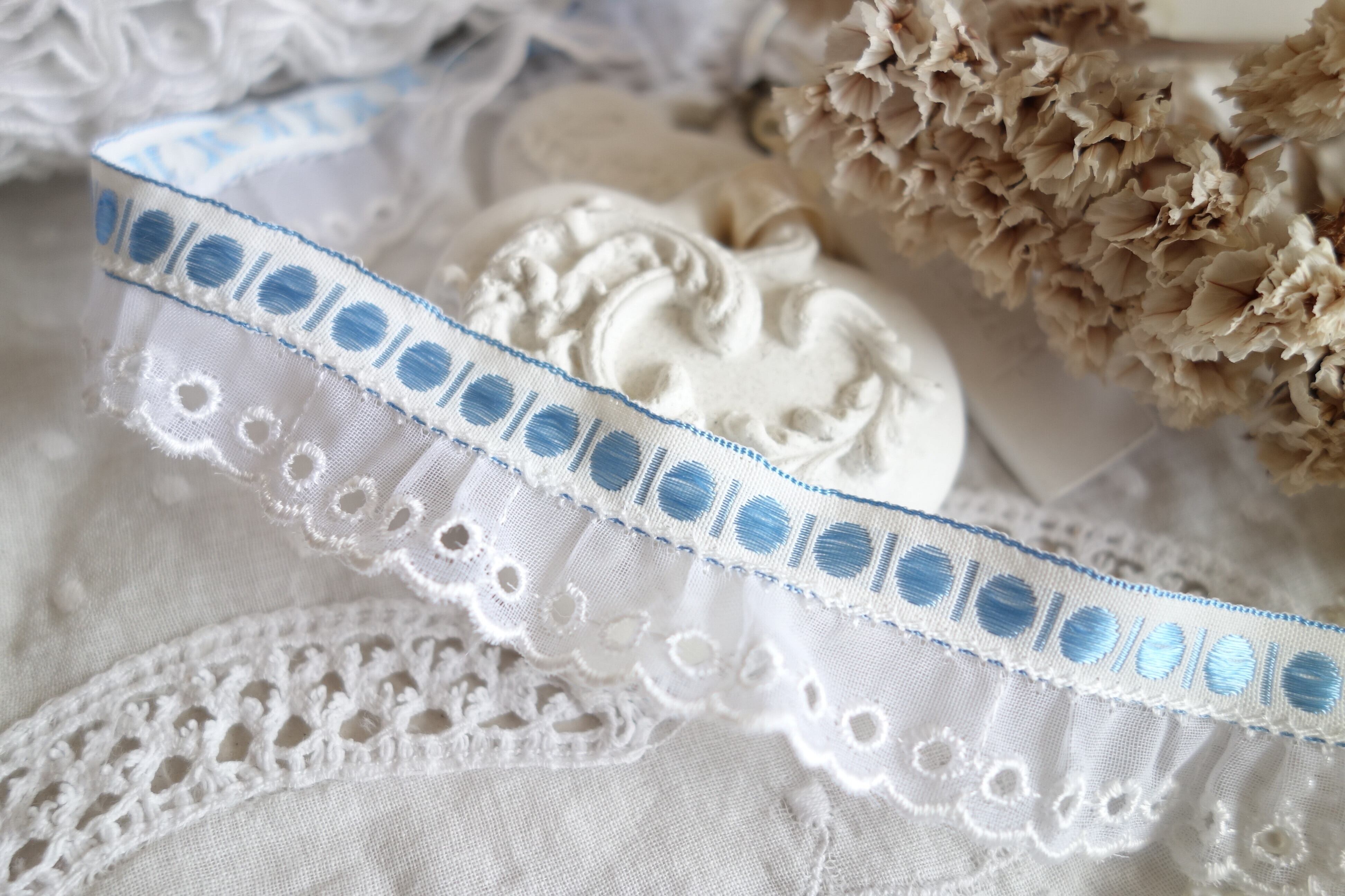 ブルーカラーのトリムに透け感があるギャザーレースが付いているものです。