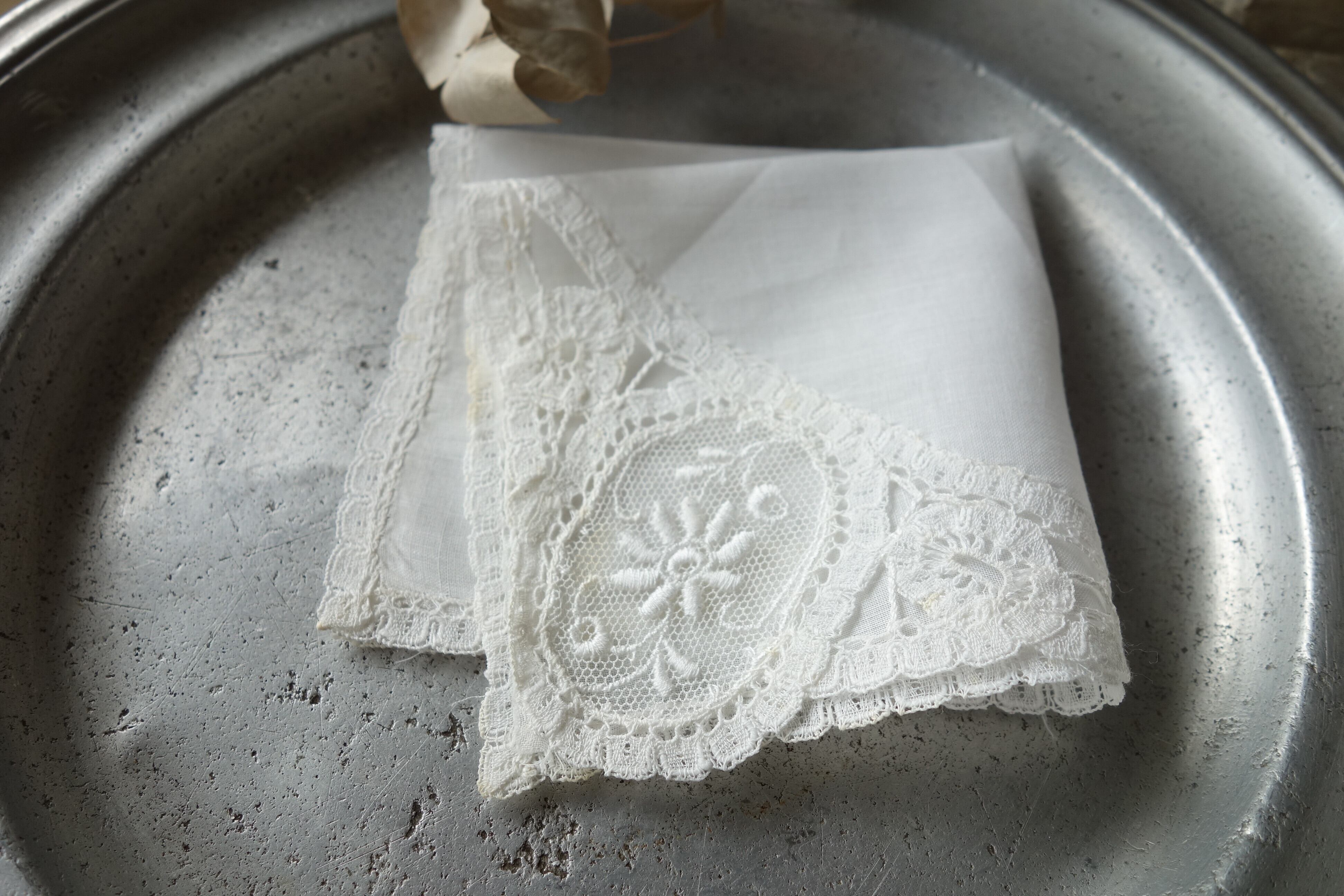 細い糸で織られたアンティークの刺繍ハンカチです。