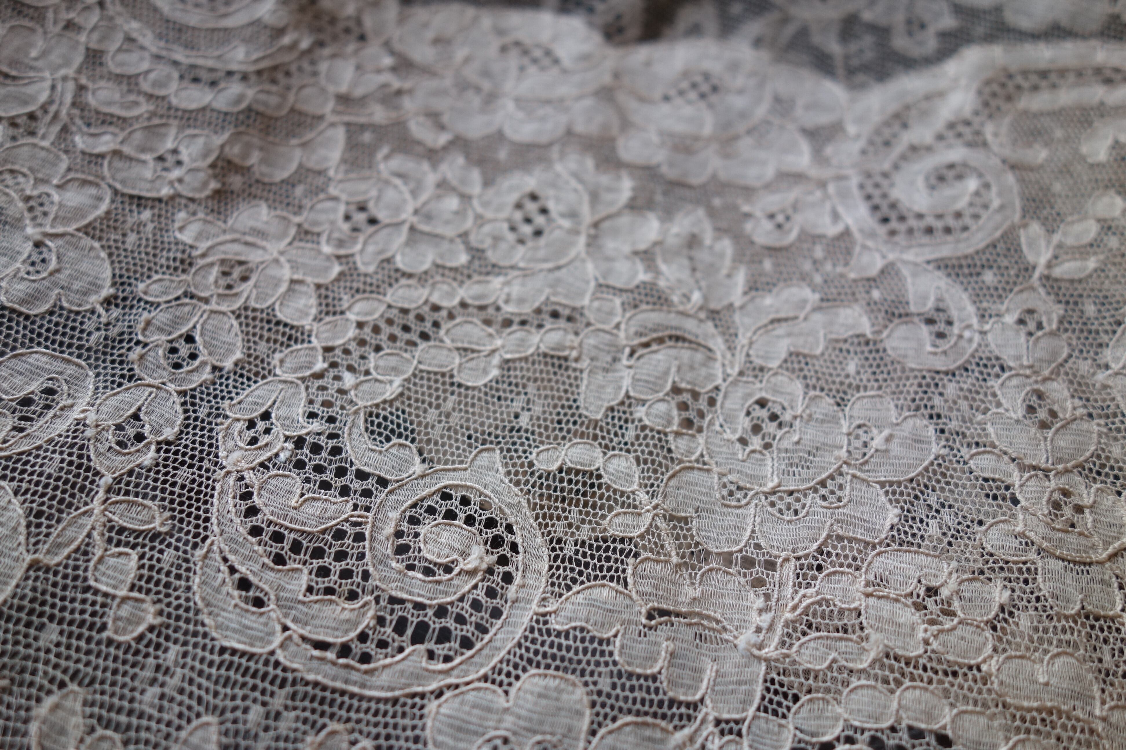 細かいチュールレースの幅いっぱいに描かれたフラワーデザイン