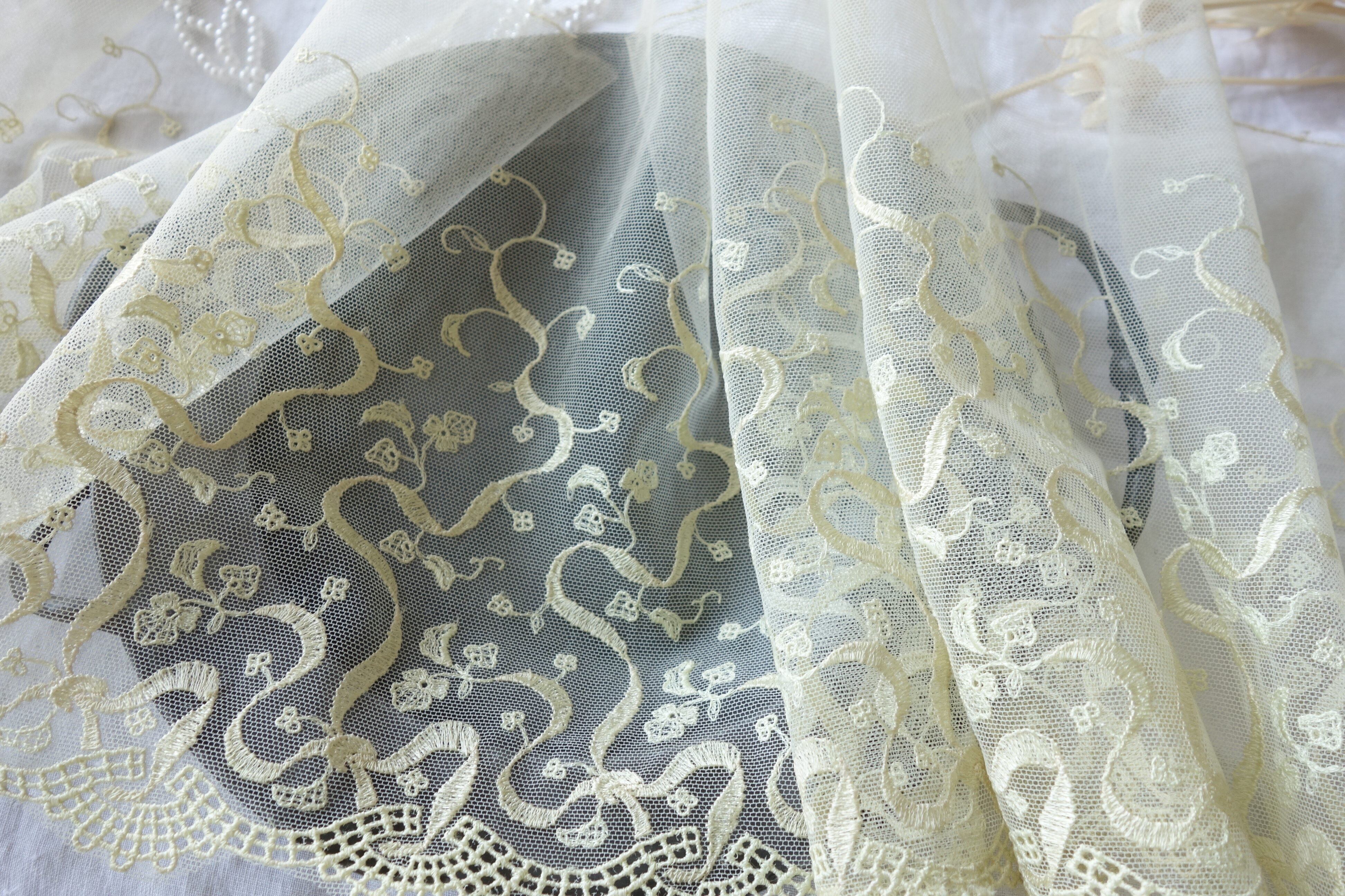 50㎝ アンティーク刺繍チュールレース C432 クリームイエロー