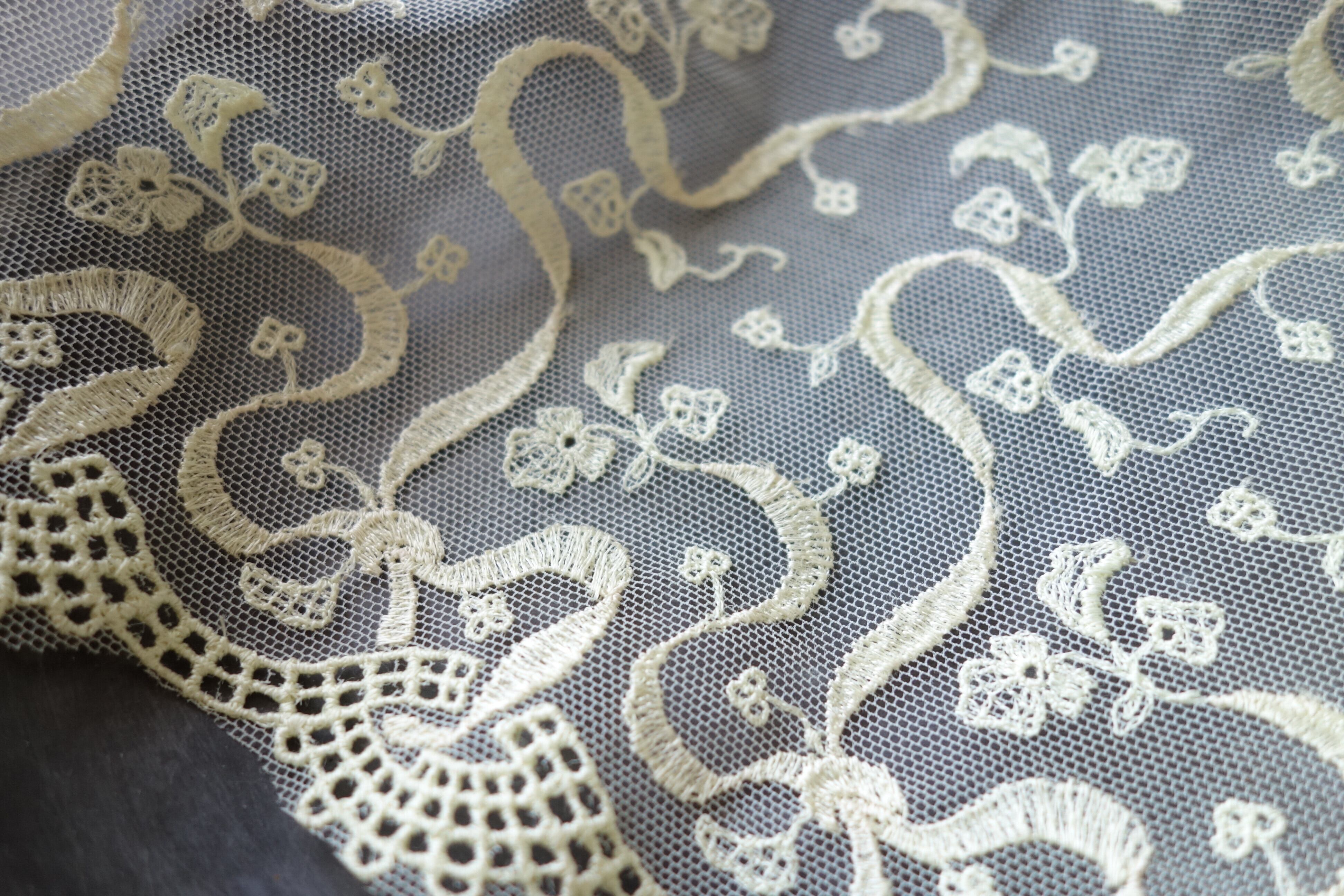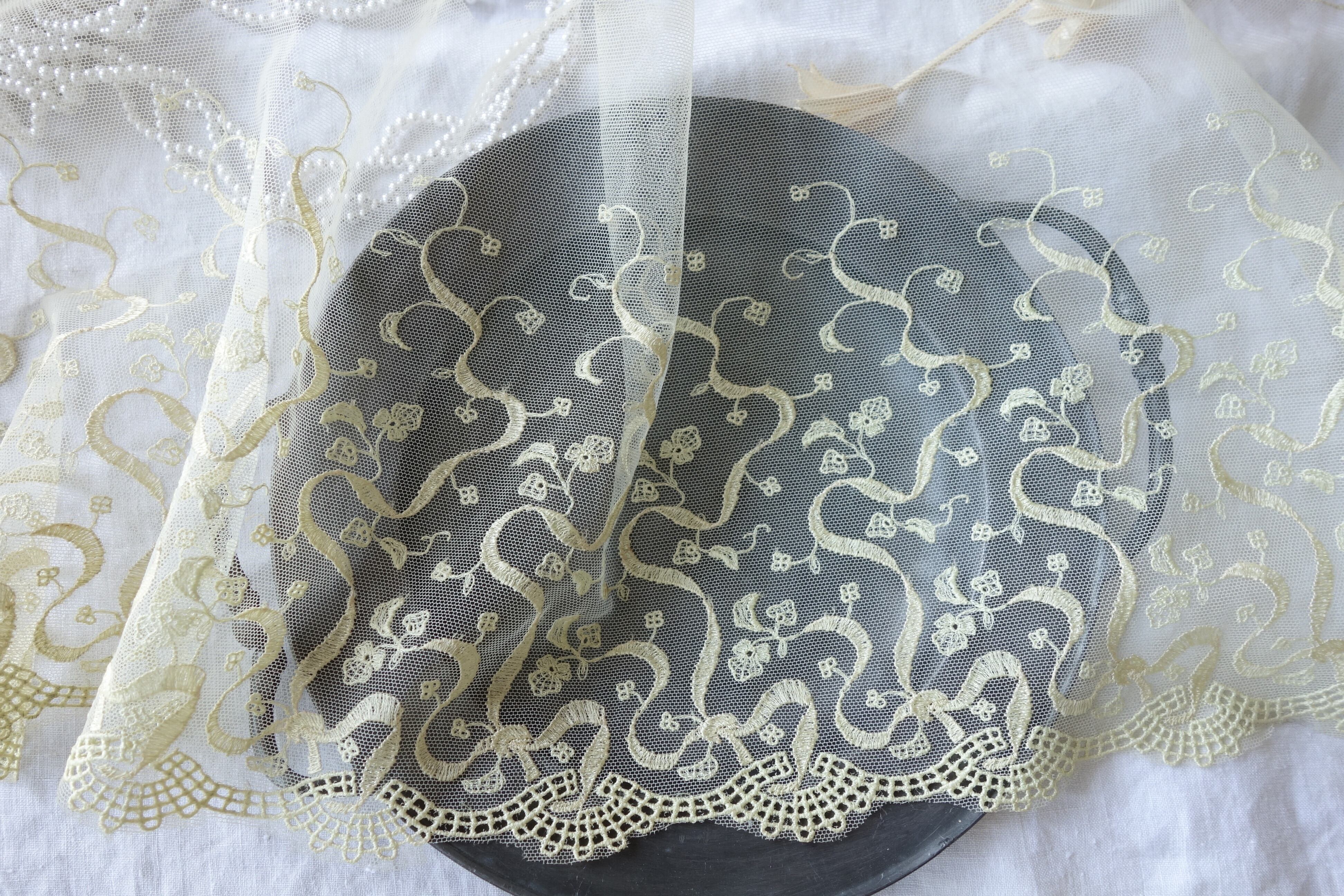 幅広チュールレースに施された素敵な手刺繍が心奪われます。