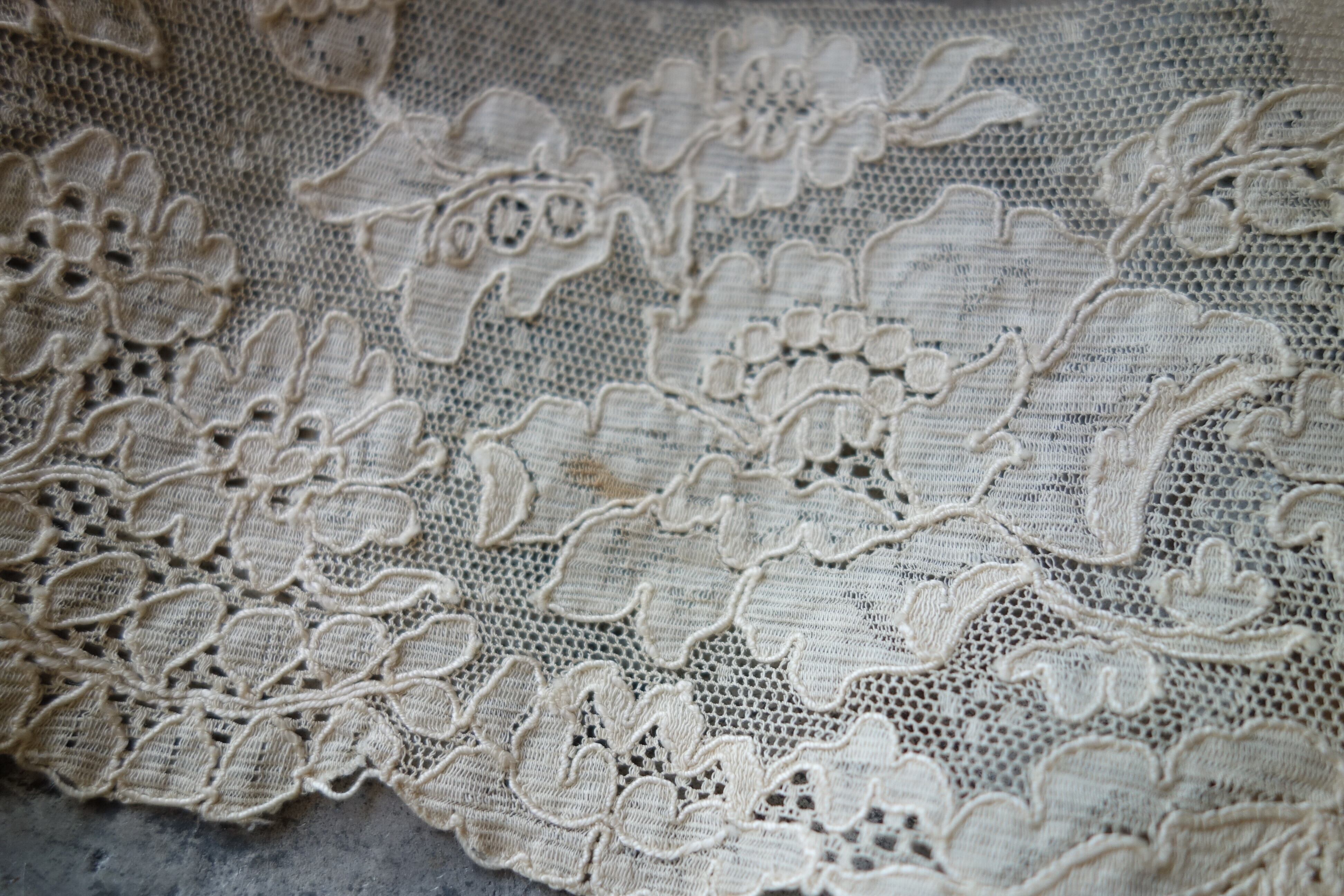 細かいチュールレースの幅いっぱいに描かれたフラワーデザイン