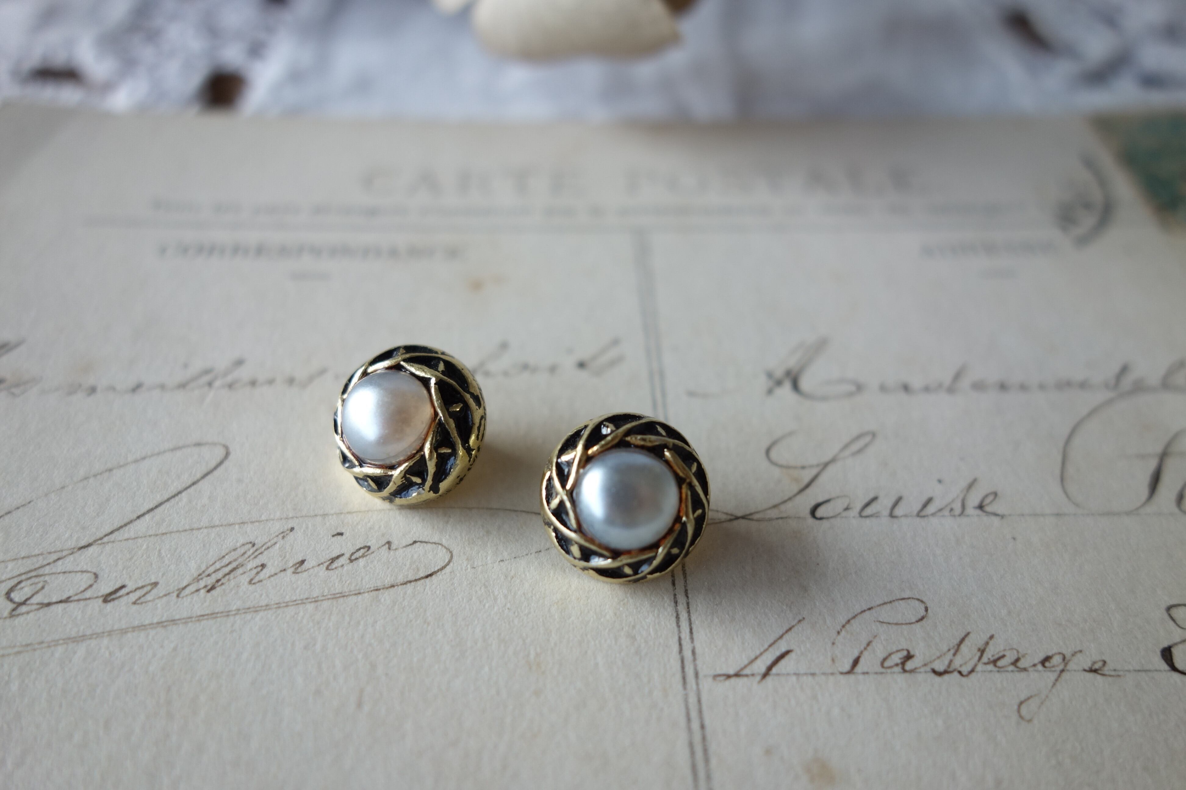 しっかり目のアンティーク枠にパールが乗っています。