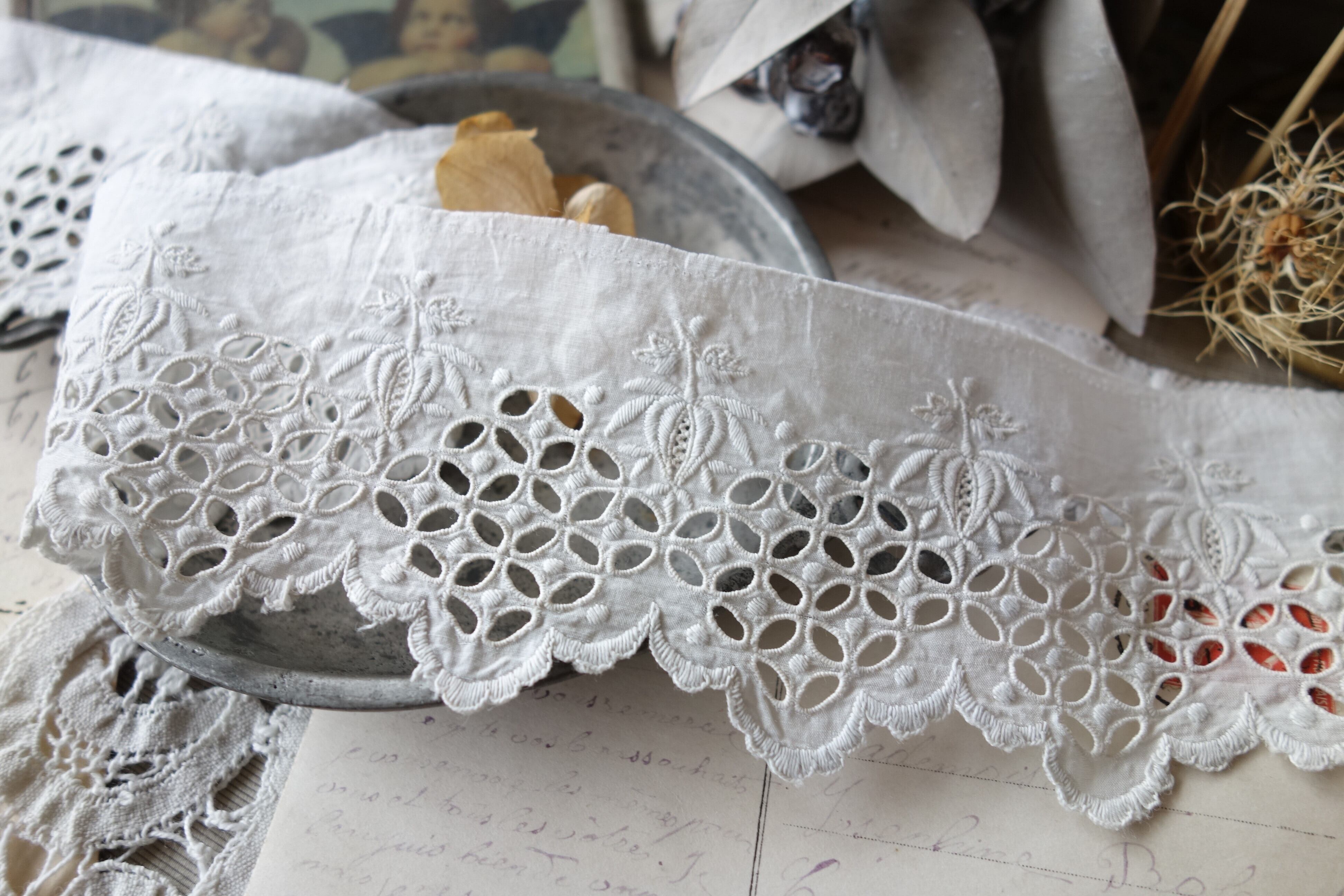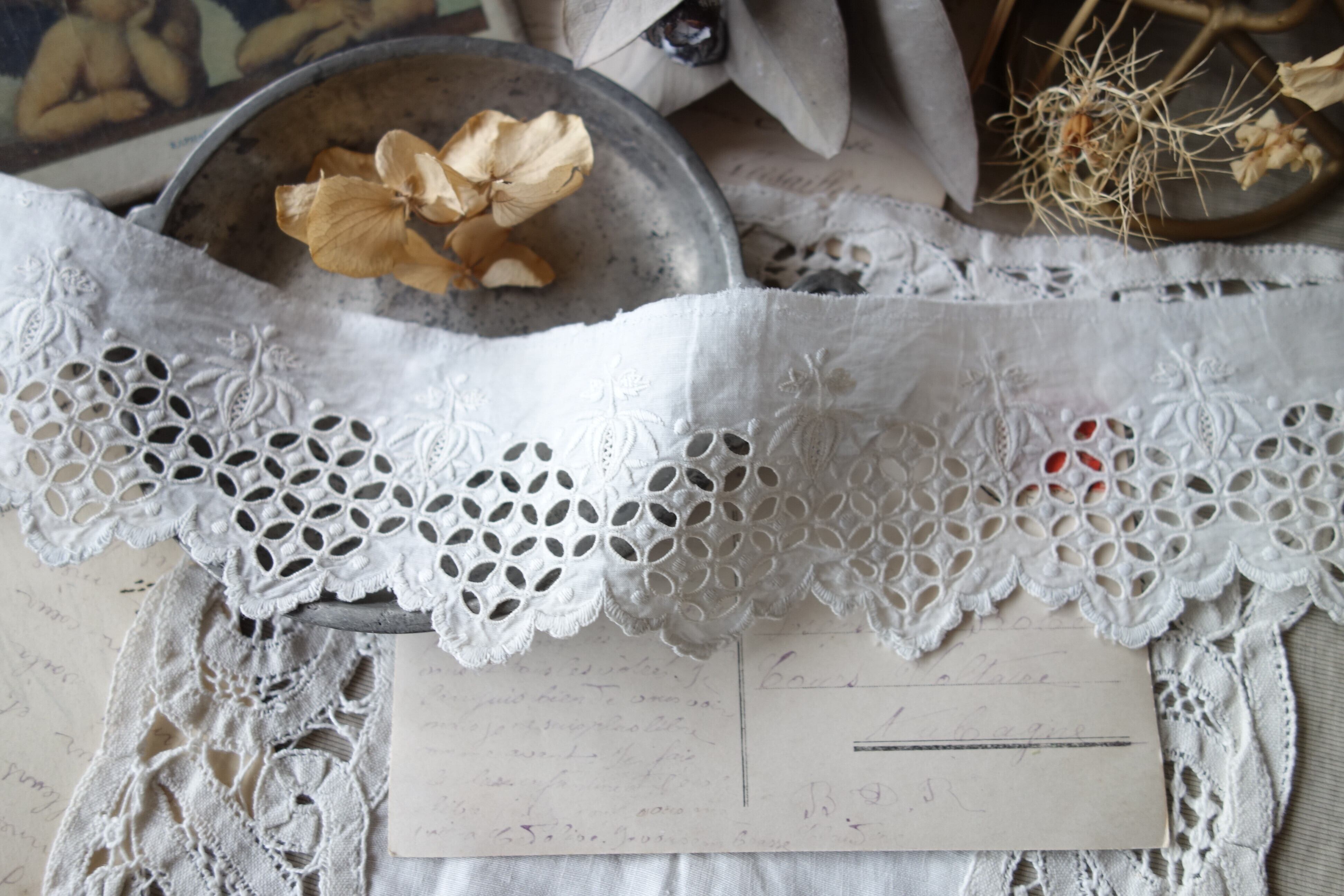 中央辺りのスカラップ刺繍の糸切れなど、ダメージがございます。