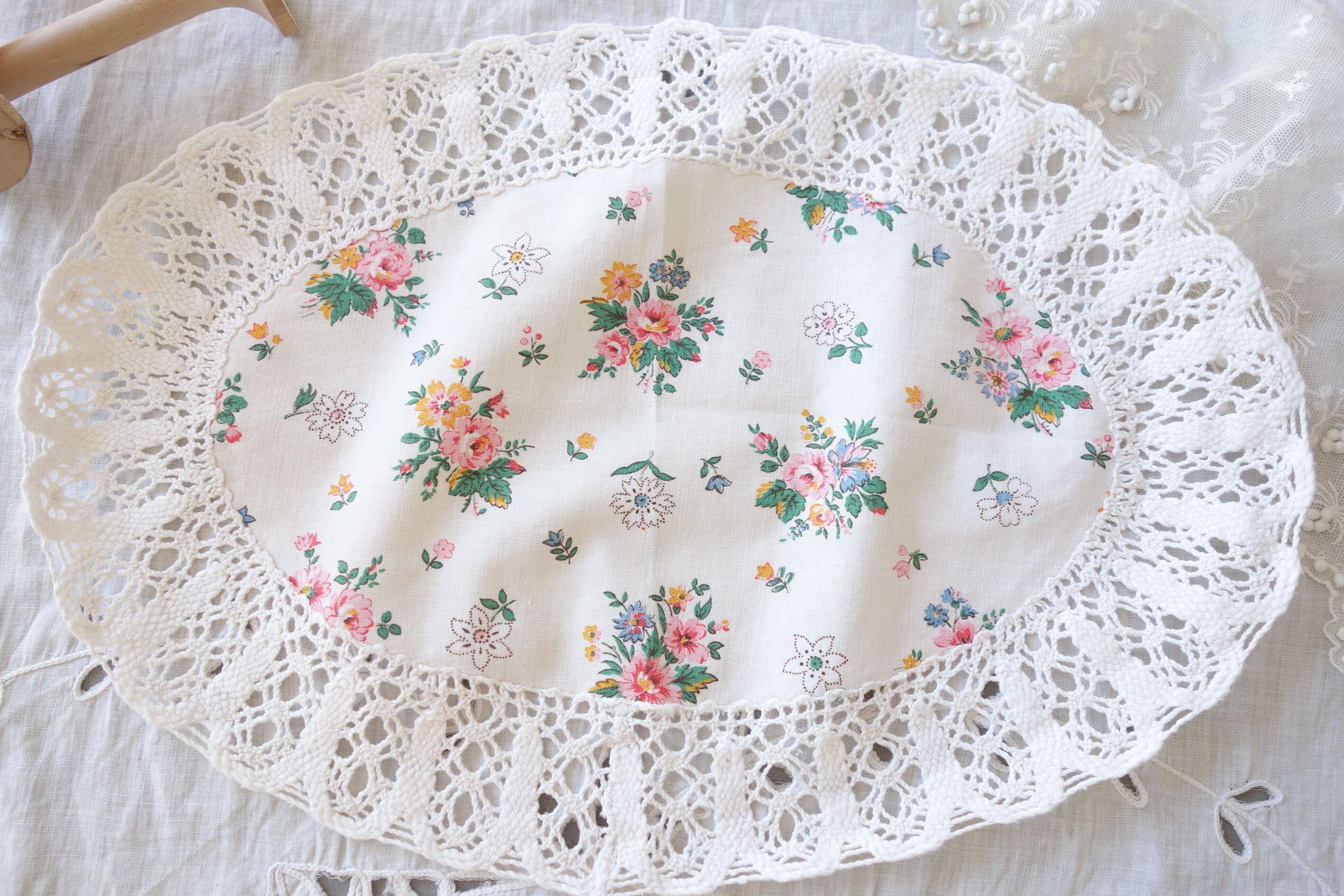 クロッシェレースに囲まれたオーバル型のドイリーです。