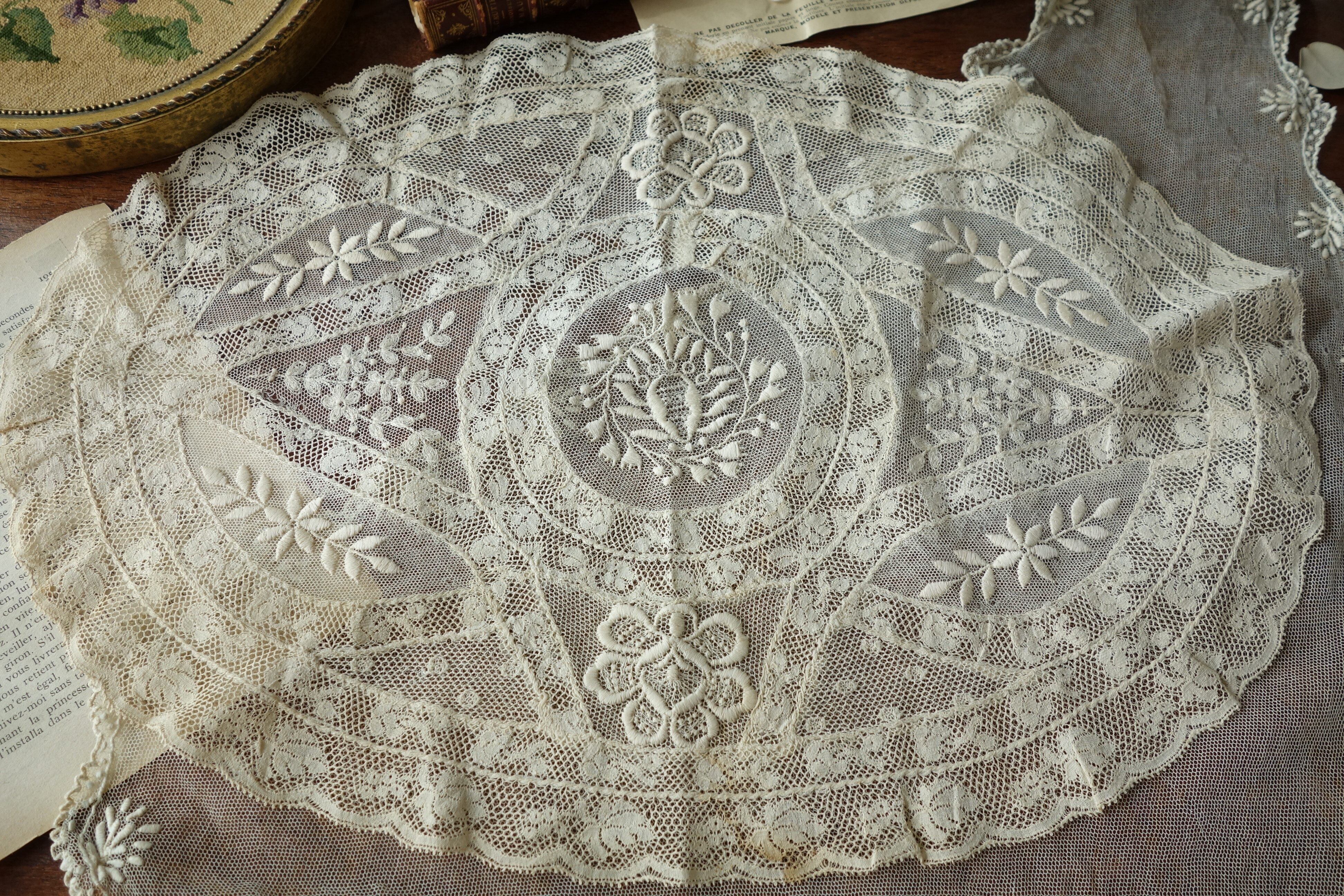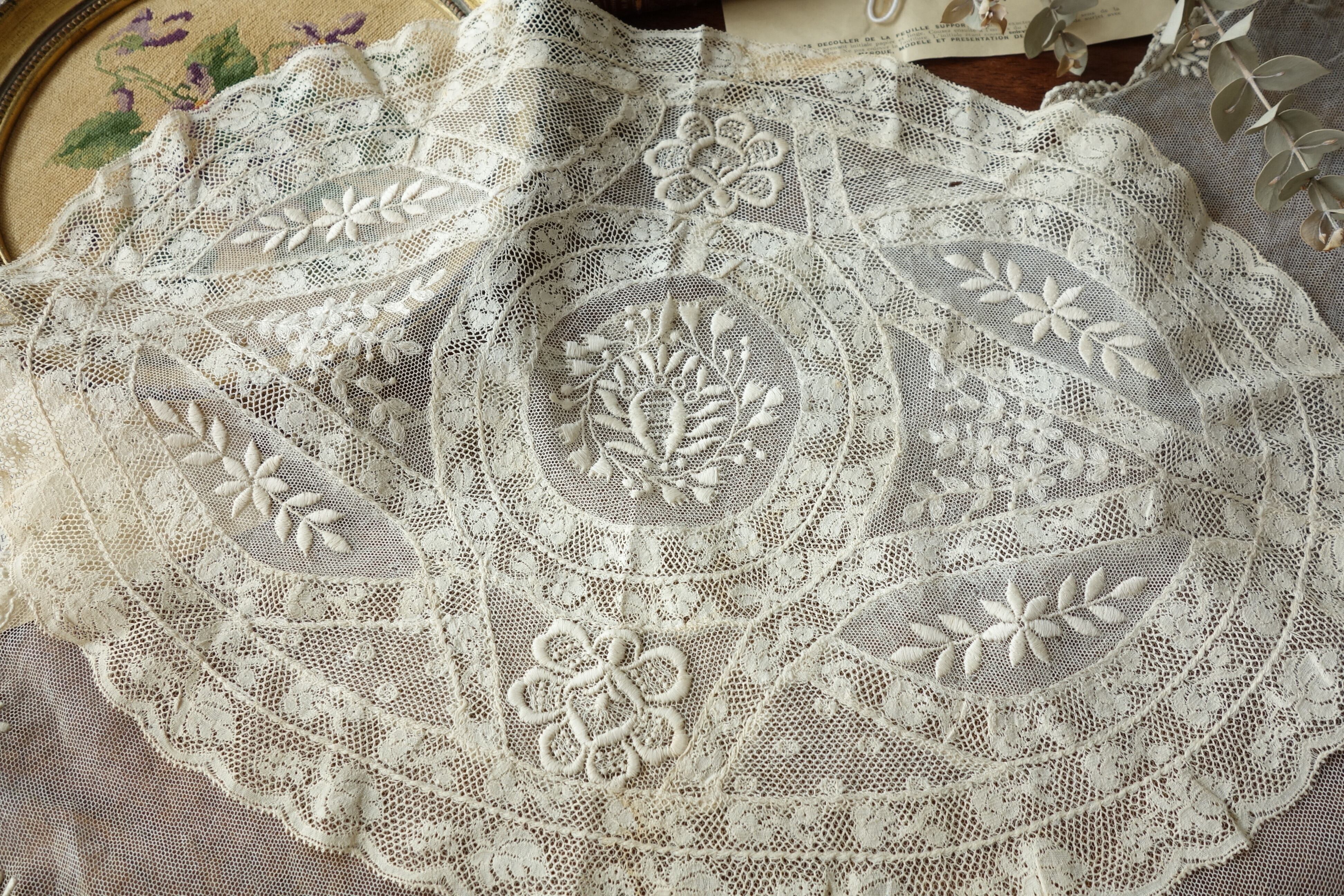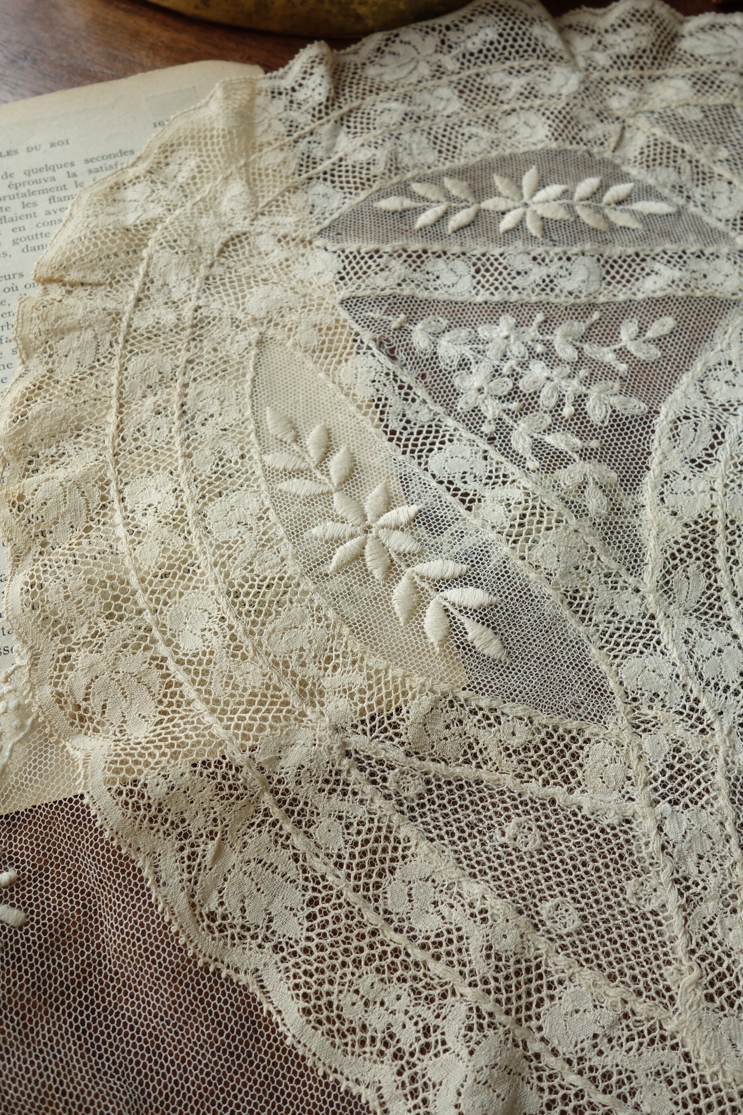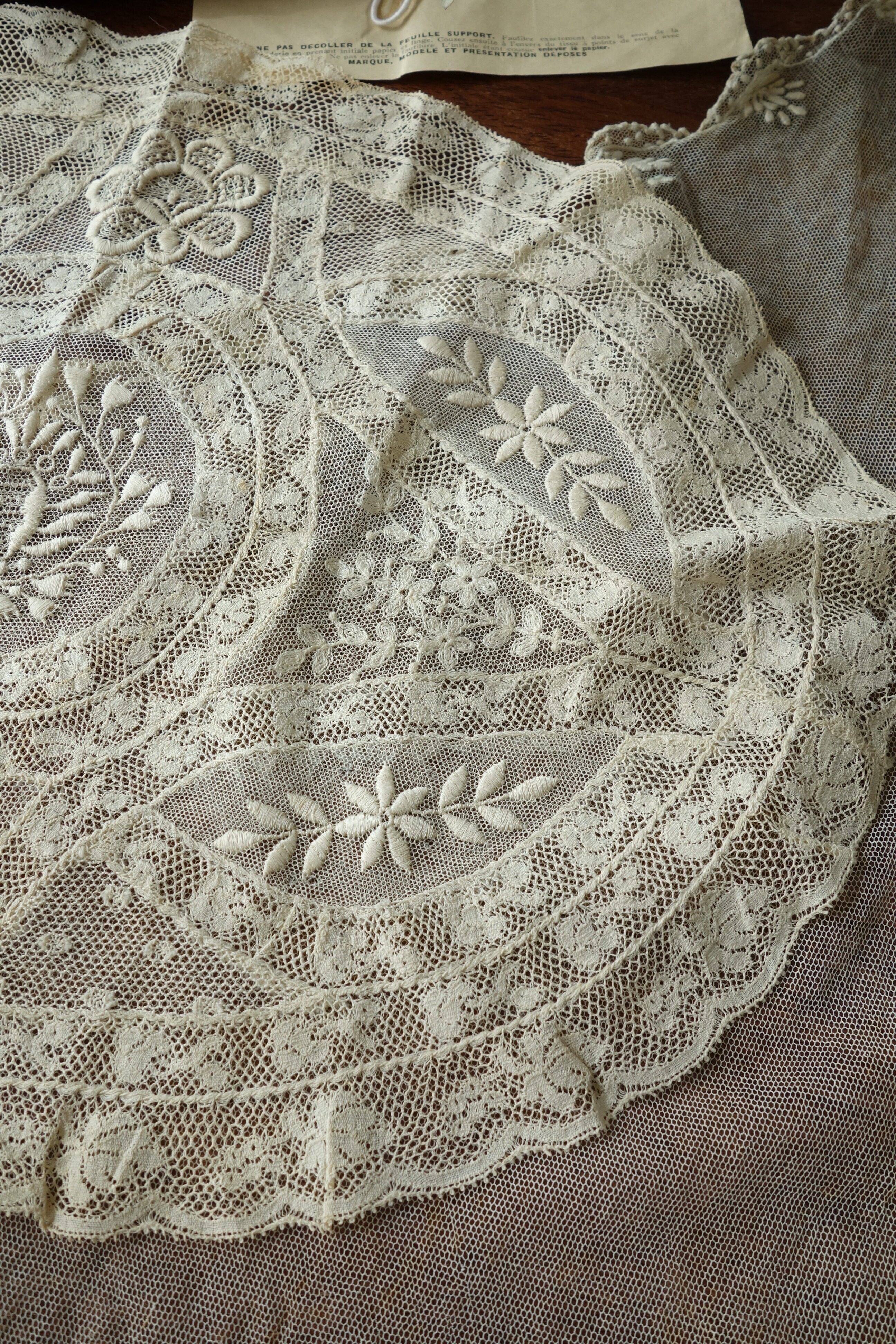 ボビンレースや形の異なる刺繍レースの組み合わせが素敵な品となっています。