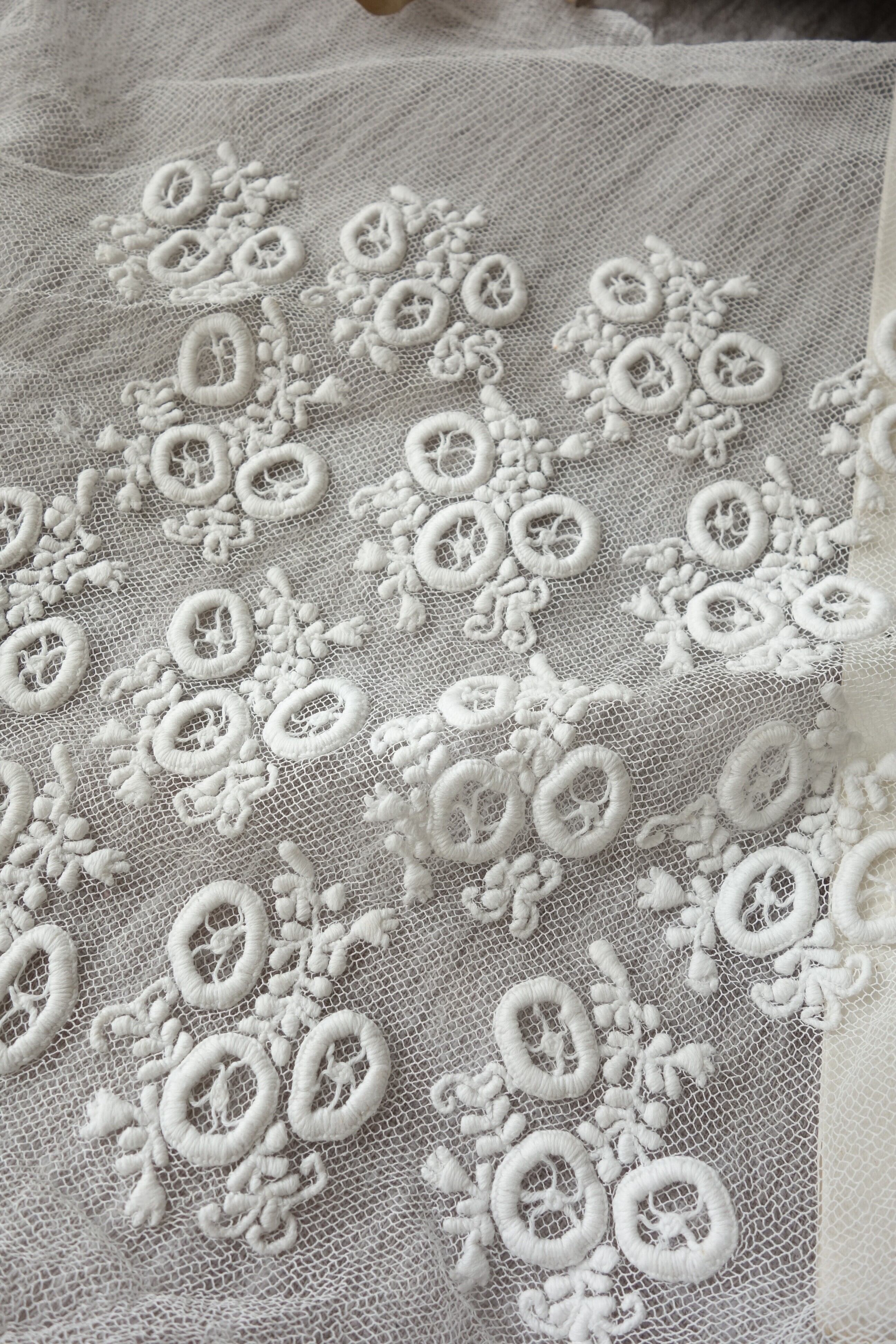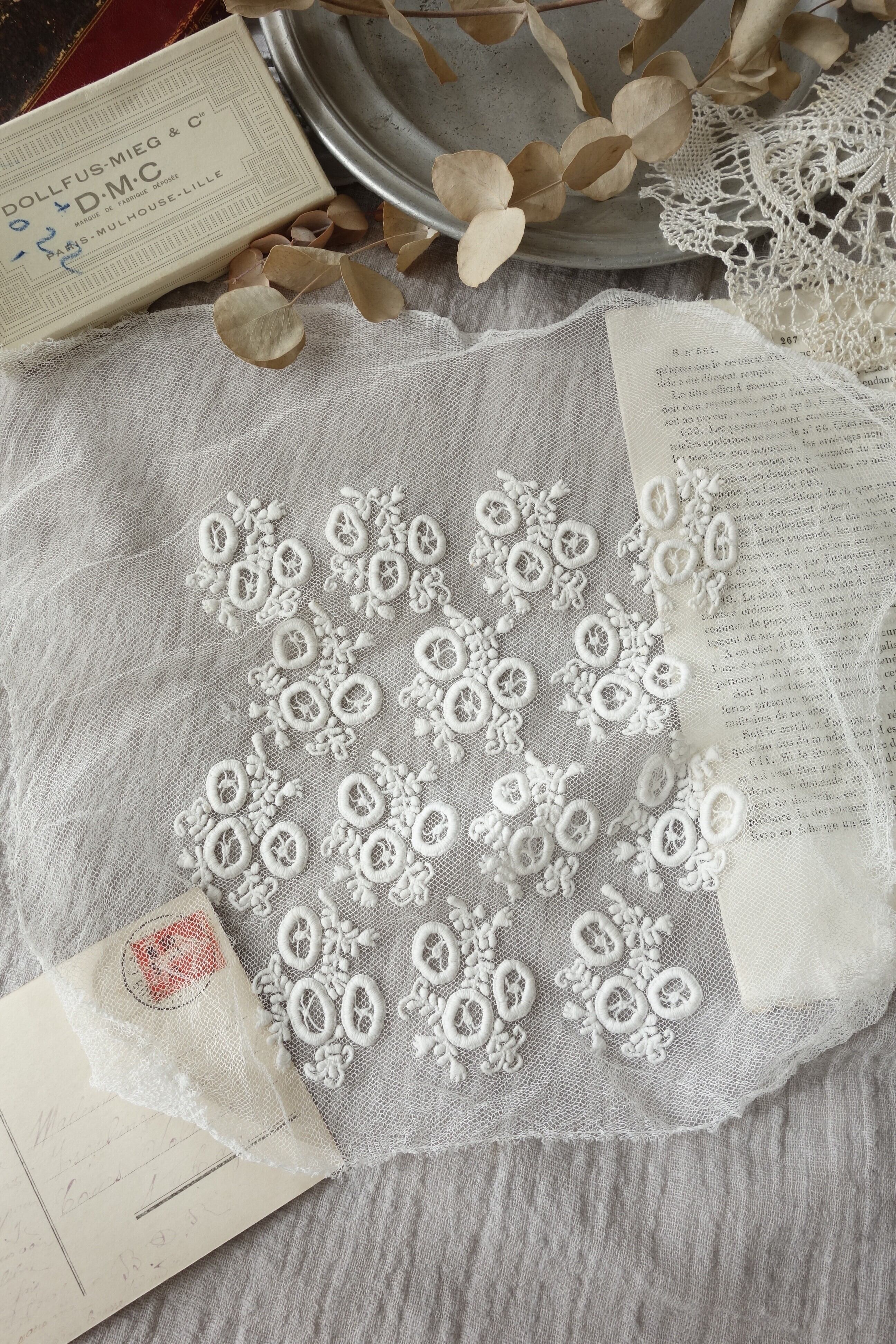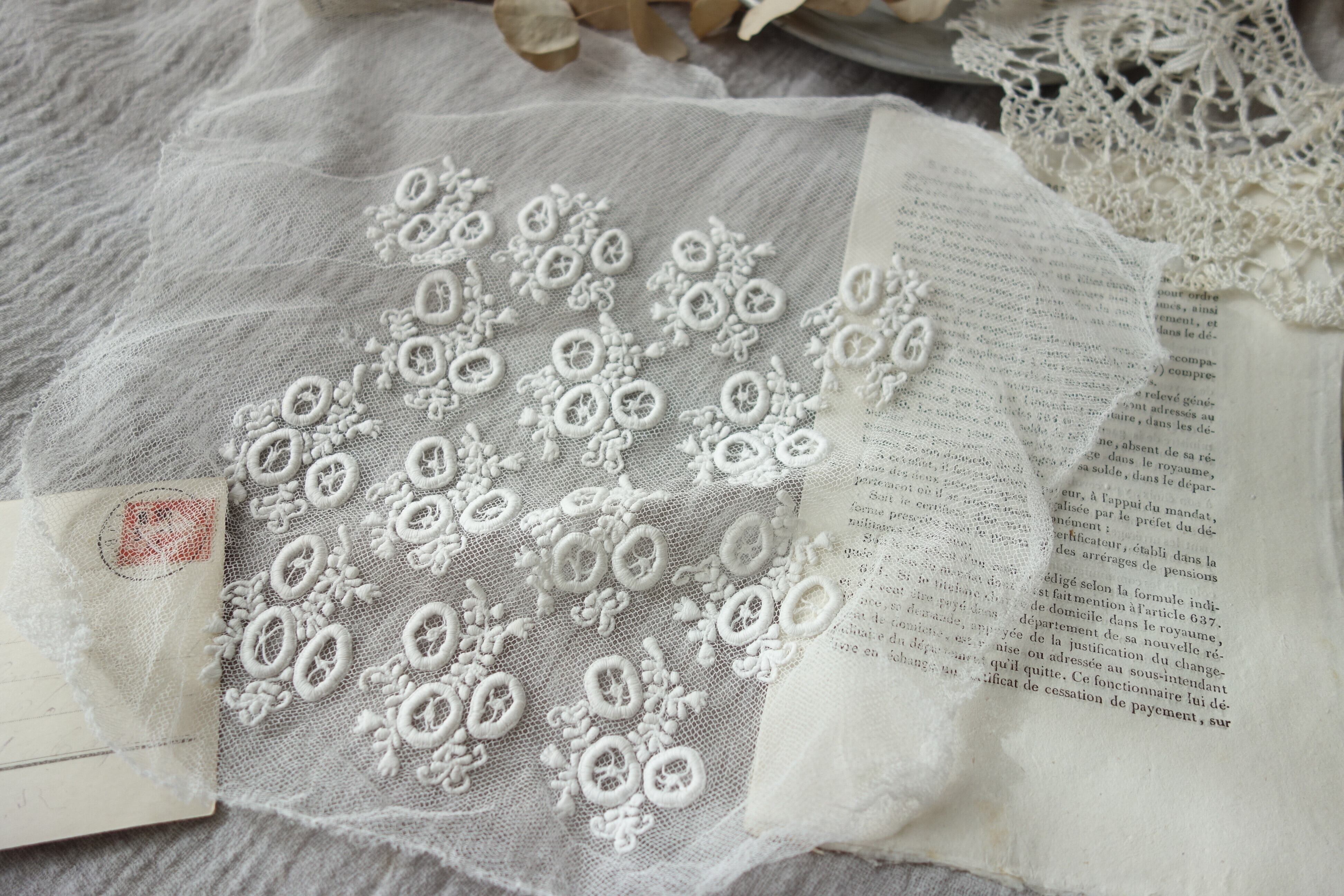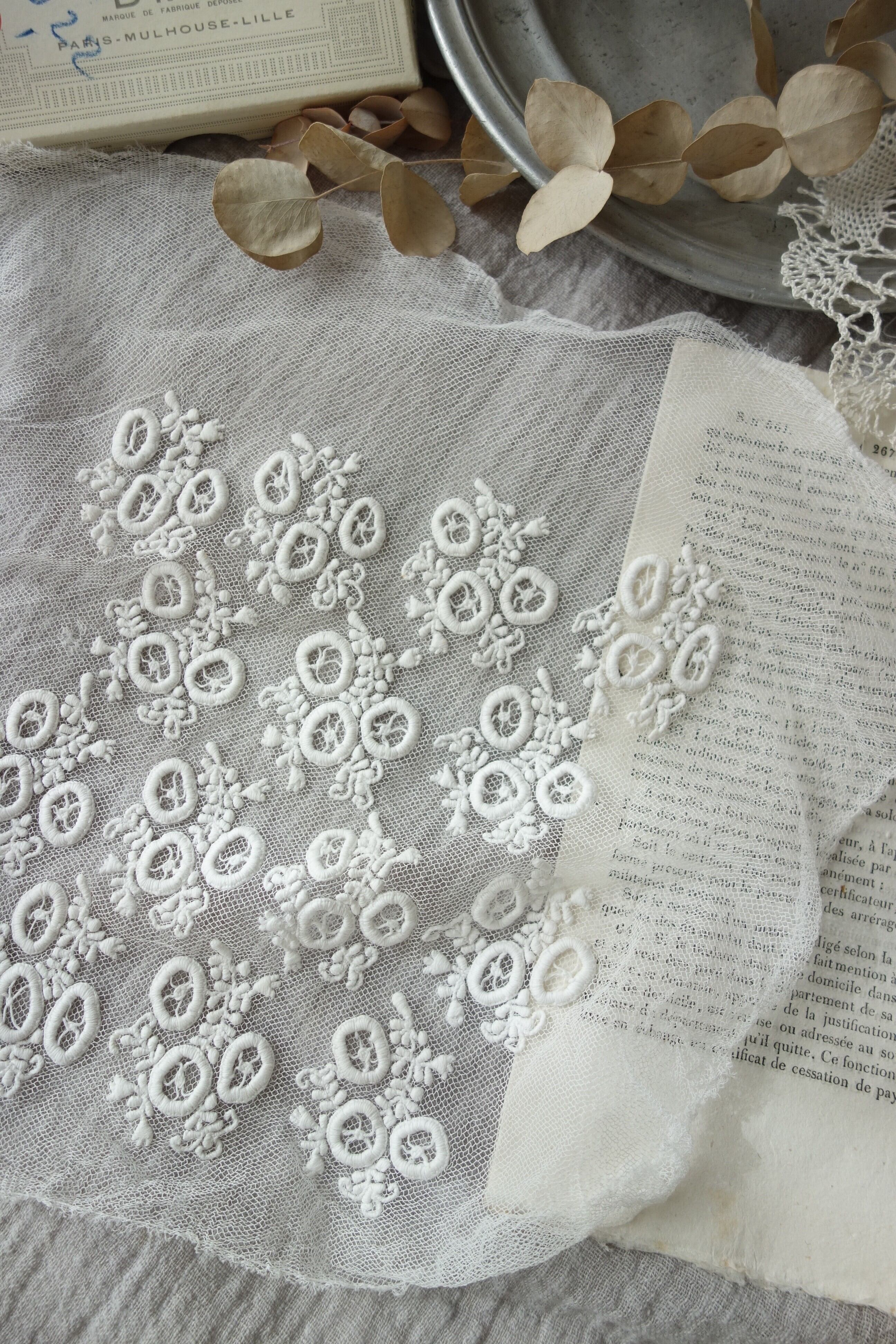 France製 アンティークボネの一部 刺繍レース C577 ホワイト