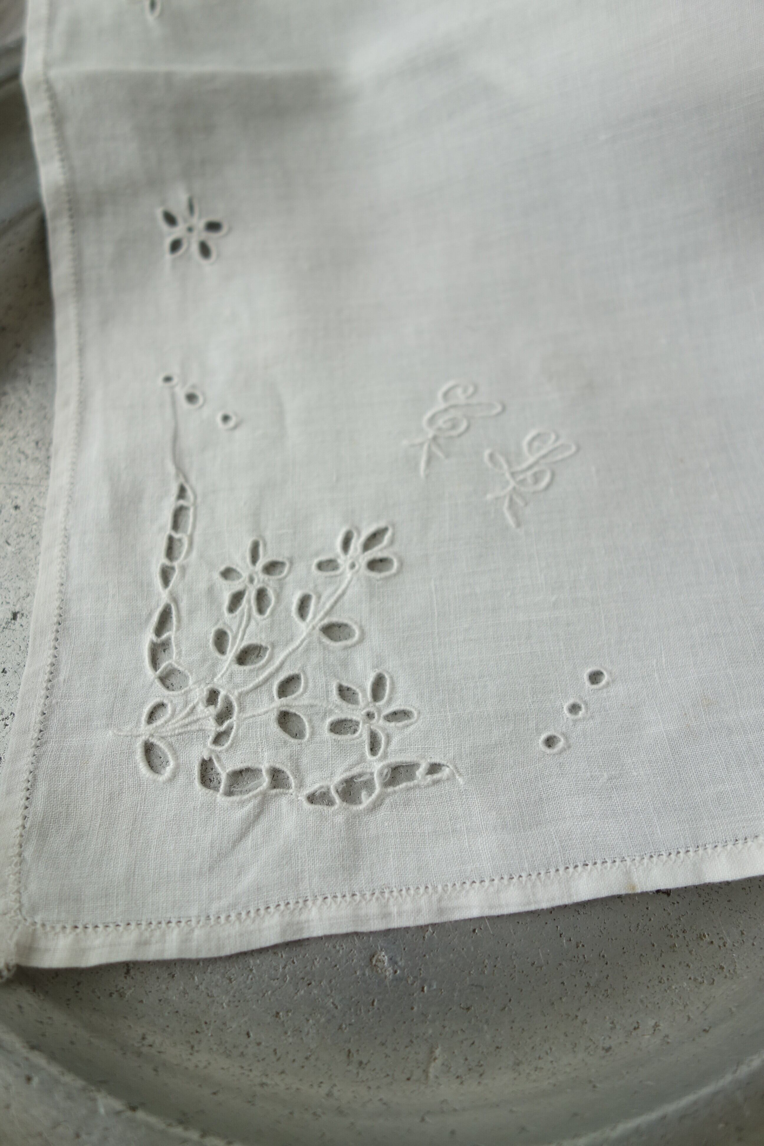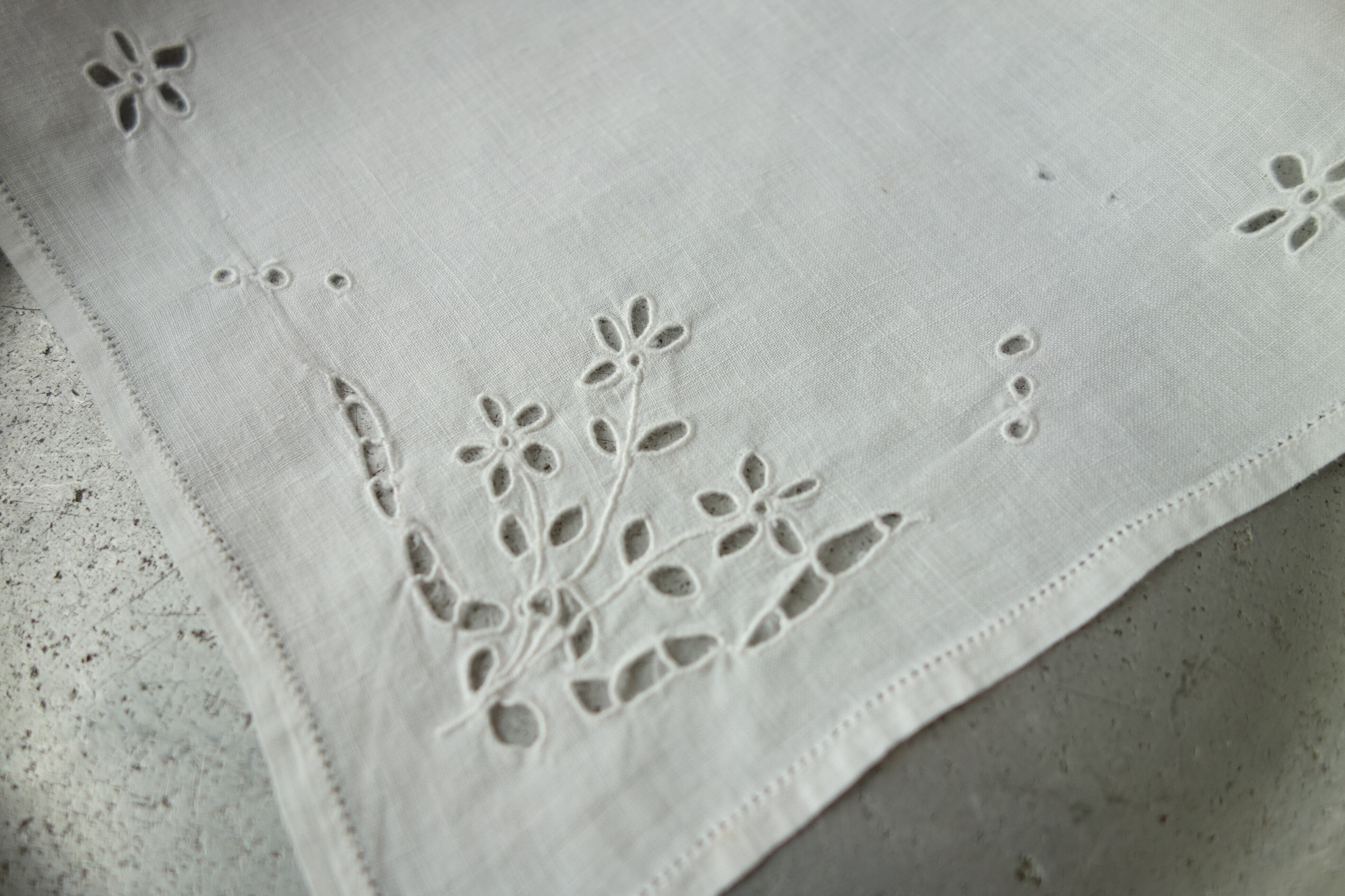 生地に穴を空け周りを刺繍を施していく技法でお花模様にしています。
