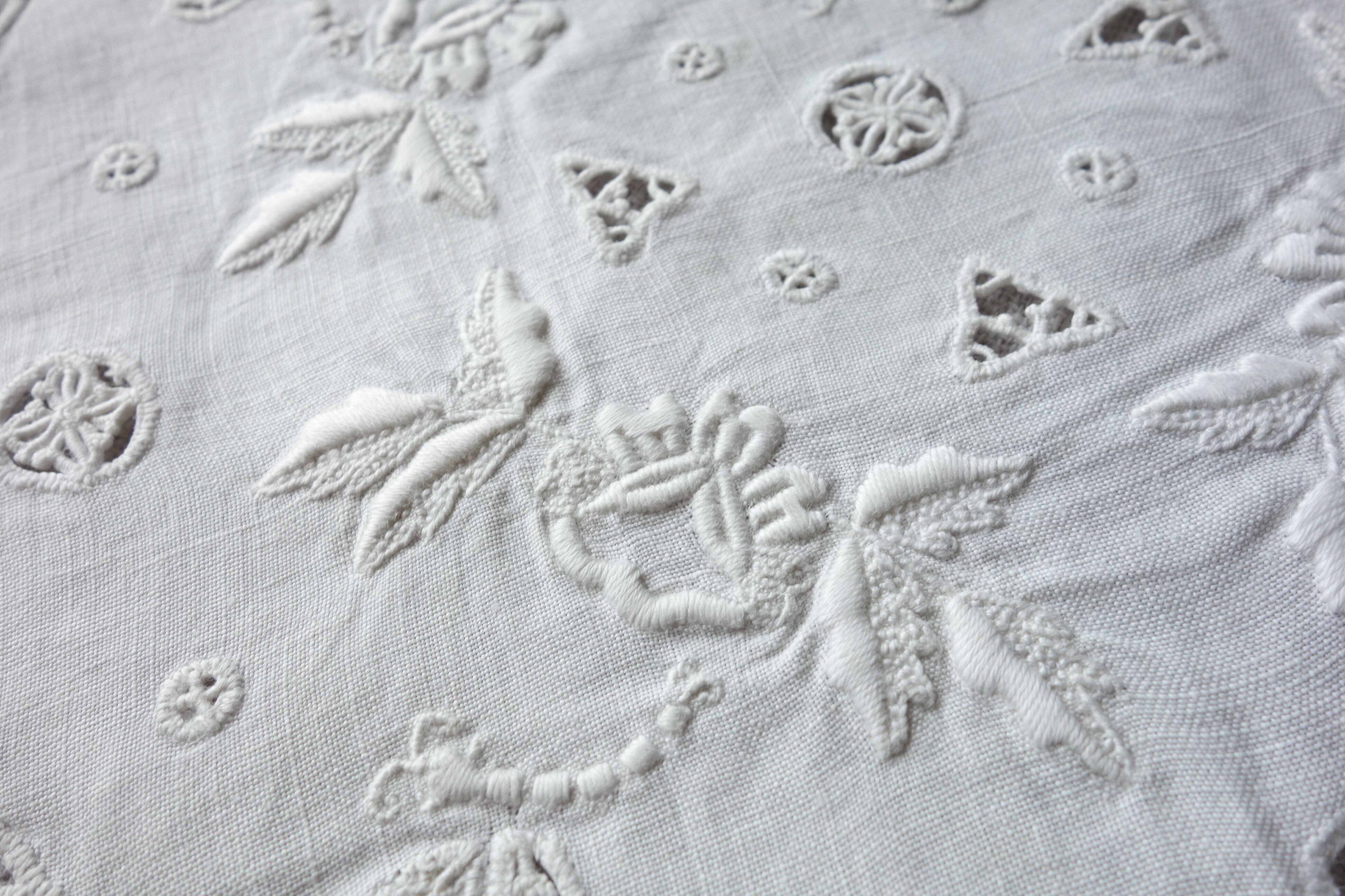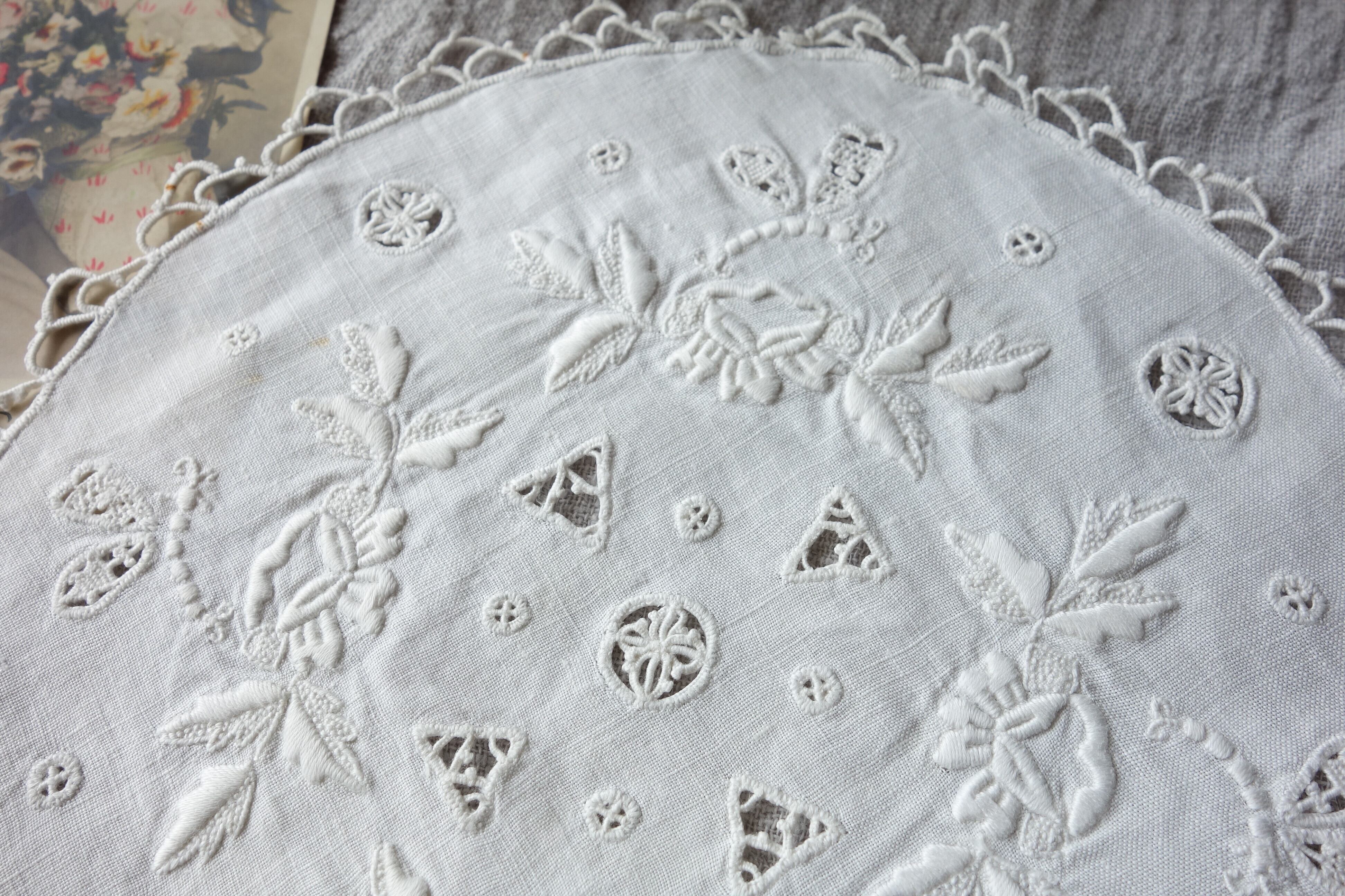 France製21㎝ アンティーク刺繍レースドイリー B483 ホワイト