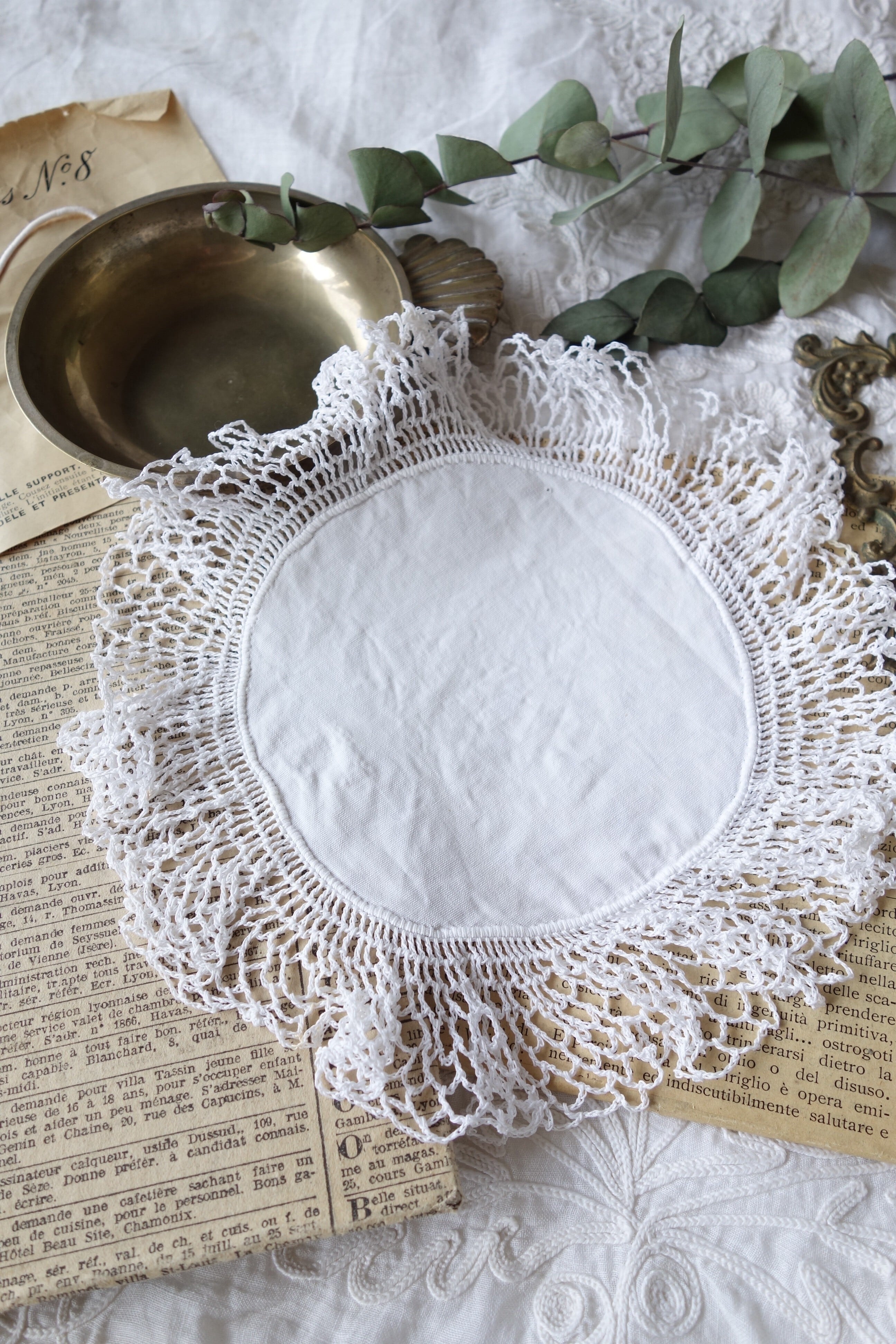 繊細なレースに装飾された丸形ドイリーです。