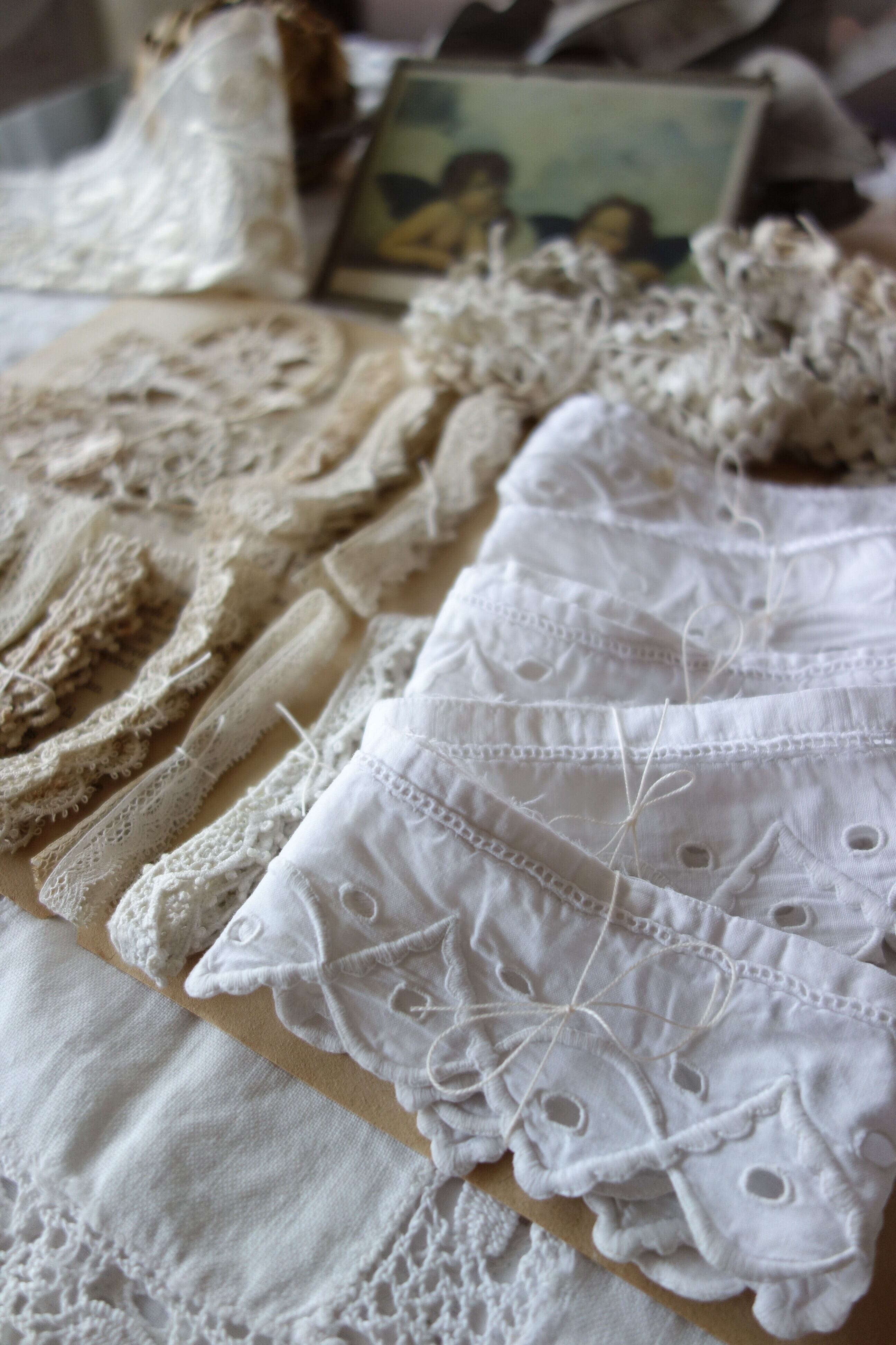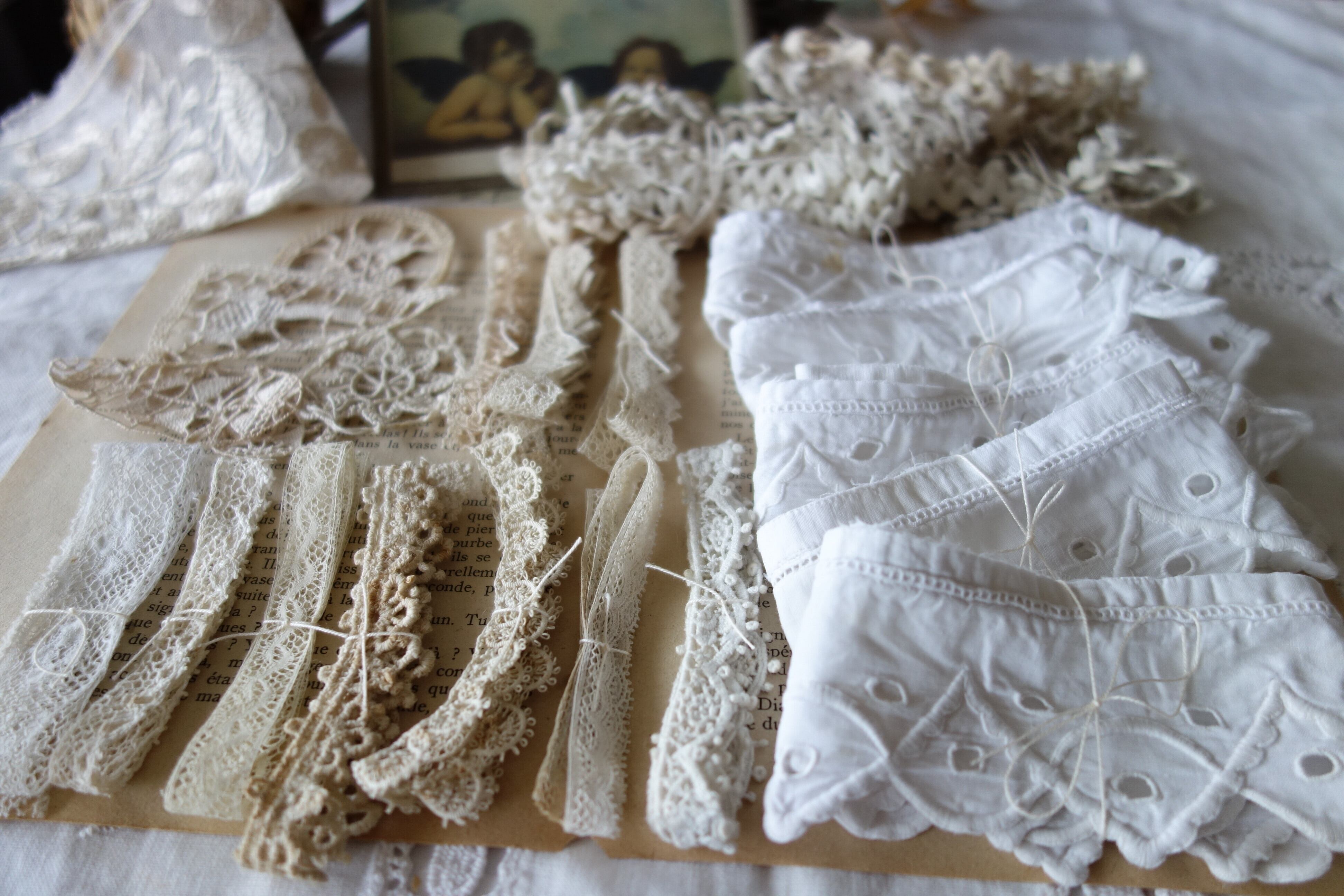 チュール、刺繍レース、4㎝程のプチモチーフなど細かいレースを少しずつセレクトしました。
