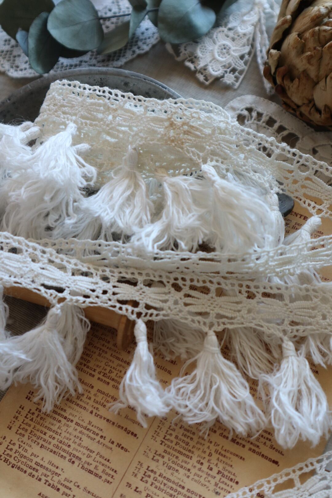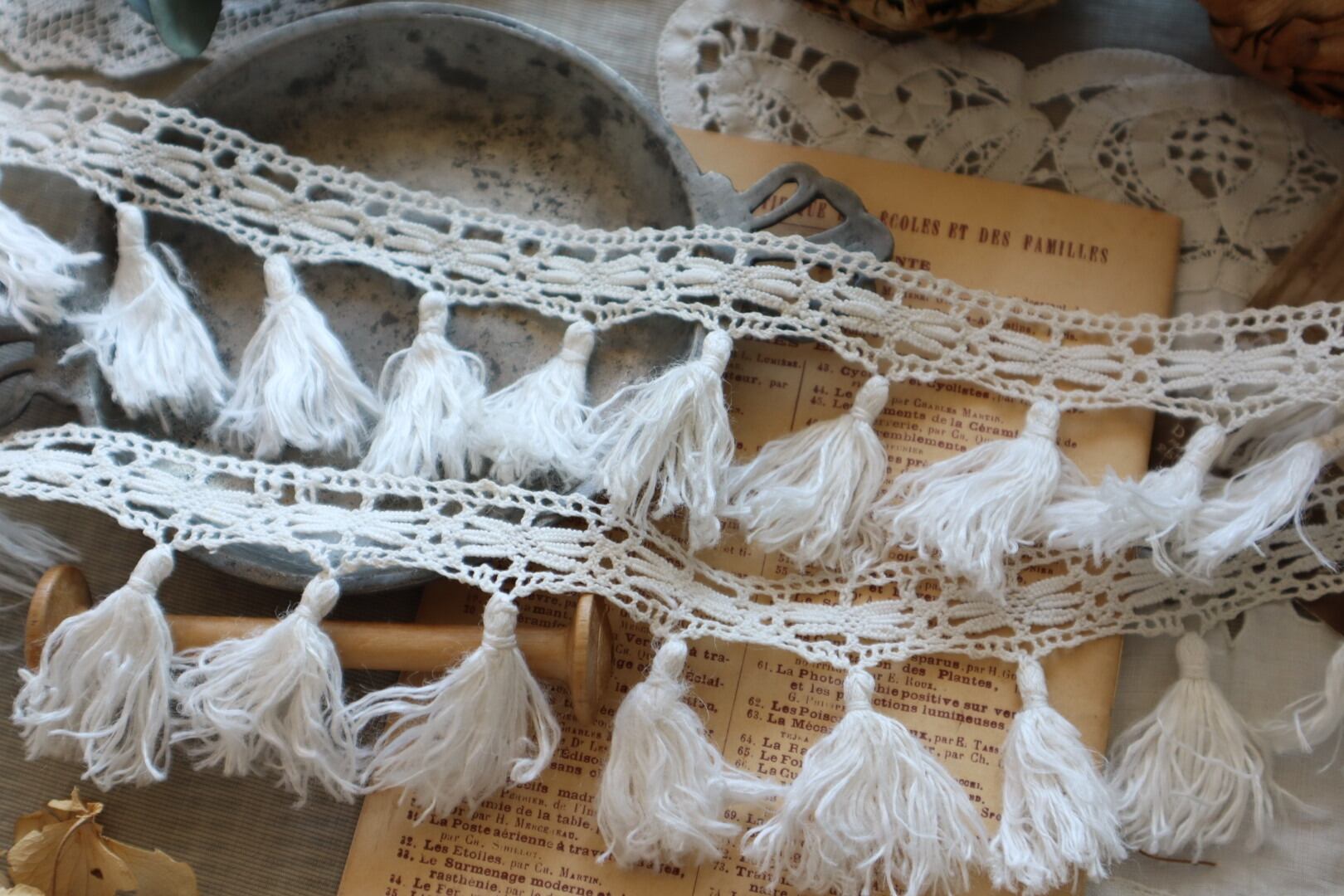 France製 30㎝ アンティークフリンジレース C655 オフホイト