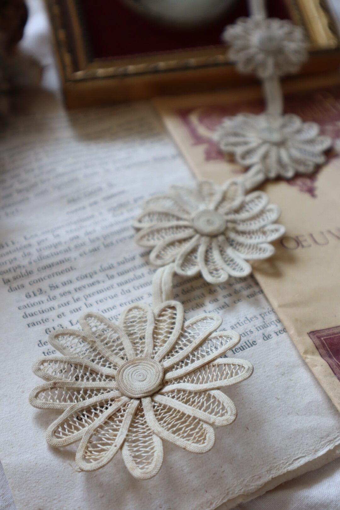 エクリュ色の細い紐と糸を使用しています。