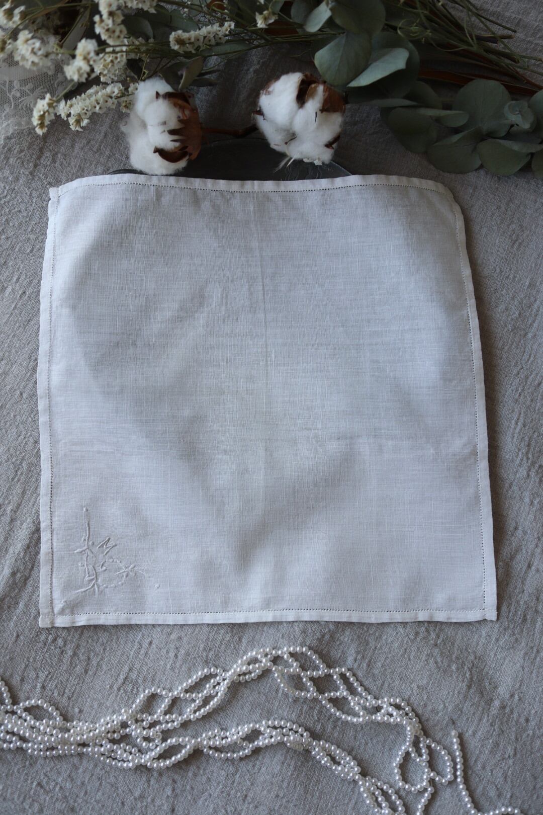 France製 アンティークイニシャル刺繍ハンカチ 「M」B547 ホワイト