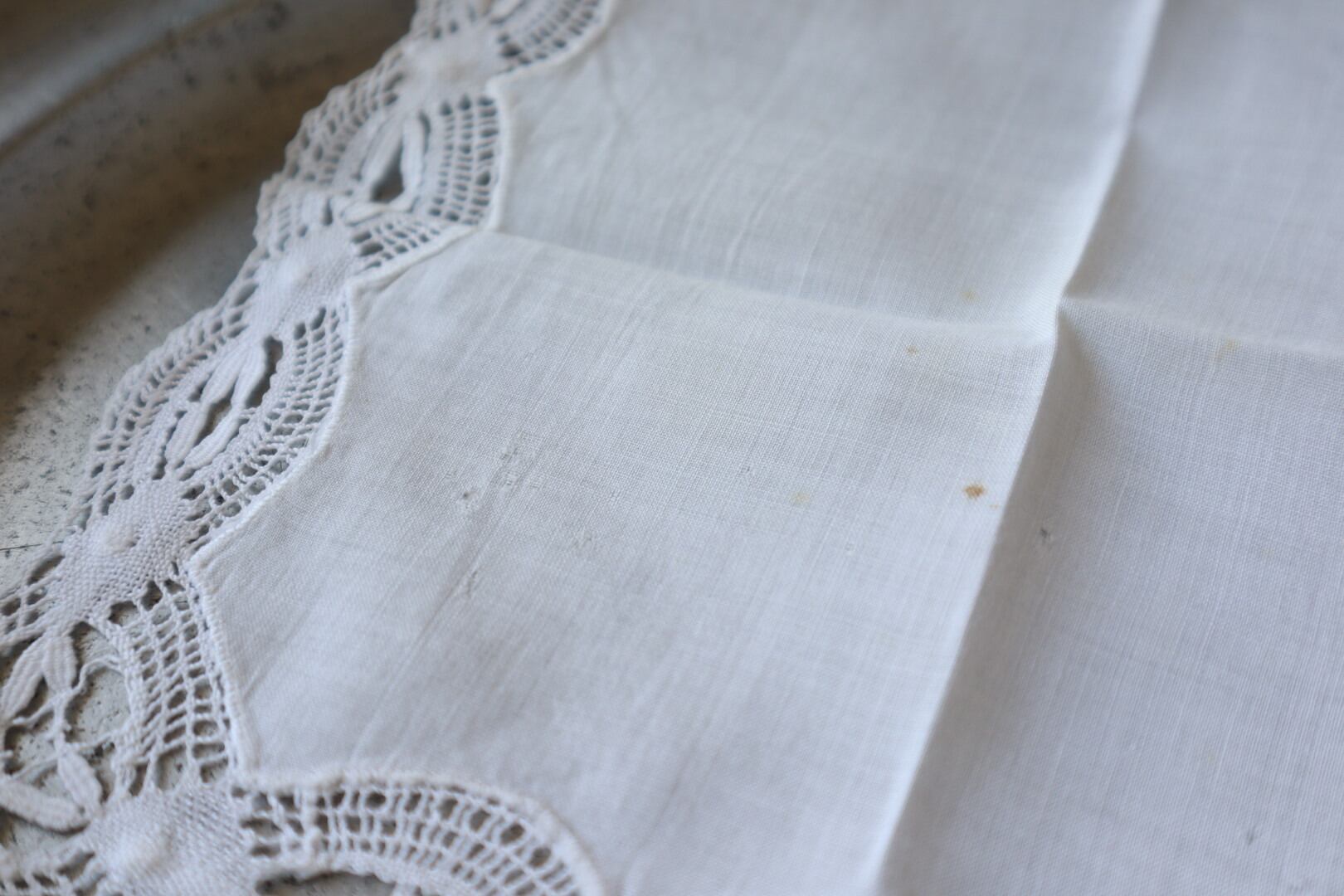 ボビンレースに囲まれたレースハンカチ