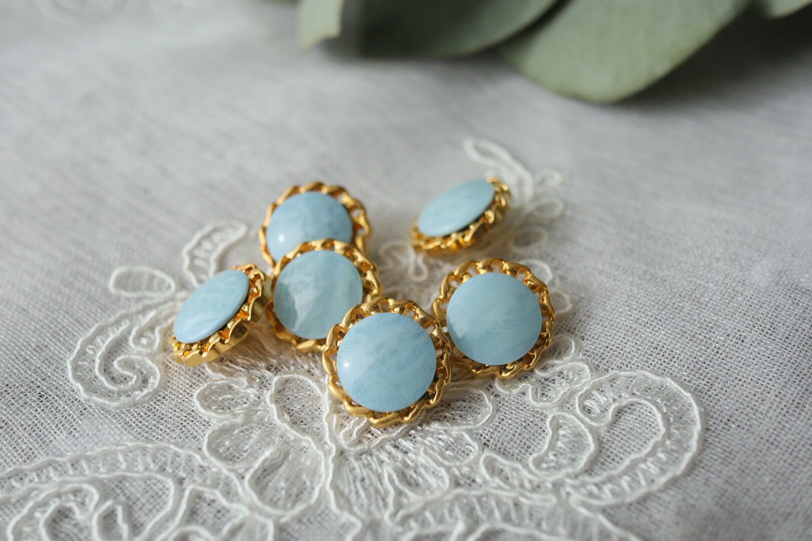ブルーのマーブル模様パーツとゴールド枠の華やかなボタンです。
