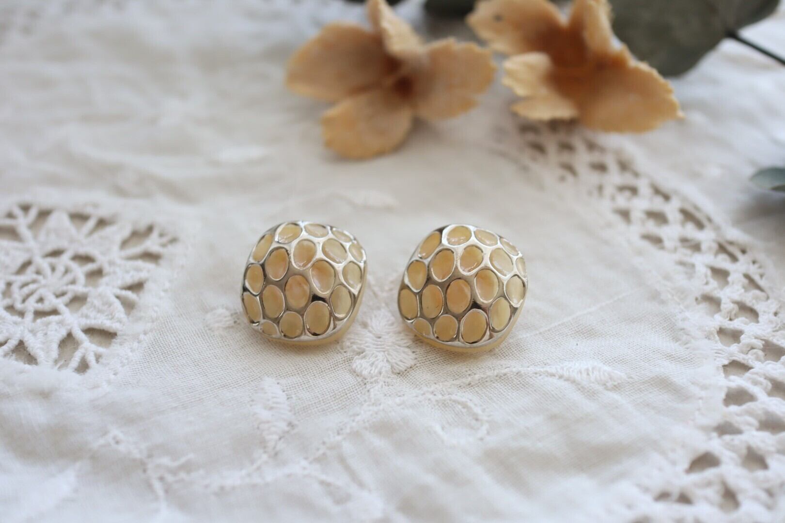 ややクリア感のあるエクリュボタンにシルバーカラーのネット模様