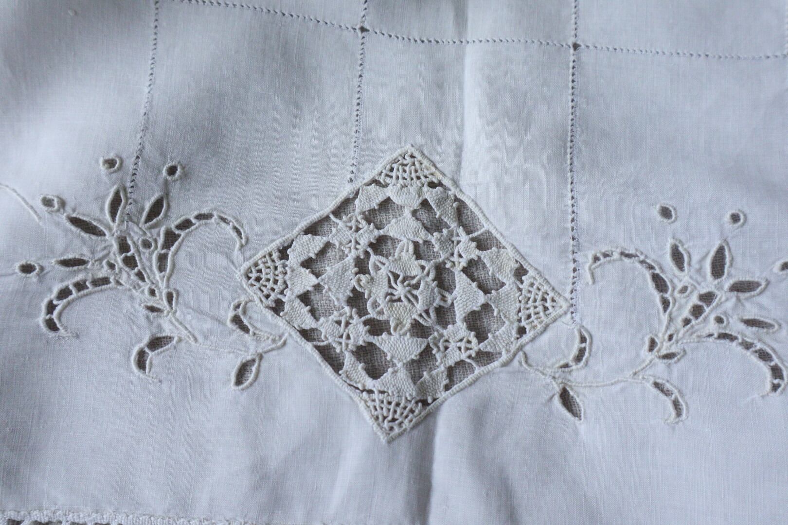 ドロンワークから流れるように施されているカットワーク刺繍が優美で素敵です。
