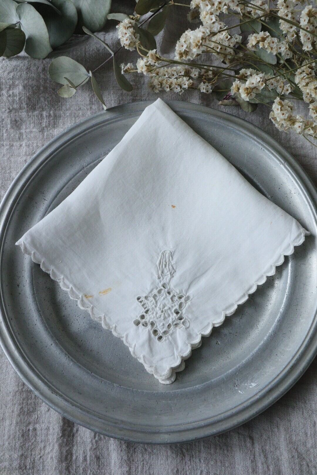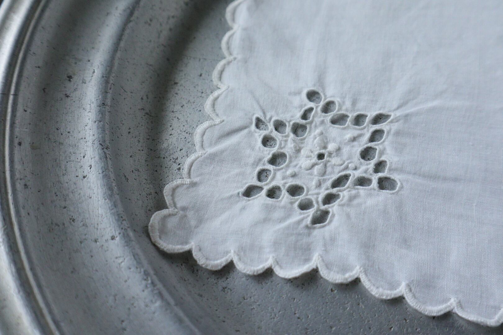 France製 29㎝ アンティーク刺繍ハンカチ B629 オフホワイト