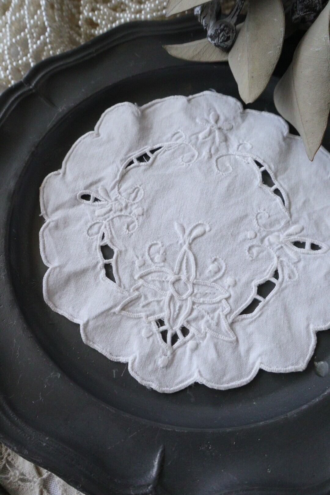 France製 14㎝ アンティーク刺繍ドイリー B667 ホワイト