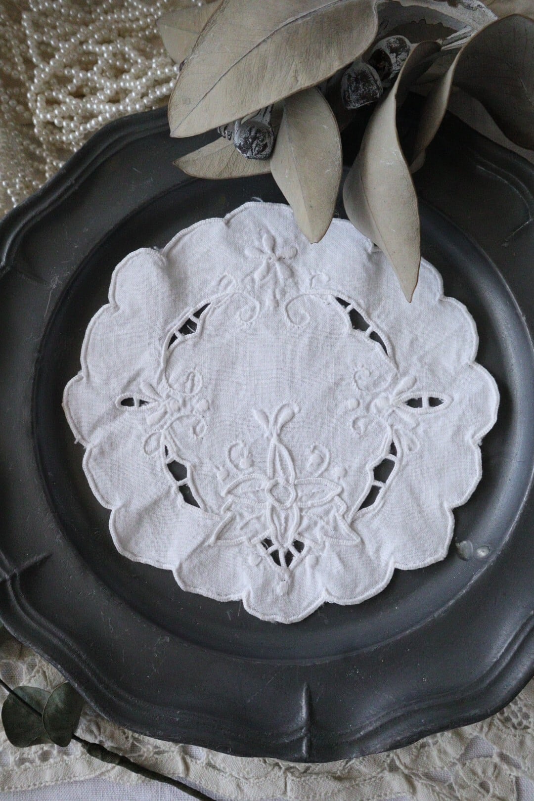ホワイトワークの美しい刺繍ドイリー