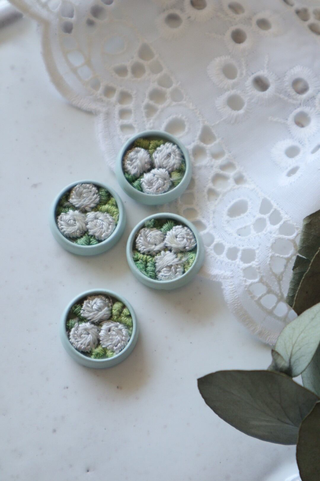 手刺繍の白いお花とリーフがモチーフになっています。