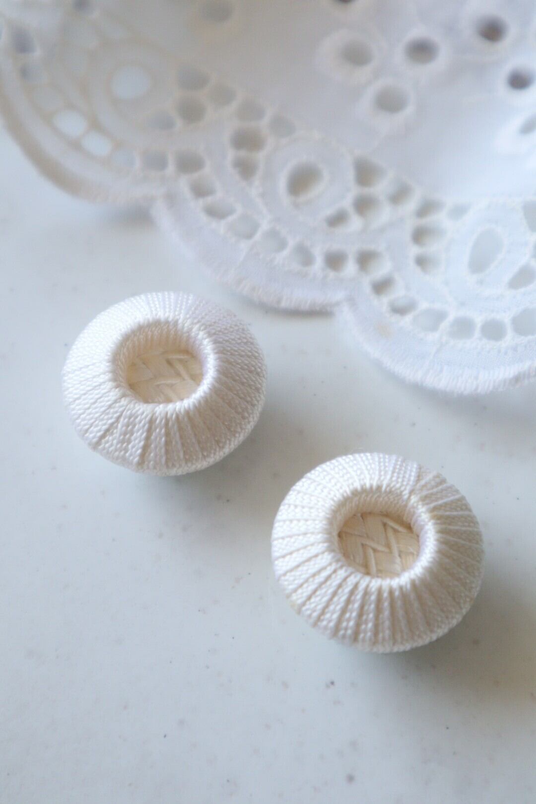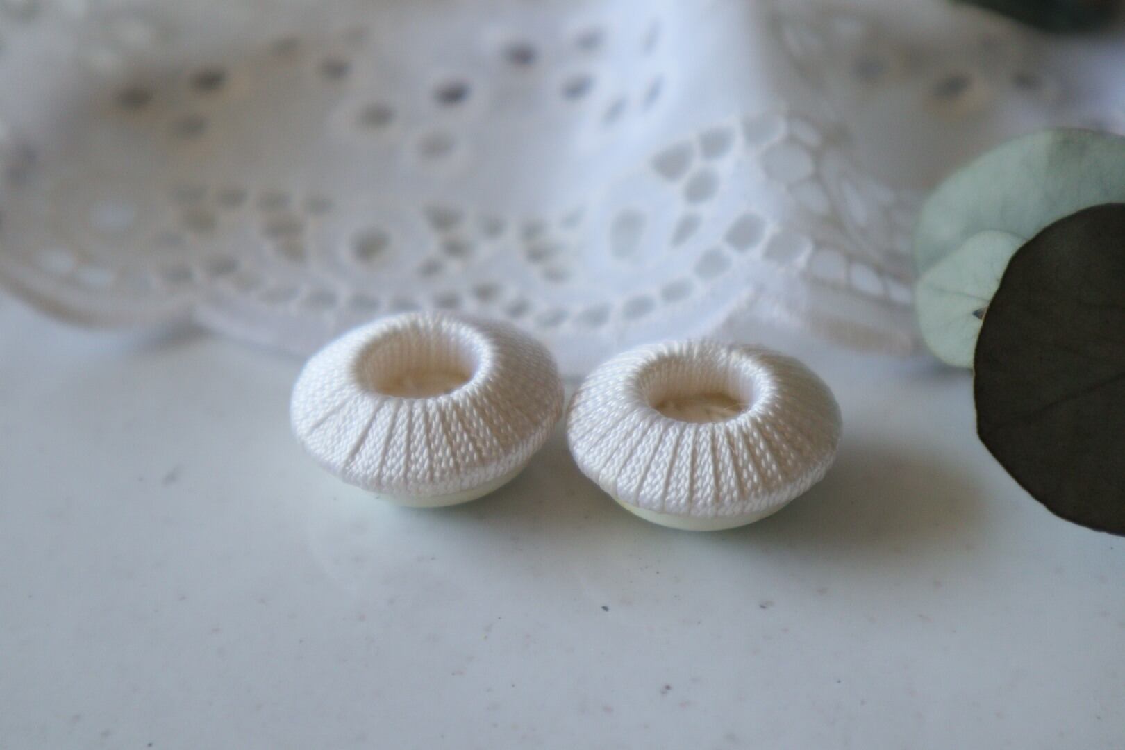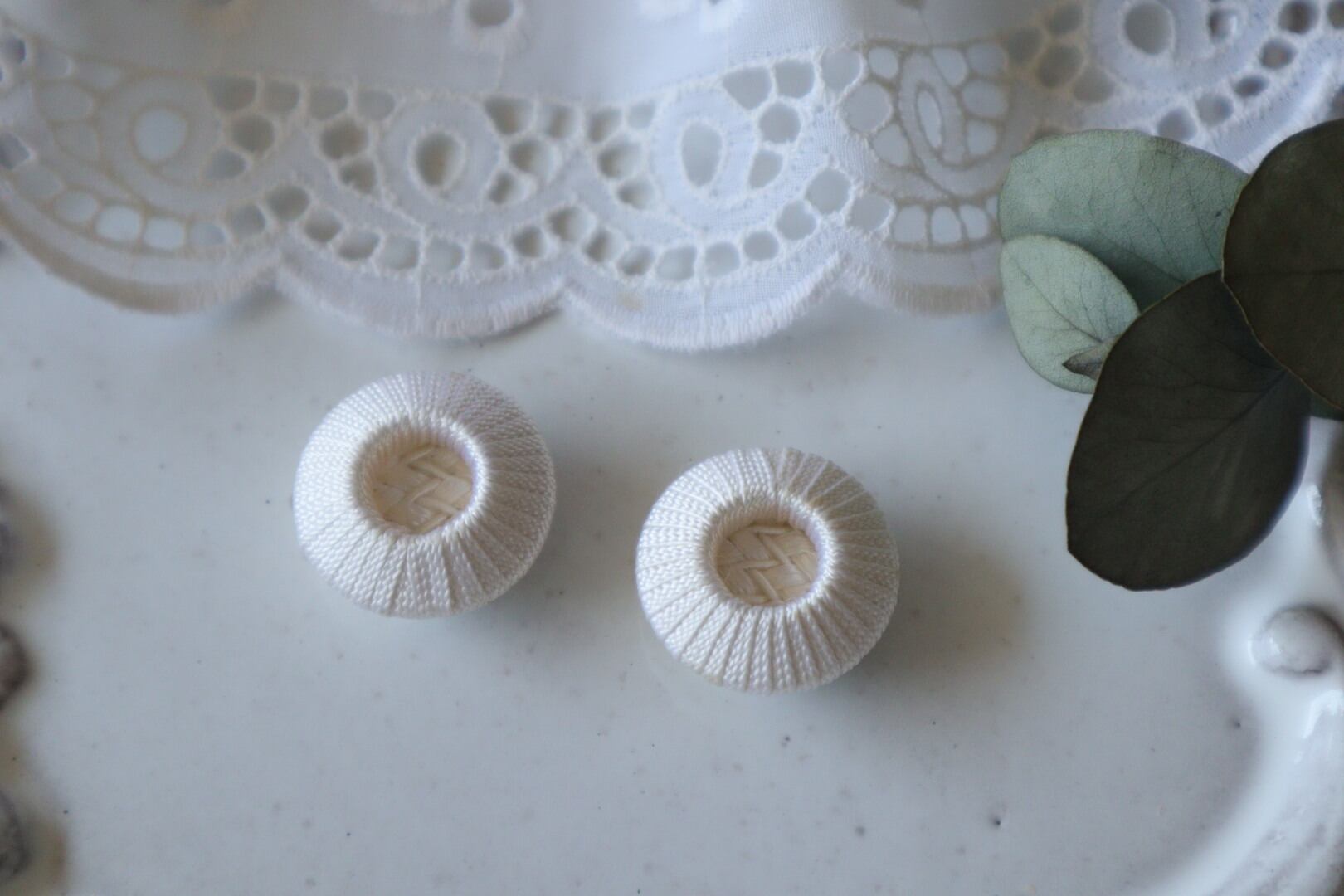 丸型のプラスティック製台座に飾られたクチュールボタン