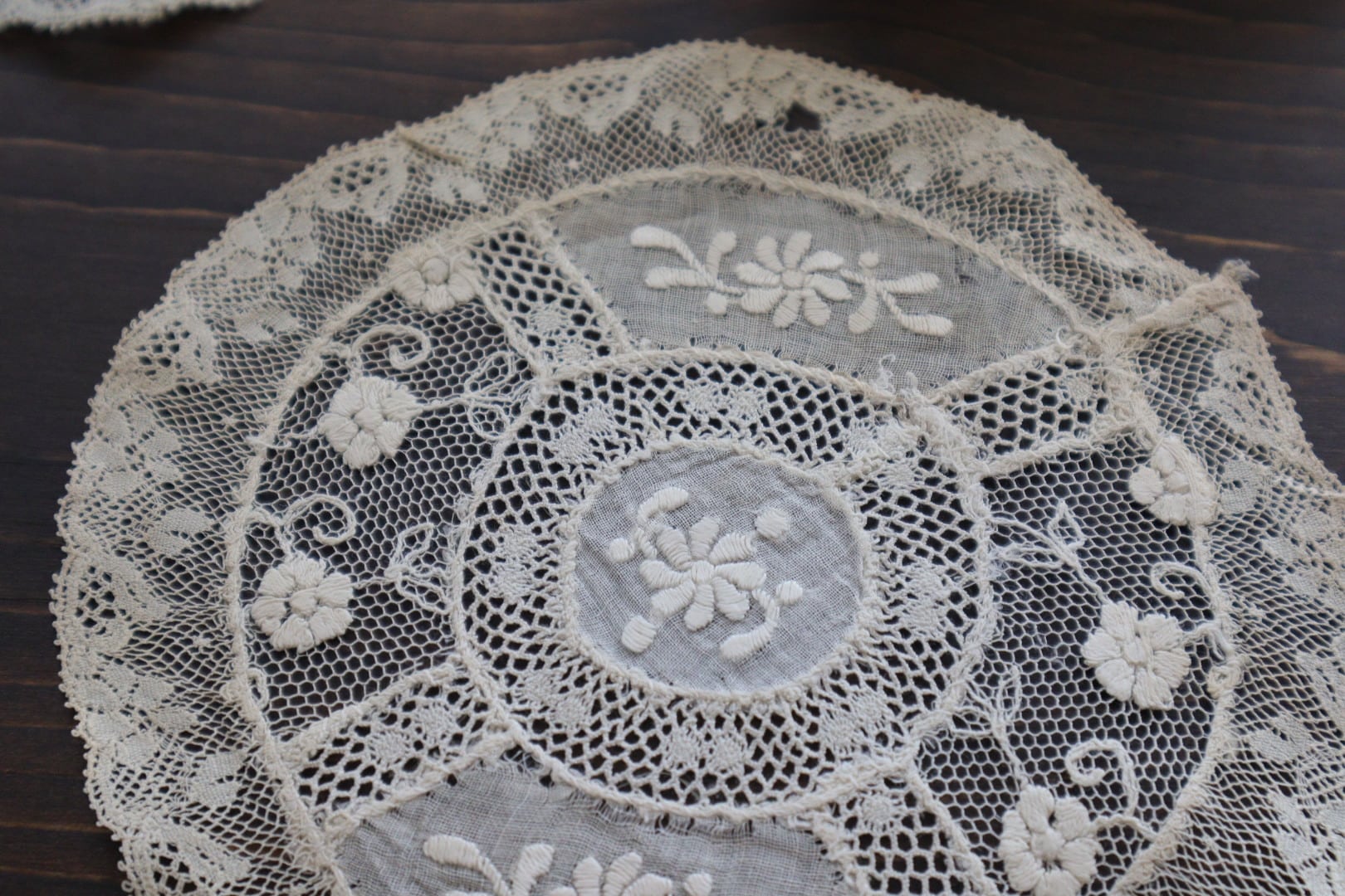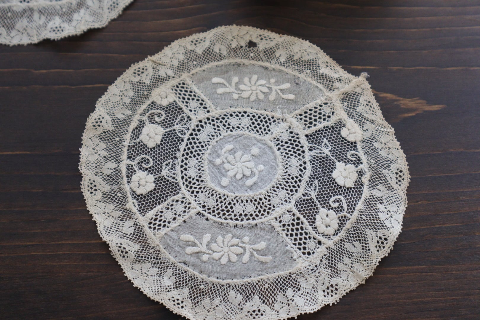 ボビンレース、手刺繍レースを組み合わせて丸型に整えたドイリーです。