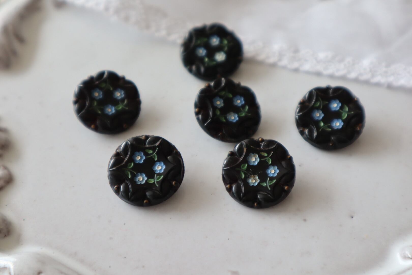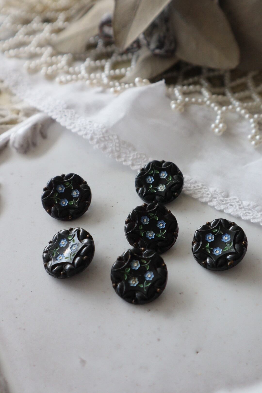 France製 18㎜ アンティーク花柄ボタン ガラス製 A1497 ブラック